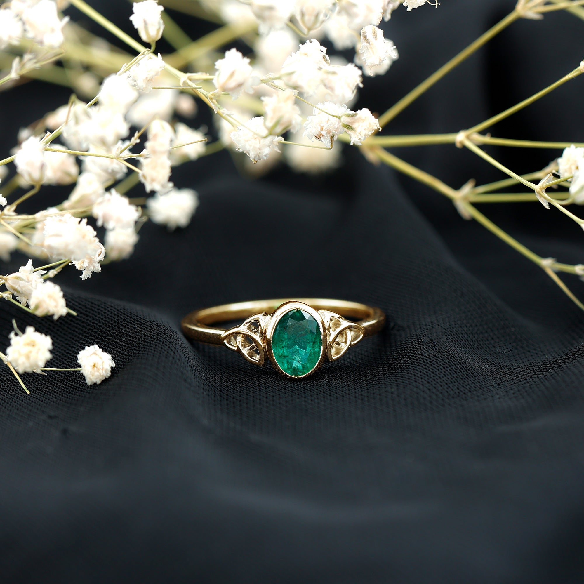 The detailed design of this Emerald Engagement Ring gives it a special charm that is timeless. In the center, there is an oval shaped emerald measuring 5X7 MM, securely set in bezel setting. On both sides of the emerald, intricate Celtic knot patterns flow along the band, adding a significant touch to the Emerald Solitaire Ring. The endless loops of the knots represent love, loyalty, and connection, making the Celtic Knot Ring a true symbol of a lasting bond. The AAA quality real emerald combines classic and modern styles beautifully. Known as the May birthstone, the emerald symbolizes new beginnings, loyalty, and everlasting love, making this Oval Engagement Ring both meaningful and stunning. Its thoughtful design ensures that this Oval Emerald Ring is special enough for a proposal while being simple enough for everyday wear. Ideal for anyone who appreciates jewelry with significance, this Celtic Design Engagement Ring merges tradition with elegance. It is a piece that narrates a story of strength, unity, and everlasting love, making it a perfect choice for someone who values symbolism, fine craftsmanship, and a style that will be cherished for years to come.