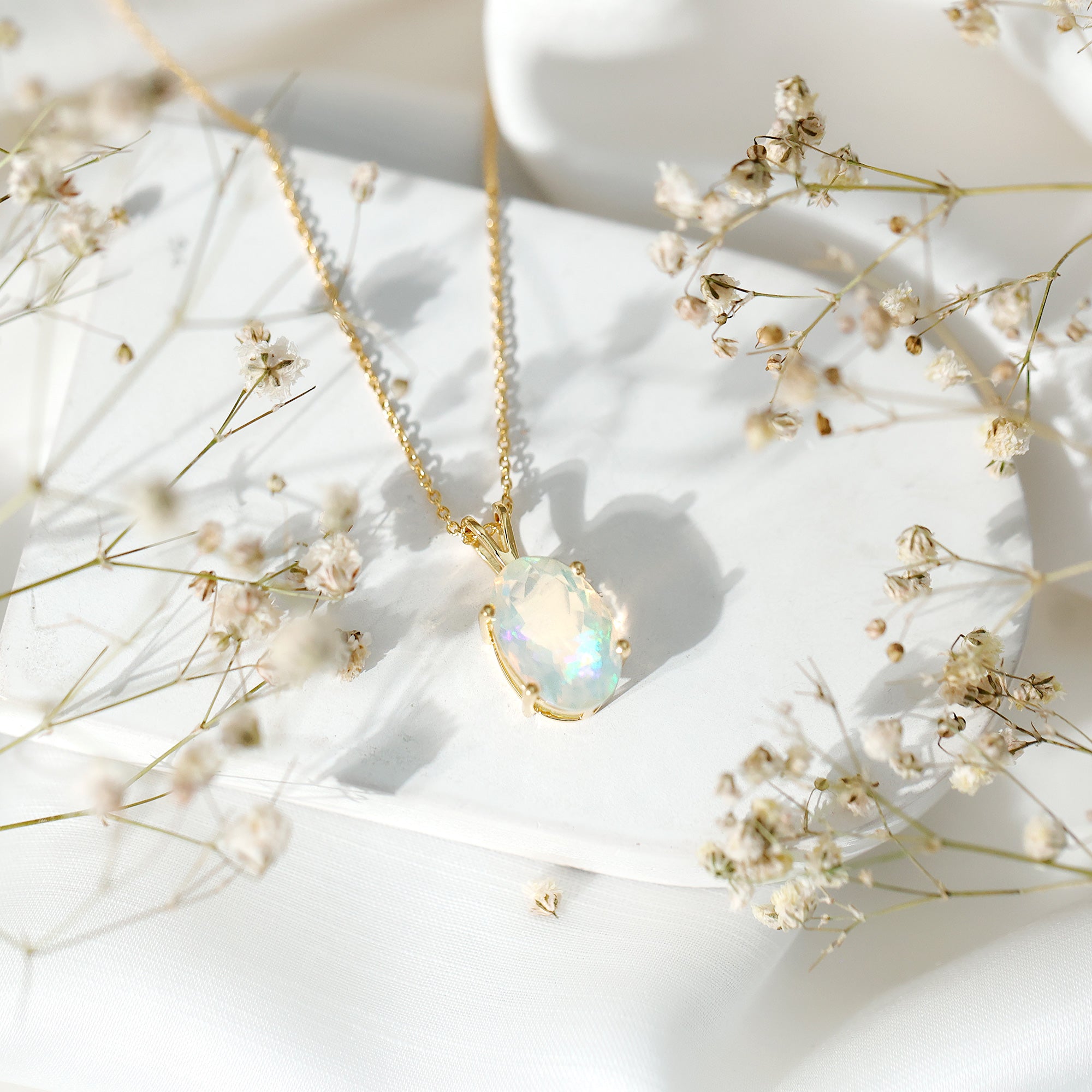 Bold, radiant, and full of enchanting color, this Ethiopian Opal Necklace is made to be seen and remembered. Handcrafted in 14K yellow gold plated silver, this eye-catching piece showcases a stunning 11X16 MM oval shaped Ethiopian opal, held securely in prong setting. Suspended from a sleek rabbit ear bail, the pendant flows effortlessly into a delicate yet sturdy chain that fastens with a lobster clasp, easy to wear and adjustable to different lengths for your ideal fit. Whether worn close to the collarbone for a chic layered look or lower for a more dramatic effect, it adapts to your style and occasion with ease. This October Birthstone Necklace is a tribute to personality, passion, and individuality. Ethiopian opals are known for symbolizing creativity and emotional depth, making this a meaningful gift for anyone born in October, or anyone who simply loves jewelry with soul and color. With its large center stone and clean, minimalist design, this Opal Solitaire Necklace brings together classic elegance and bold presence. It is perfect for dressing up an evening outfit, marking a special celebration, or gifting someone who shines a little brighter than the rest. From birthdays to anniversaries, or simply to celebrate yourself, this Oval Shaped Necklace is a radiant reminder of beauty, emotion, and timeless style, all in one unforgettable piece.
