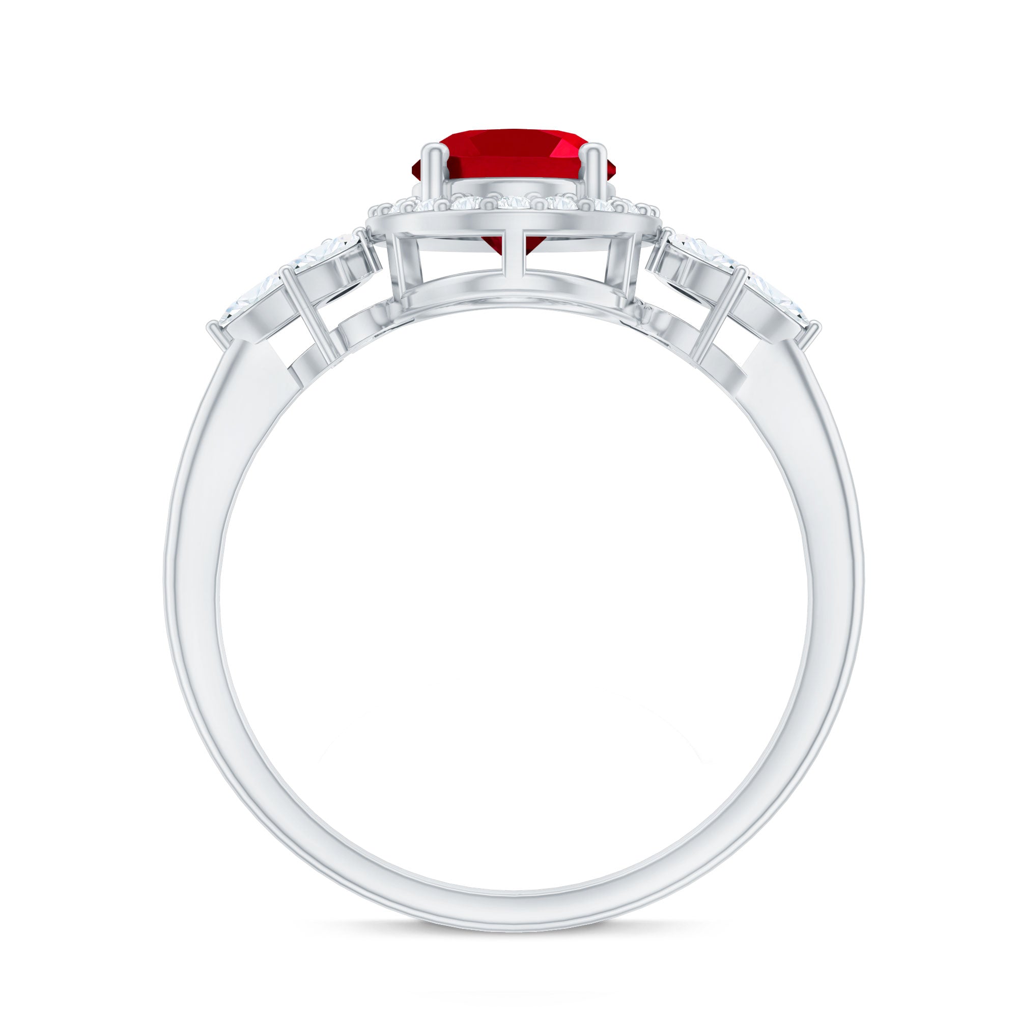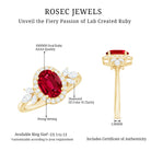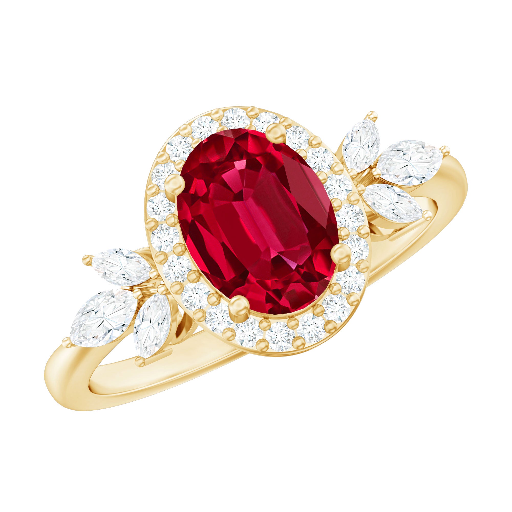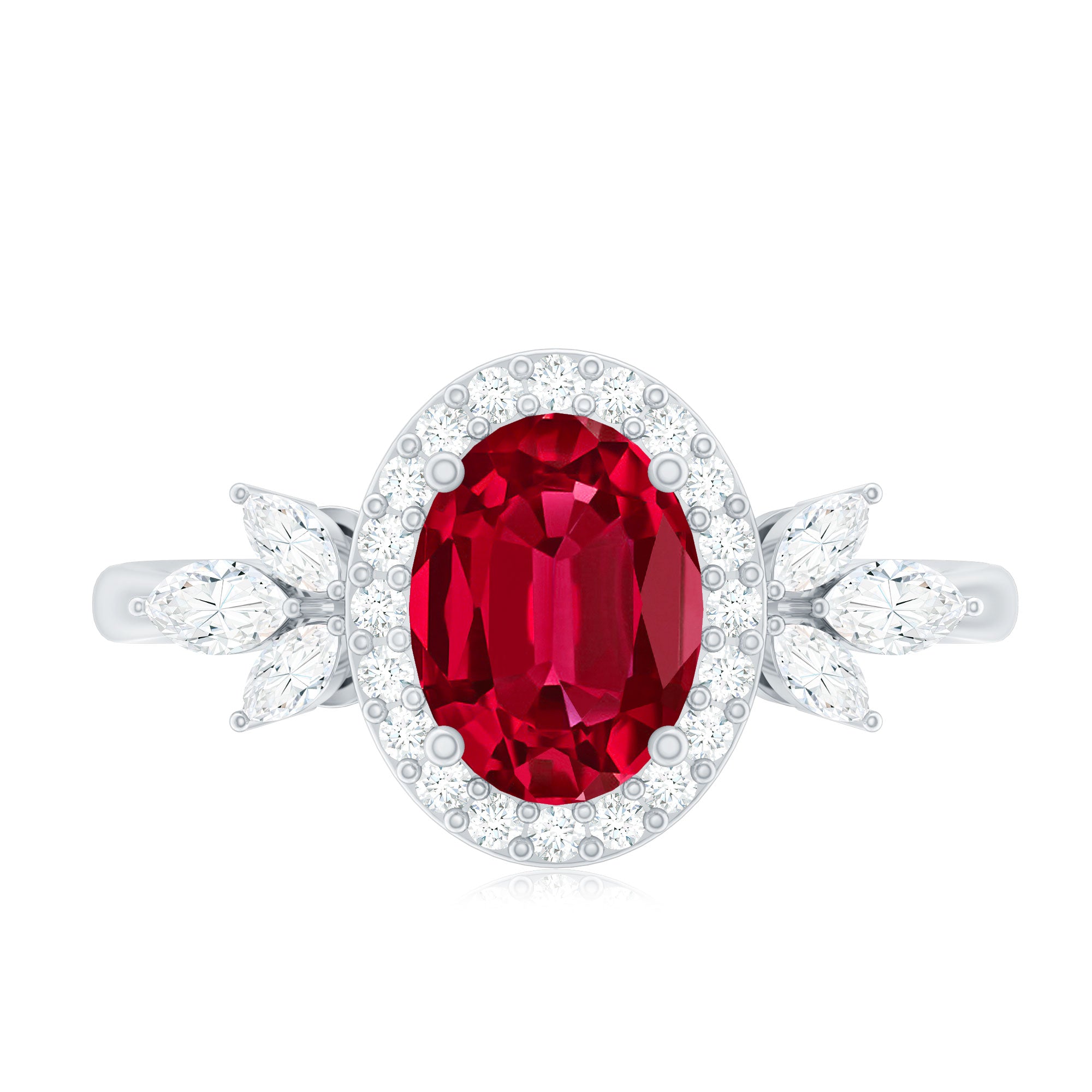Let your love story shine through with this breathtaking Lab Grown Ruby Engagement Ring, a piece that speaks of passion, grace, and timeless beauty. At its center glows a stunning 6X8 MM oval shaped lab grown ruby, held securely in prong setting. Encircling the ruby is a halo of round cut diamonds that add a radiant sparkle, while marquise cut diamonds are beautifully arranged in a delicate leaf pattern along the band. The nature-inspired design gives the Oval Halo Engagement Ring a romantic and graceful touch, as if nature itself shaped it to celebrate your love. Crafted with precision and care, the metal finish enhances its brilliance, adding just the right balance of elegance and luxury. Each detail, from the petal motif to the placement of every diamond and ruby, tells a story of devotion and artistry. Perfect for the woman who loves beauty with meaning, this Lab Grown Ruby and Diamond Ring captures the essence of love that continues to bloom. It is more than just an engagement ring, it is a reminder of every heartfelt promise and every moment that makes your love eternal.