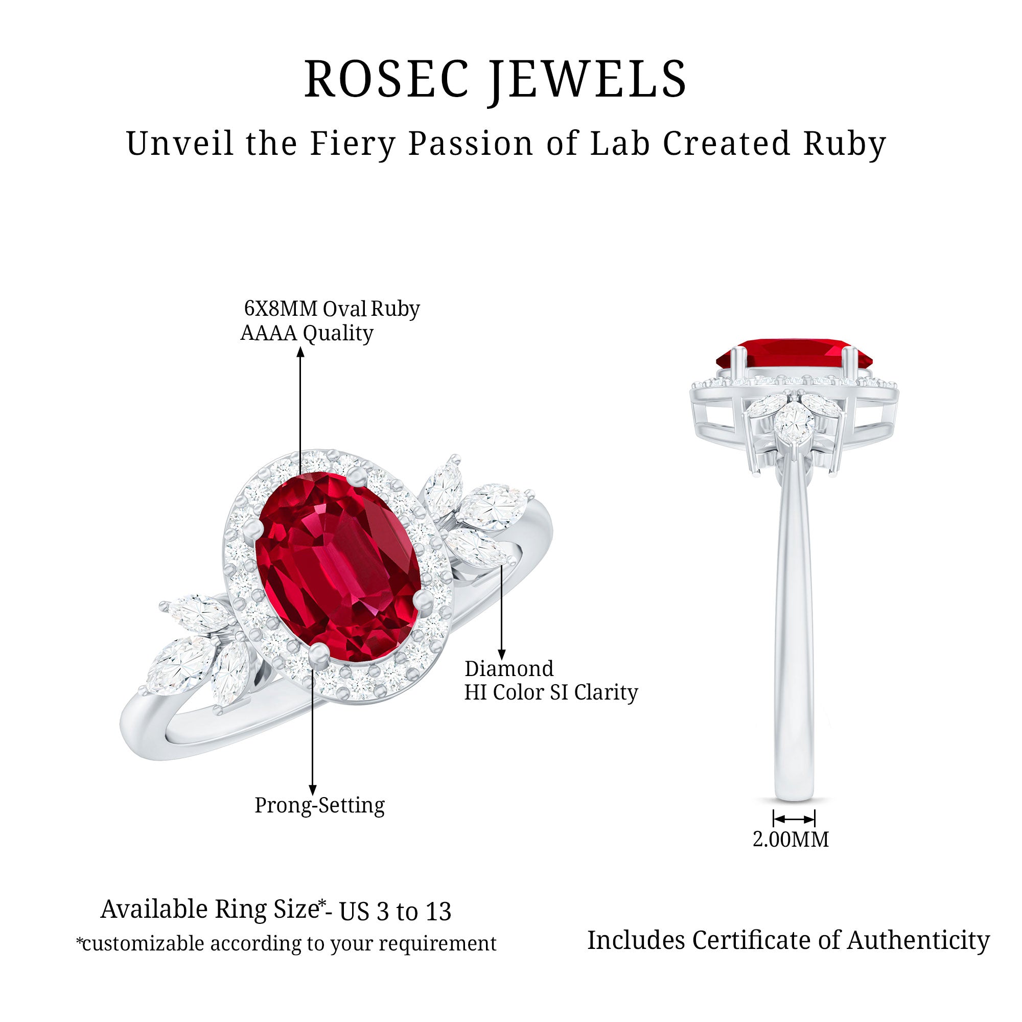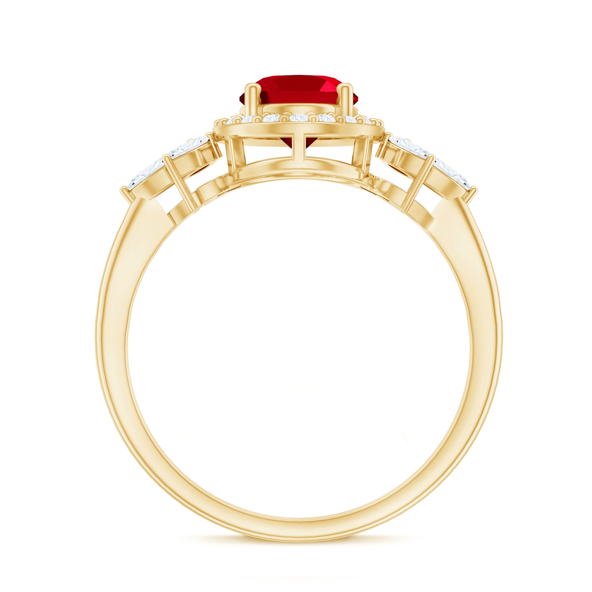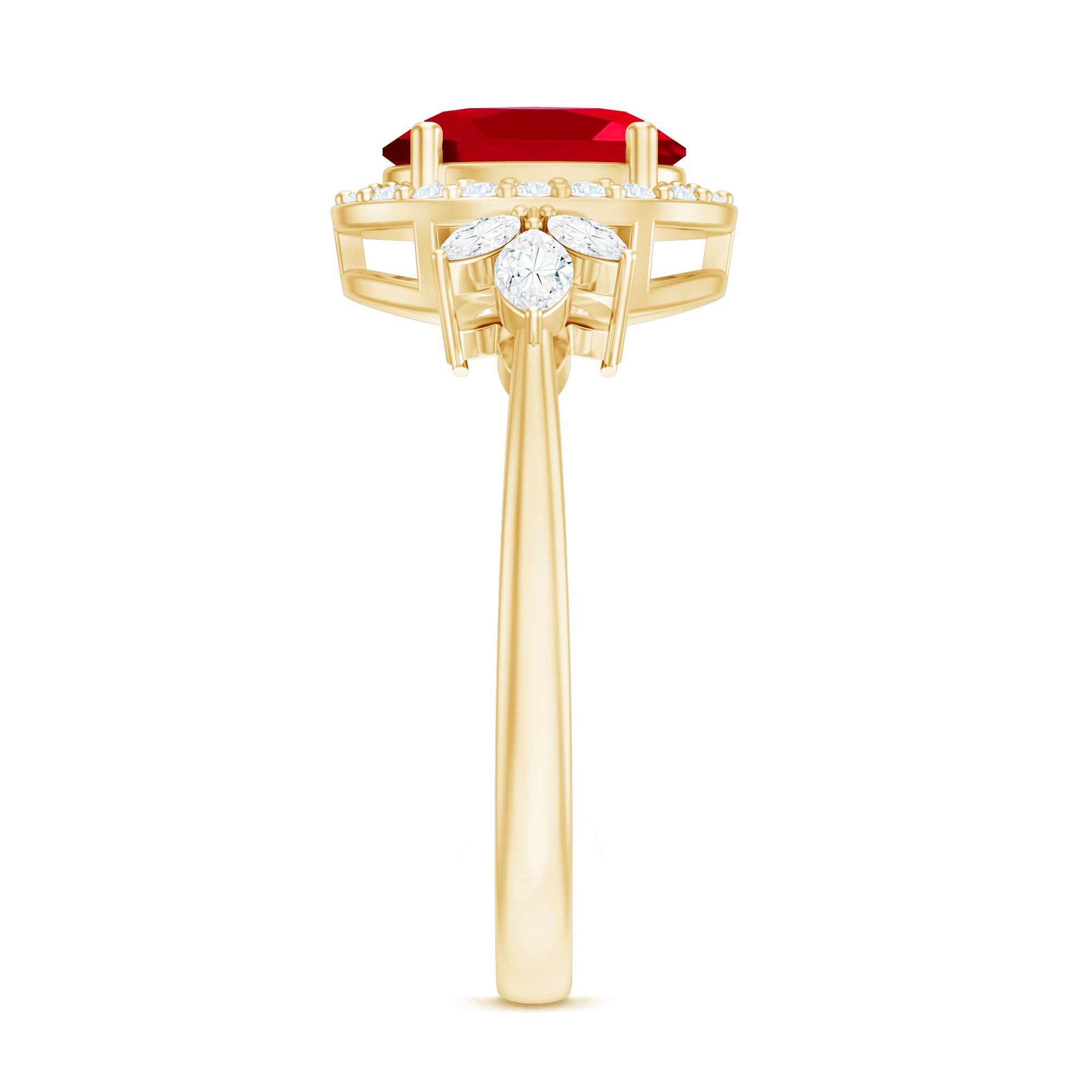 Let your love story shine through with this breathtaking Lab Grown Ruby Engagement Ring, a piece that speaks of passion, grace, and timeless beauty. At its center glows a stunning 6X8 MM oval shaped lab grown ruby, held securely in prong setting. Encircling the ruby is a halo of round cut diamonds that add a radiant sparkle, while marquise cut diamonds are beautifully arranged in a delicate leaf pattern along the band. The nature-inspired design gives the Oval Halo Engagement Ring a romantic and graceful touch, as if nature itself shaped it to celebrate your love. Crafted with precision and care, the metal finish enhances its brilliance, adding just the right balance of elegance and luxury. Each detail, from the petal motif to the placement of every diamond and ruby, tells a story of devotion and artistry. Perfect for the woman who loves beauty with meaning, this Lab Grown Ruby and Diamond Ring captures the essence of love that continues to bloom. It is more than just an engagement ring, it is a reminder of every heartfelt promise and every moment that makes your love eternal.