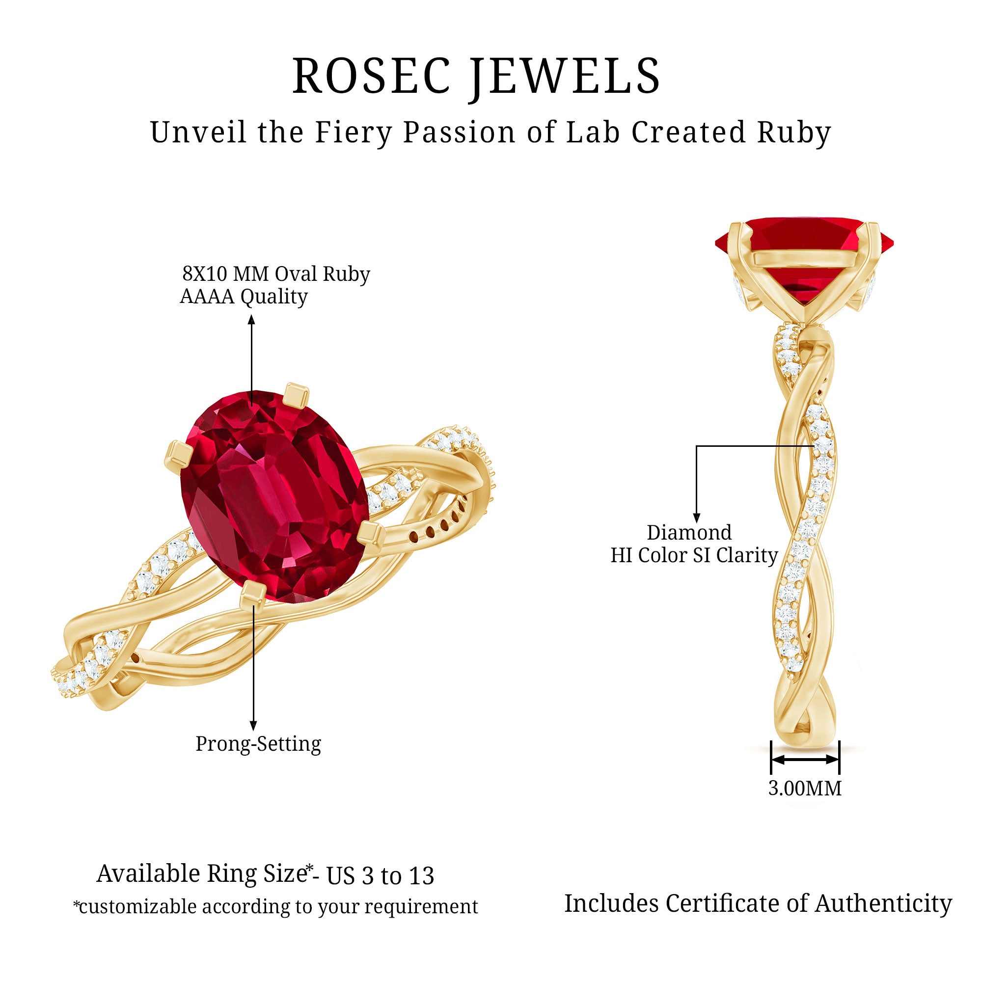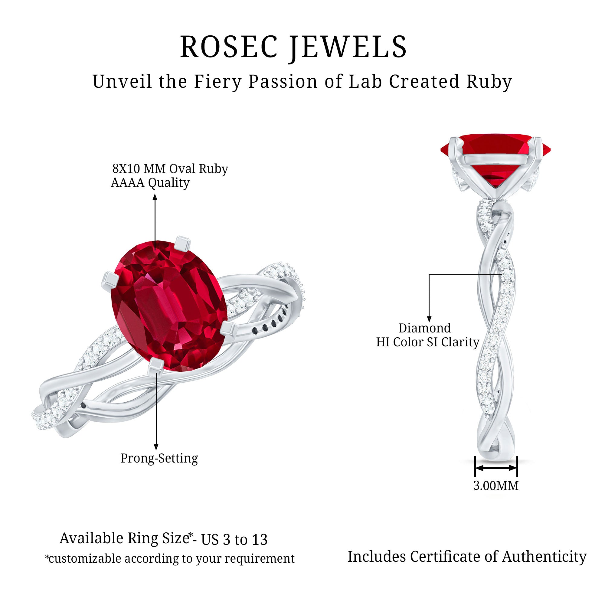 Rosec Jewels Oval Ruby Ring feels just as special as the love it is meant to celebrate. This Lab Created Ruby Engagement Ring is all about charm, meaning, and a little sparkle. Right in the center, there is a gorgeous 8X10 MM oval shaped lab grown ruby, held safely in prong setting. It is bold, beautiful, and full of heart. What makes this Ruby and Diamond Engagement Ring really stand out is the braided band, a lovely woven design that wraps around the finger like a soft hug. The braid is more than just a pretty detail, it is a sweet symbol of two lives coming together, perfectly intertwined. Tiny round diamonds are set along the band to add a bit of shimmer. And just beneath the ruby, there is a little surprise diamond, like a quiet secret sparkle meant just for you. It is thoughtful touches like this that make this Infinity Band Engagement Ring feel so personal. The mix of the ruby’s rich color, the infinity inspired braid, and the sparkle of diamonds gives it a look that is romantic and timeless. Whether you are popping the question or simply marking a beautiful moment, this Oval Shaped Engagement Ring is made to last and be loved. It comes in a wide range of sizes for the perfect fit, so it is comfy enough for everyday wear but still stunning enough for those big, unforgettable moments.