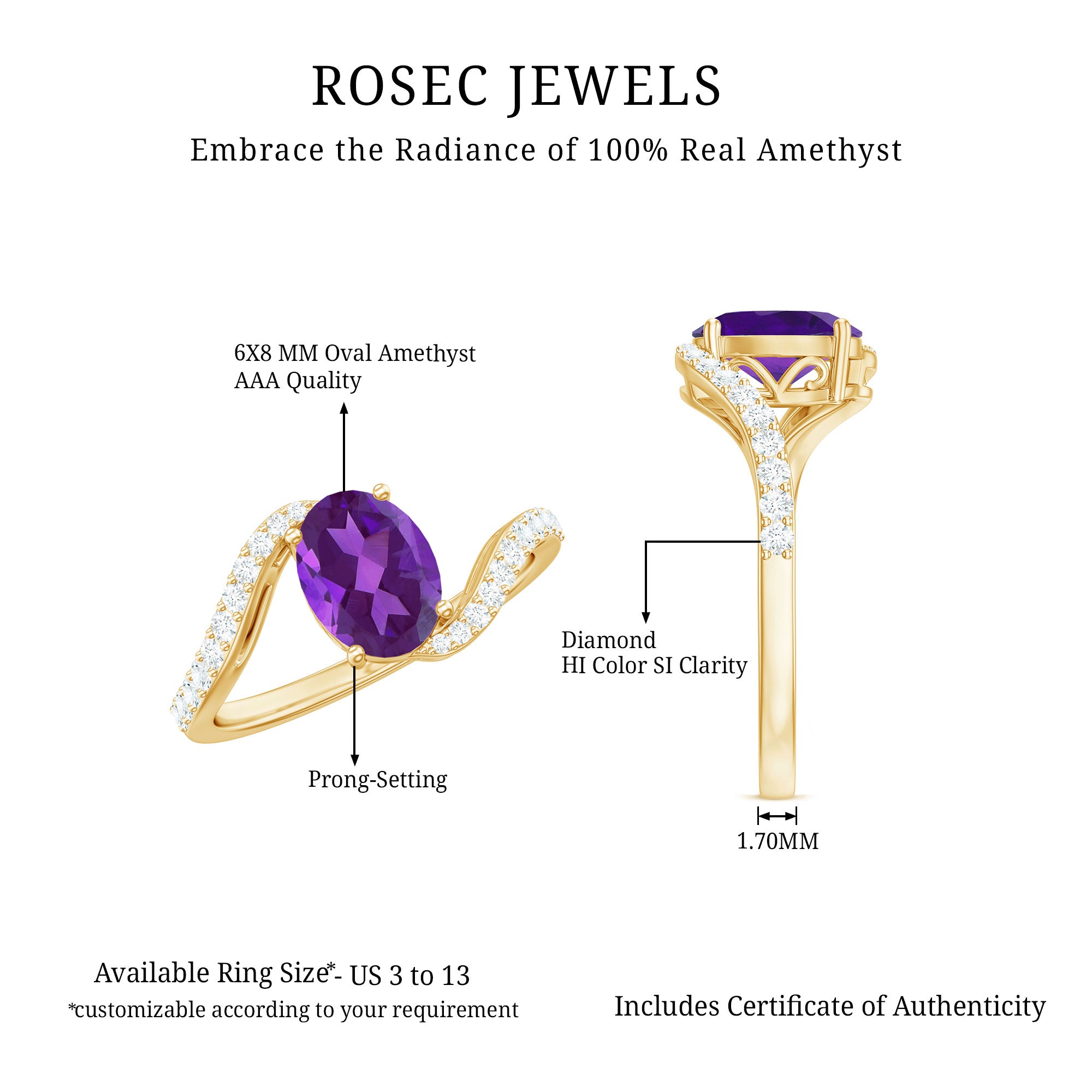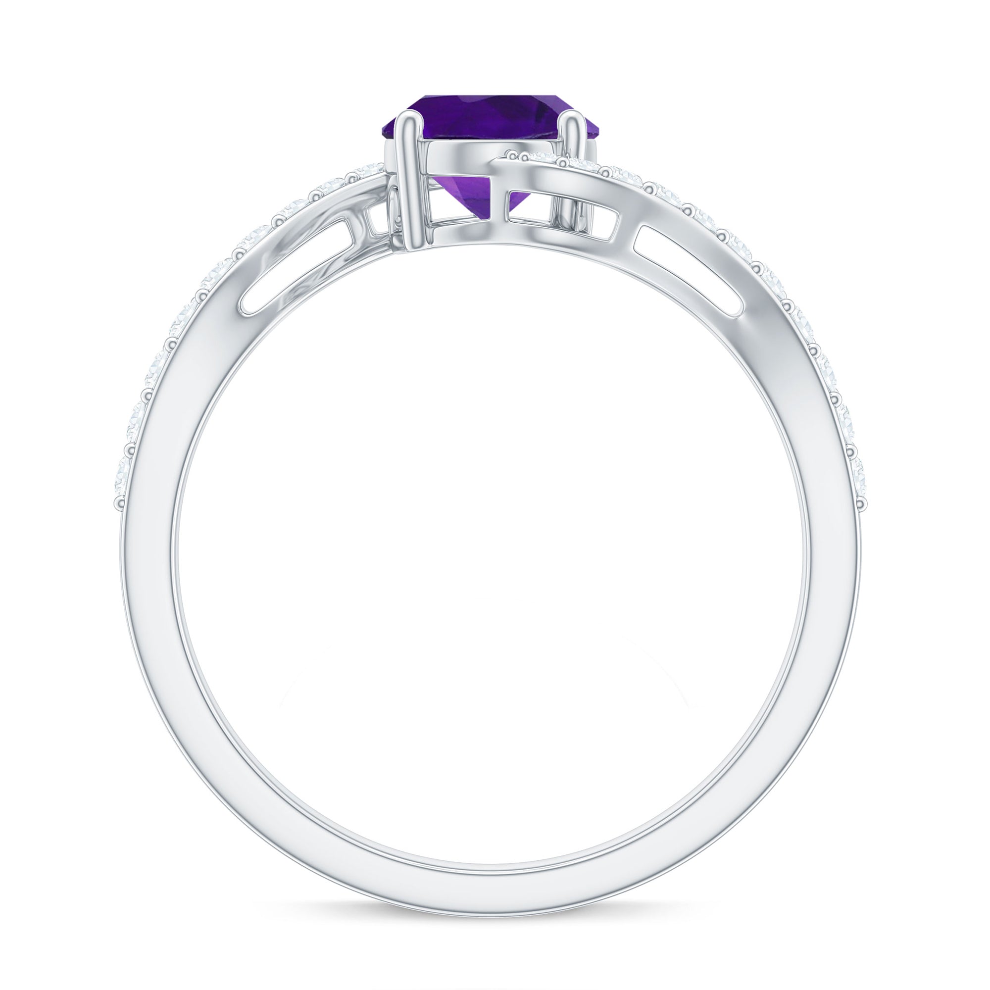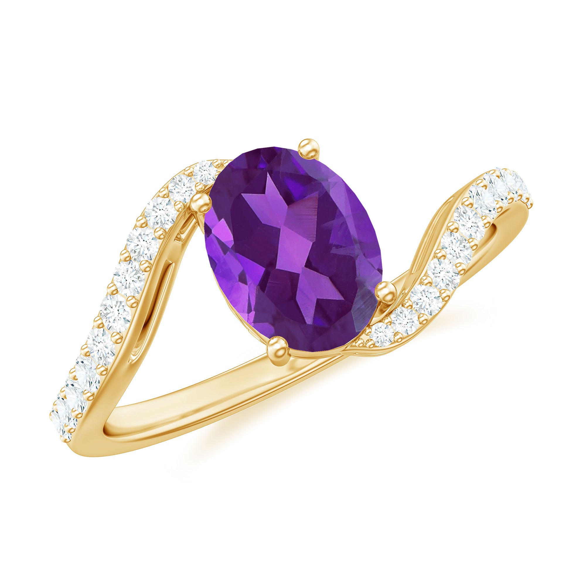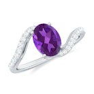 Mark your special day with this Big Solitaire Engagement Ring that features a 6X8 MM Oval Shape Amethyst gemstone set in Prong Setting over the Bypass Shank. Dazzling Diamond gemstones accentuates its unique design, creating a stunning display of elegance.