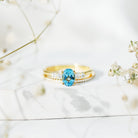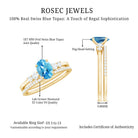 This Swiss Blue Topaz Wedding Set brings a fresh and elegant look to a timeless design. The mix of classic charm and modern style makes it a standout piece. Made from yellow gold plated sterling silver, this Engagement Ring with Wedding Band Set includes both an engagement ring and a matching wedding band. At the center of the engagement ring is a stunning 5X7 MM oval cut Swiss Blue Topaz, set in secure prong setting. Small round cut lab grown diamonds are set along the shank of the engagement ring, adding gentle sparkle that complements the center stone. The matching wedding band also features round brilliant cut lab diamonds, perfectly lining up with the engagement ring for a clean, finished look when worn together. This Oval Bridal Ring Set is ideal for someone who loves classic styles with a fresh twist. It is simple, yet full of thoughtful detail. The design is light and graceful, offering a mix of tradition and a touch of glamour. Perfect for engagements, weddings, or even anniversaries, this Swiss Blue Topaz Engagement Ring Set tells a love story with elegance and care. It arrives in a signature jewelry box, ready to be gifted or treasured for years to come.