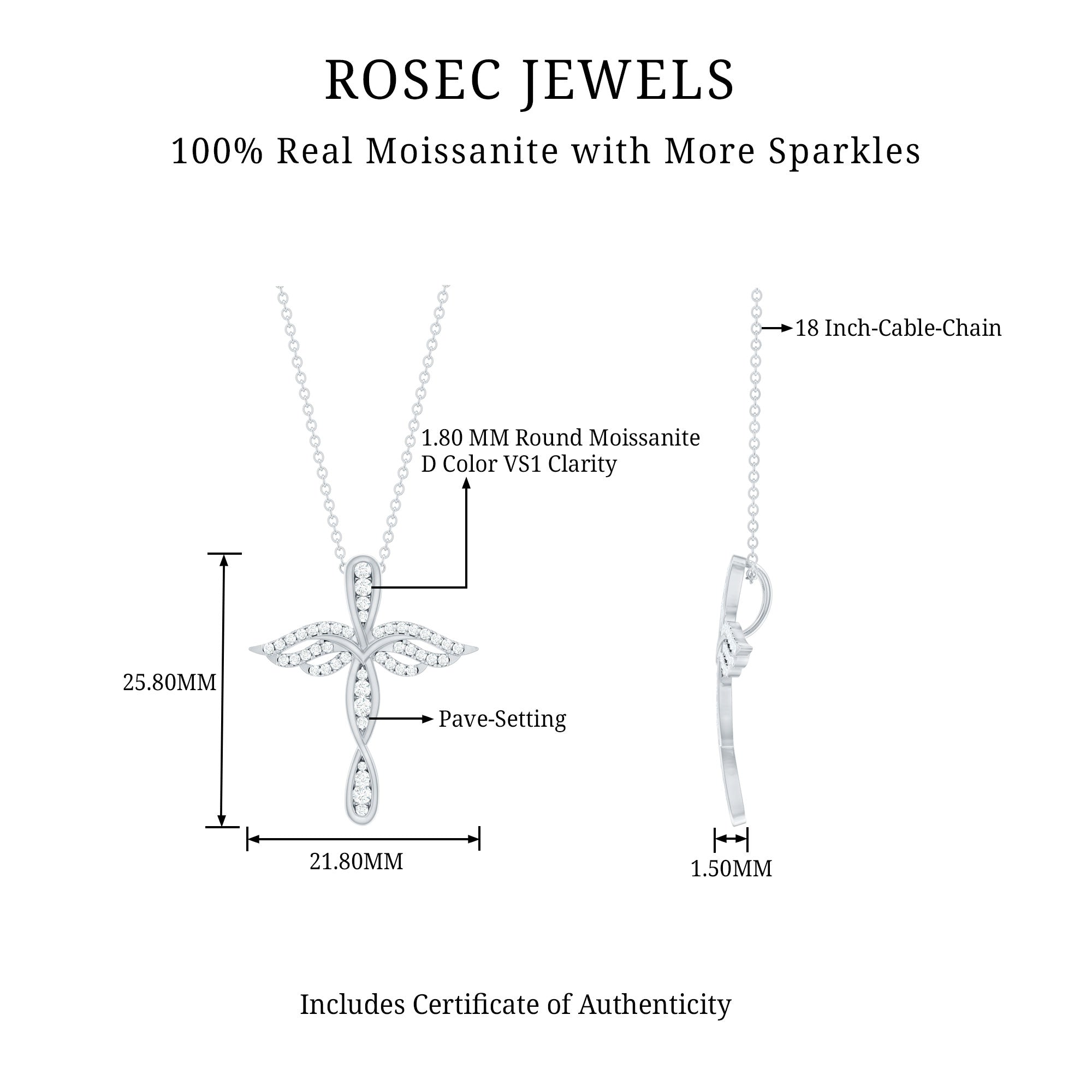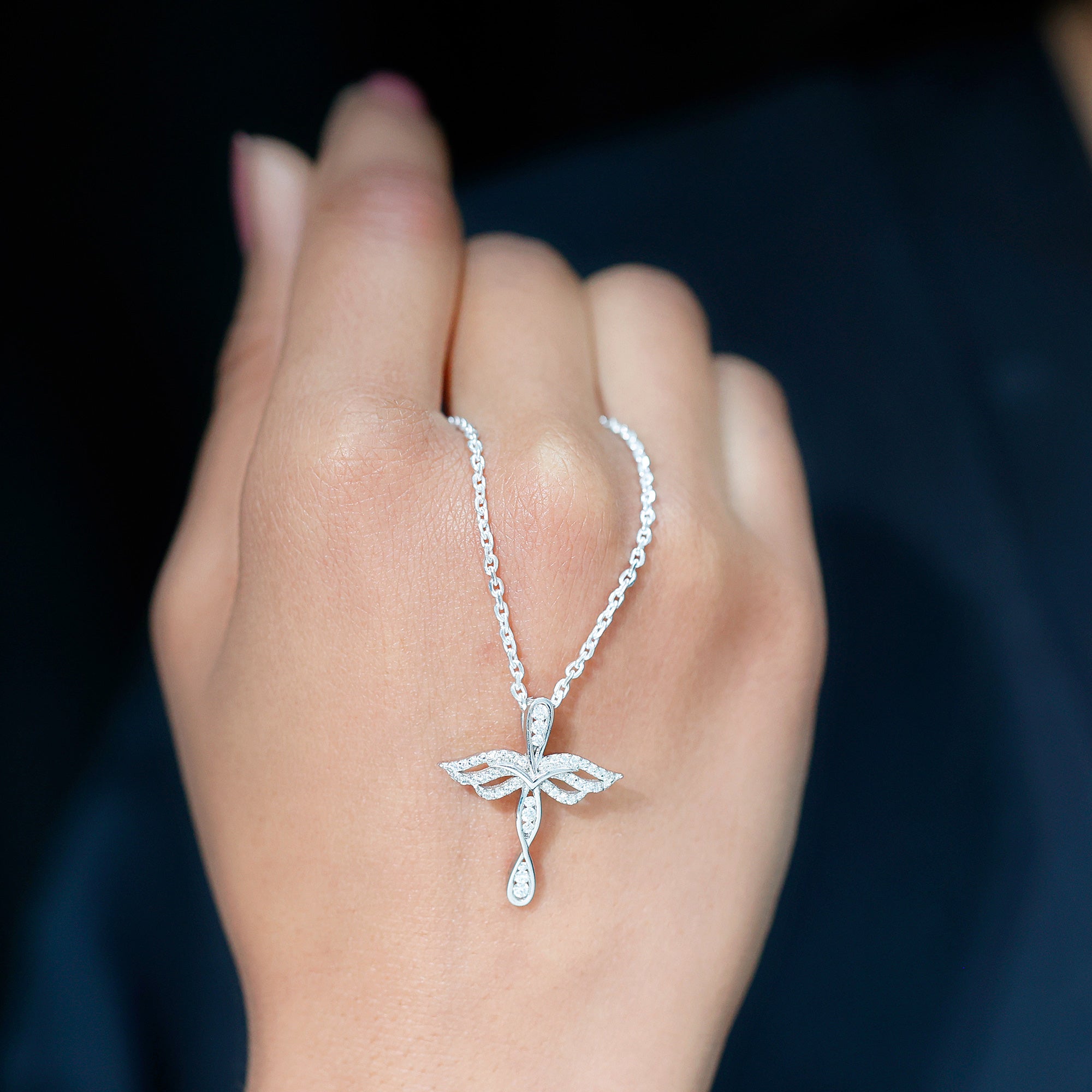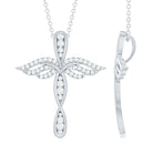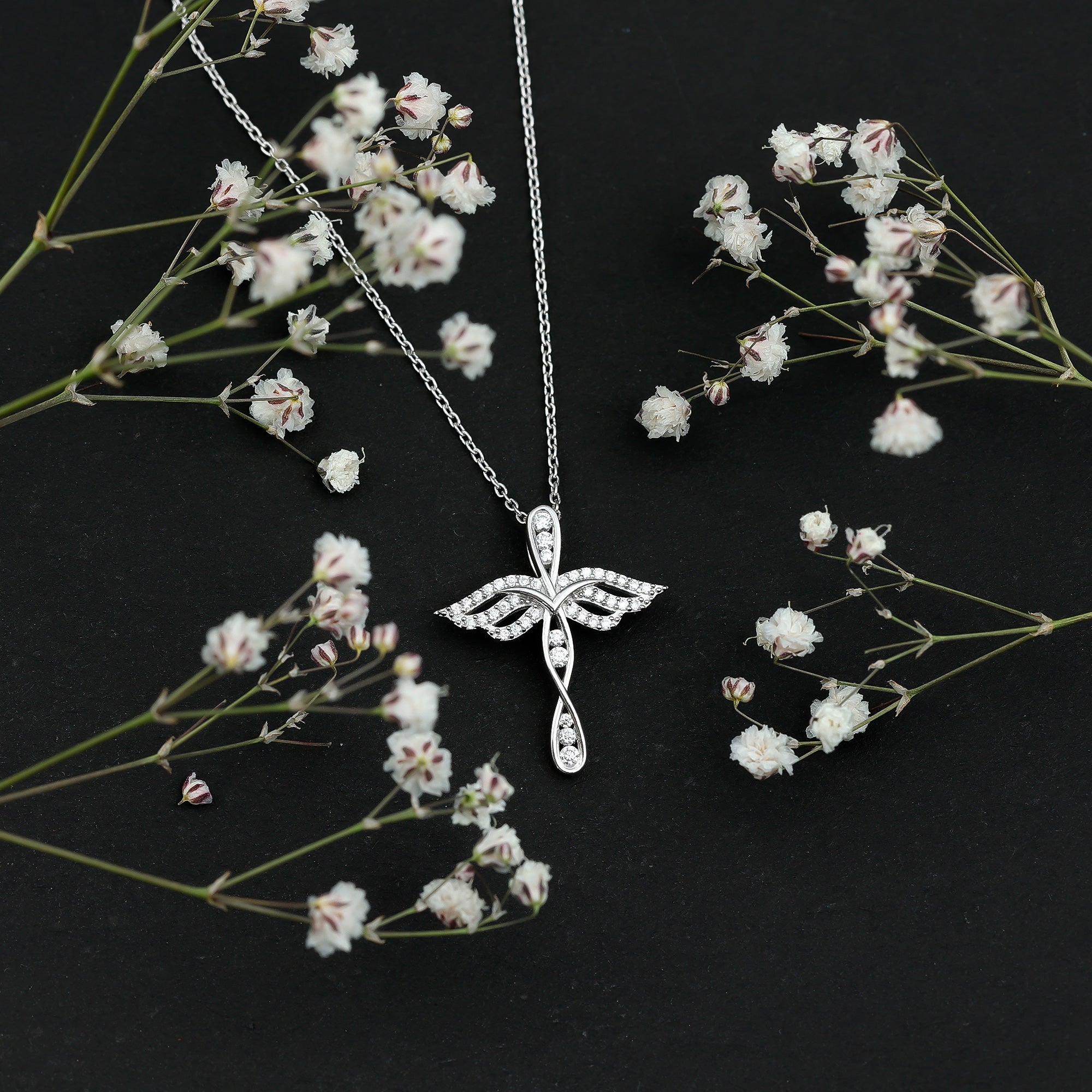 Pave Set Moissanite Angel Wings Cross Necklace with Silver Chain