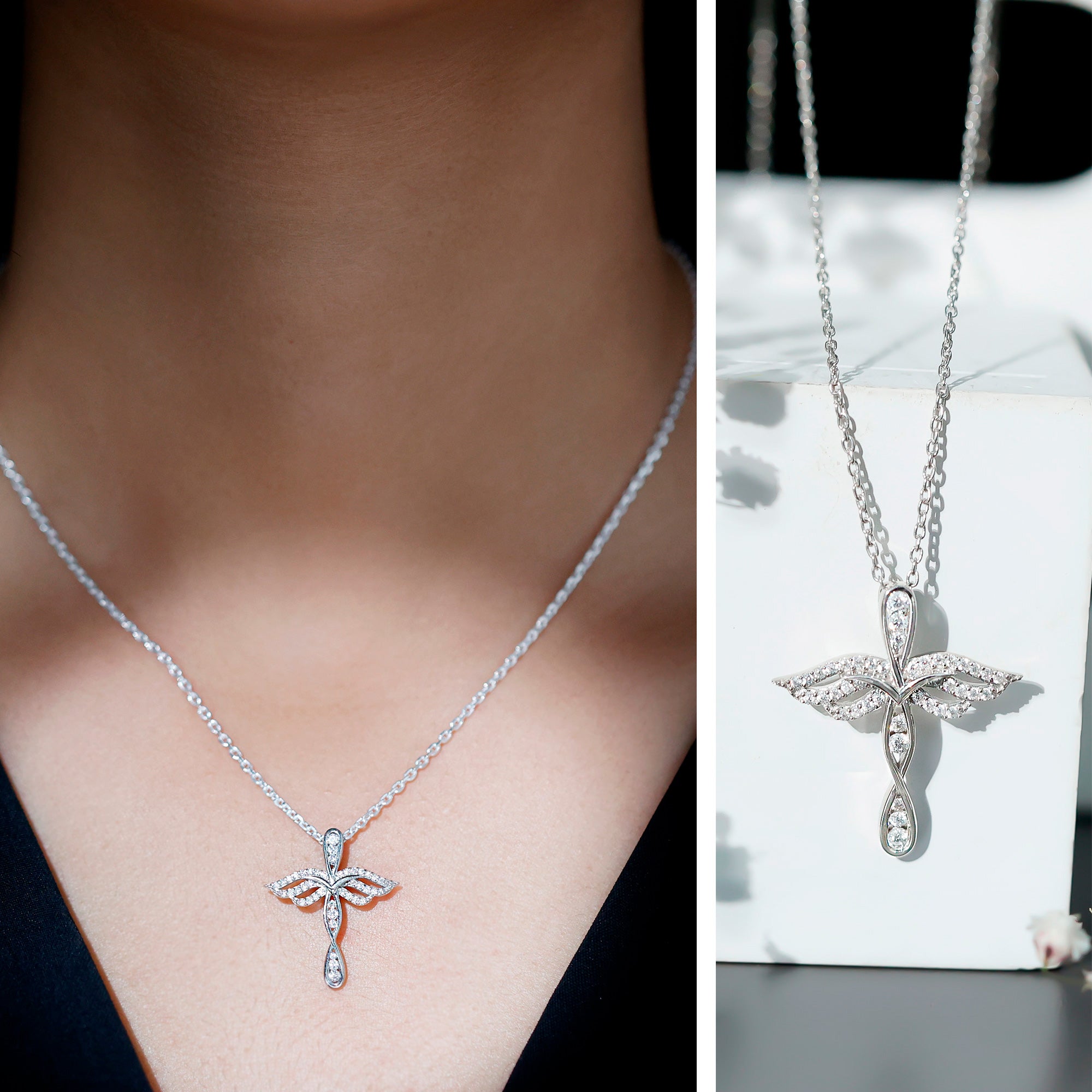 This Angel Wing Cross Necklace is the perfect blend of devotion and style. It is crafted with 14K White Gold Plated Silver embedded with Round Shape smaller Moissanite Stones securely placed in Pave Setting. This Guardian Angel Pendant shines with D-VS1 Quality Moissanite, which is crafted with precision for your special occasion. This Moissanite Pendant is perfect to complete your Christmas look and be the center of the crowd. Treat yourself or get it for your beloved, as it is a beautiful symbol of faith and protection, and will be delivered to you in a velvet pouch to prevent it from dust when not in use.