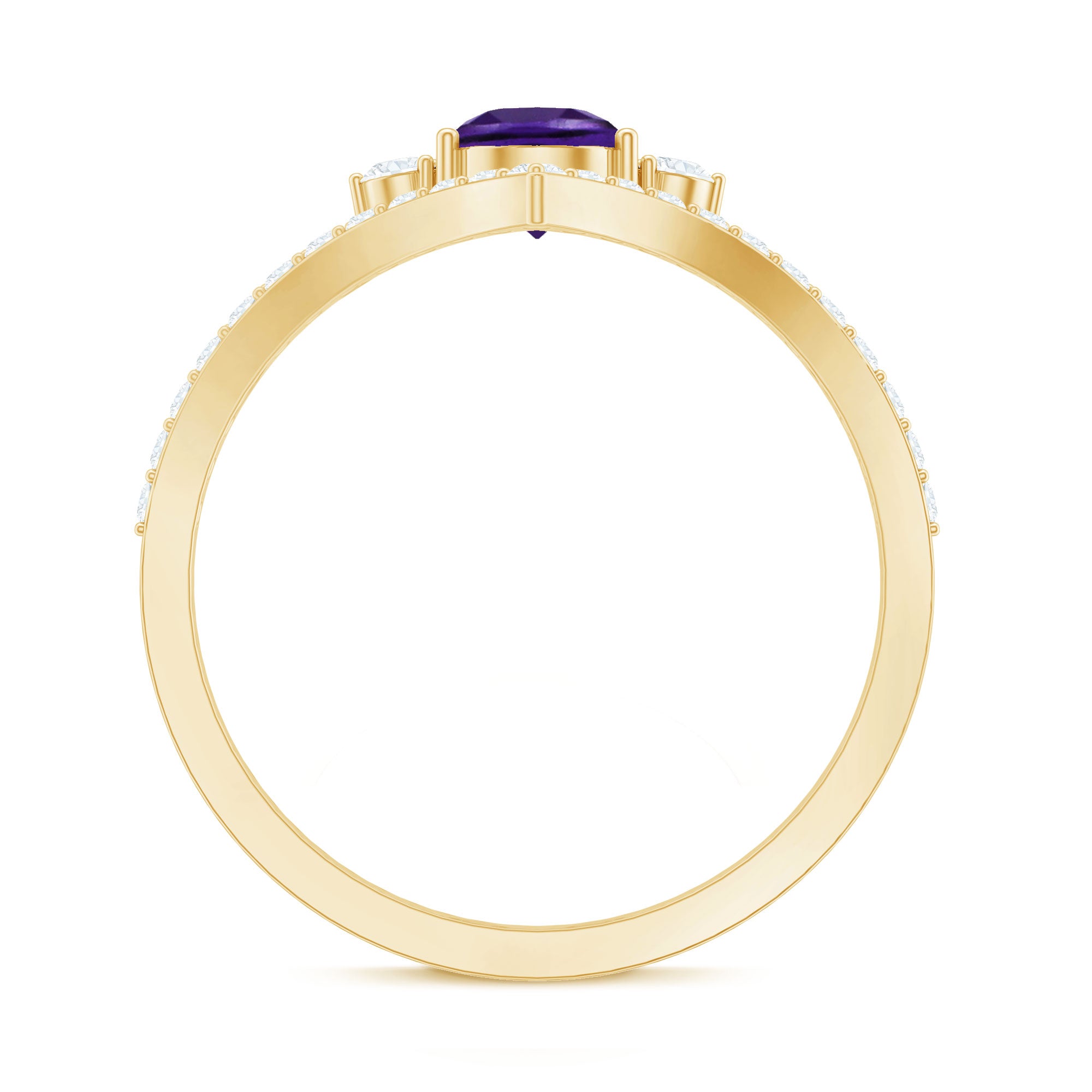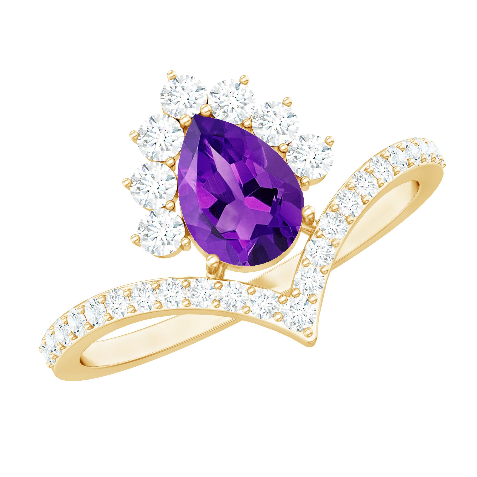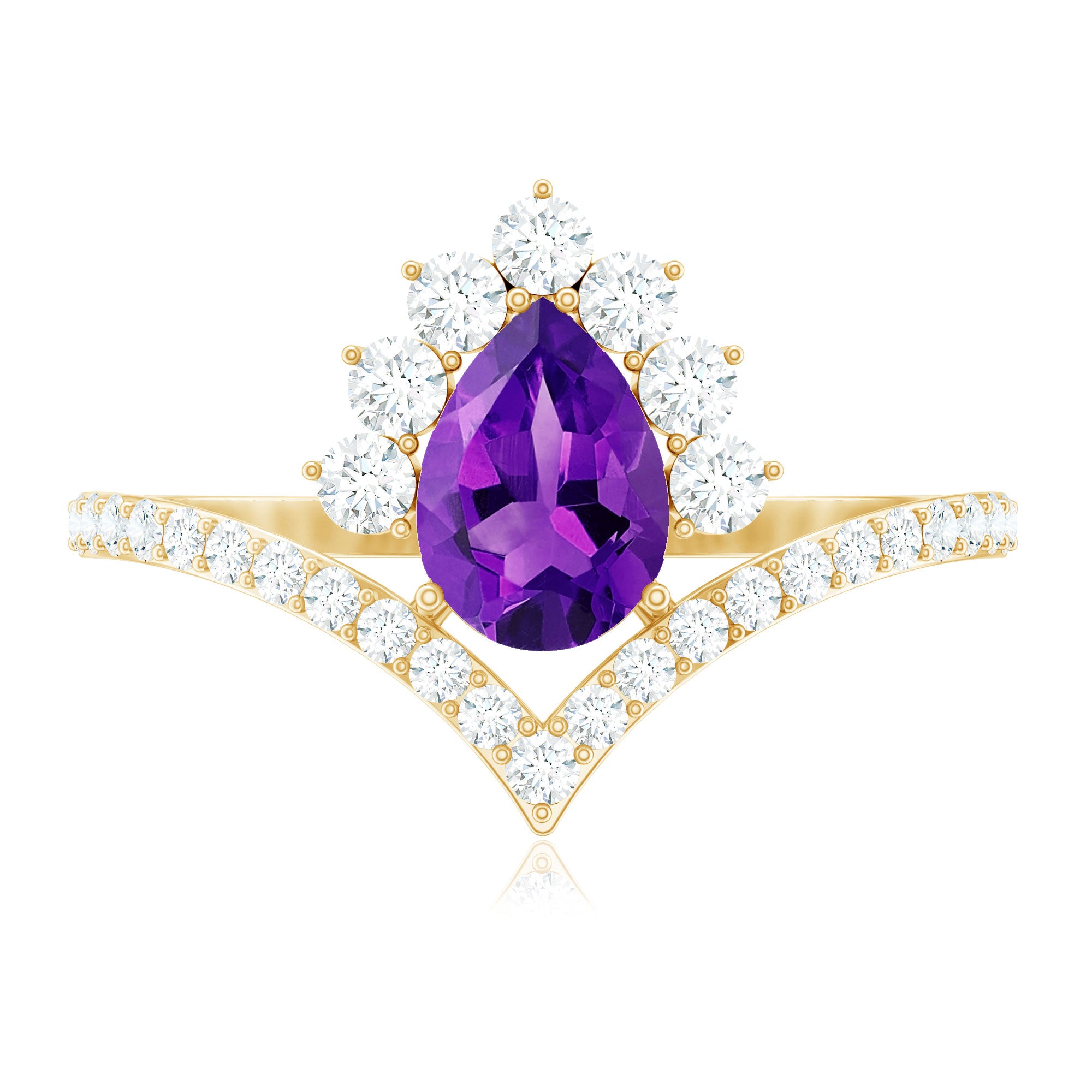 Indulge in the captivating beauty of the Amethyst Ring, adorned with a dazzling Pear Cut Amethyst delicately set in an Accent Setting alongside shimmering Diamond gems. This exquisite Amethyst Crown Ring is a true masterpiece of jewelry design. Its timeless allure makes it a perfect accessory that can be cherished and worn for a lifetime, adding a touch of elegance and sophistication to any ensemble.
