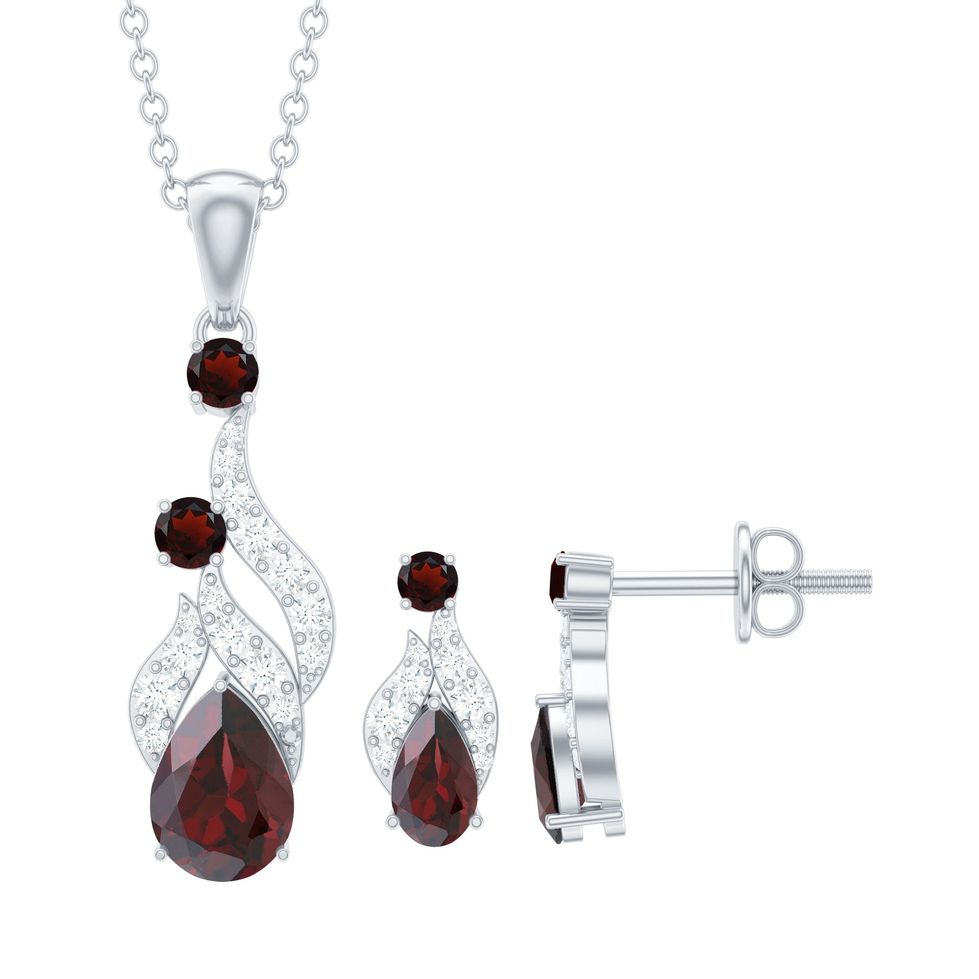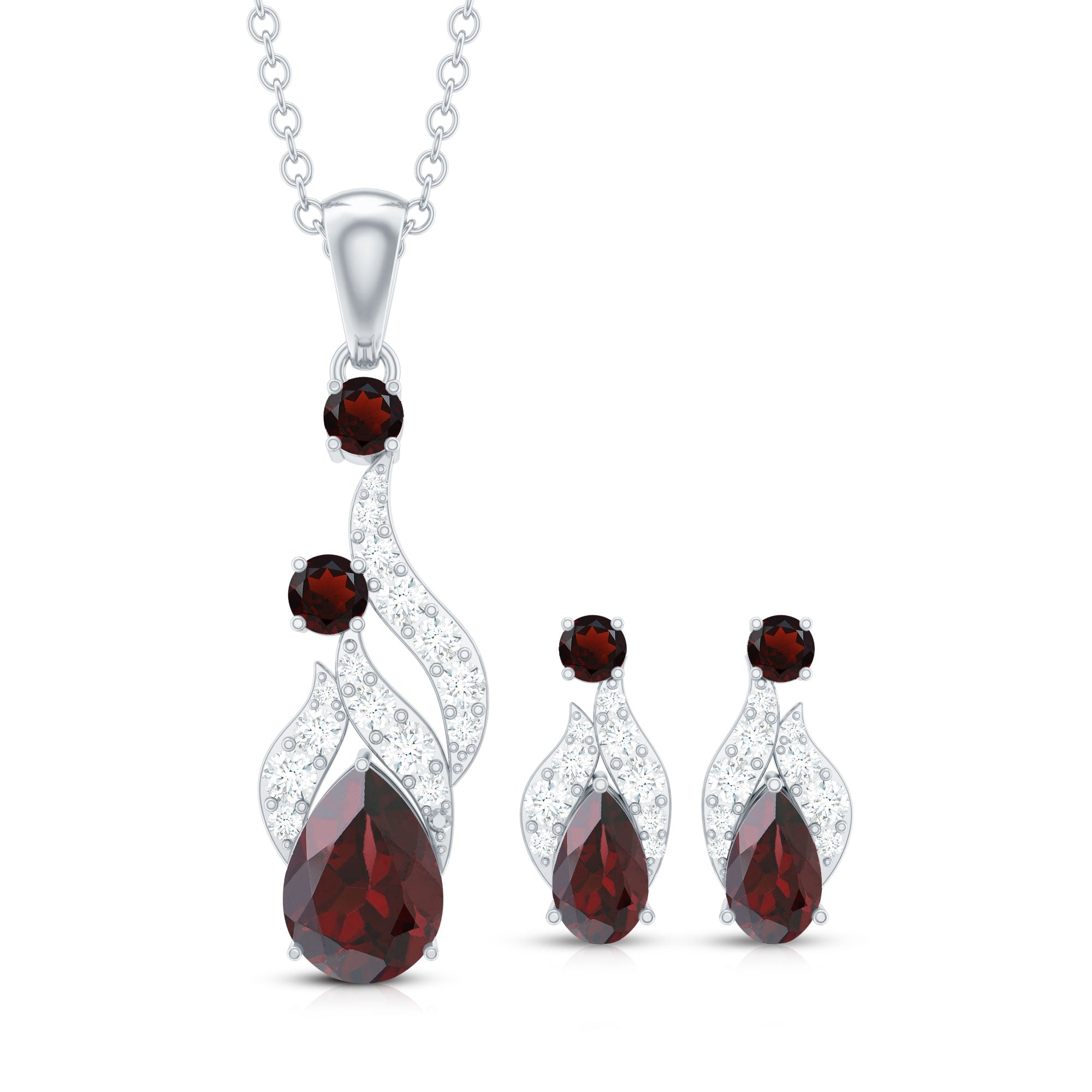 Pear and Round Shape Garnet and Diamond Dangle Jewelry Set
