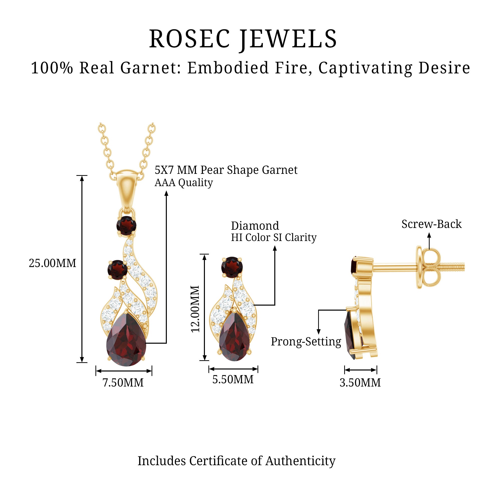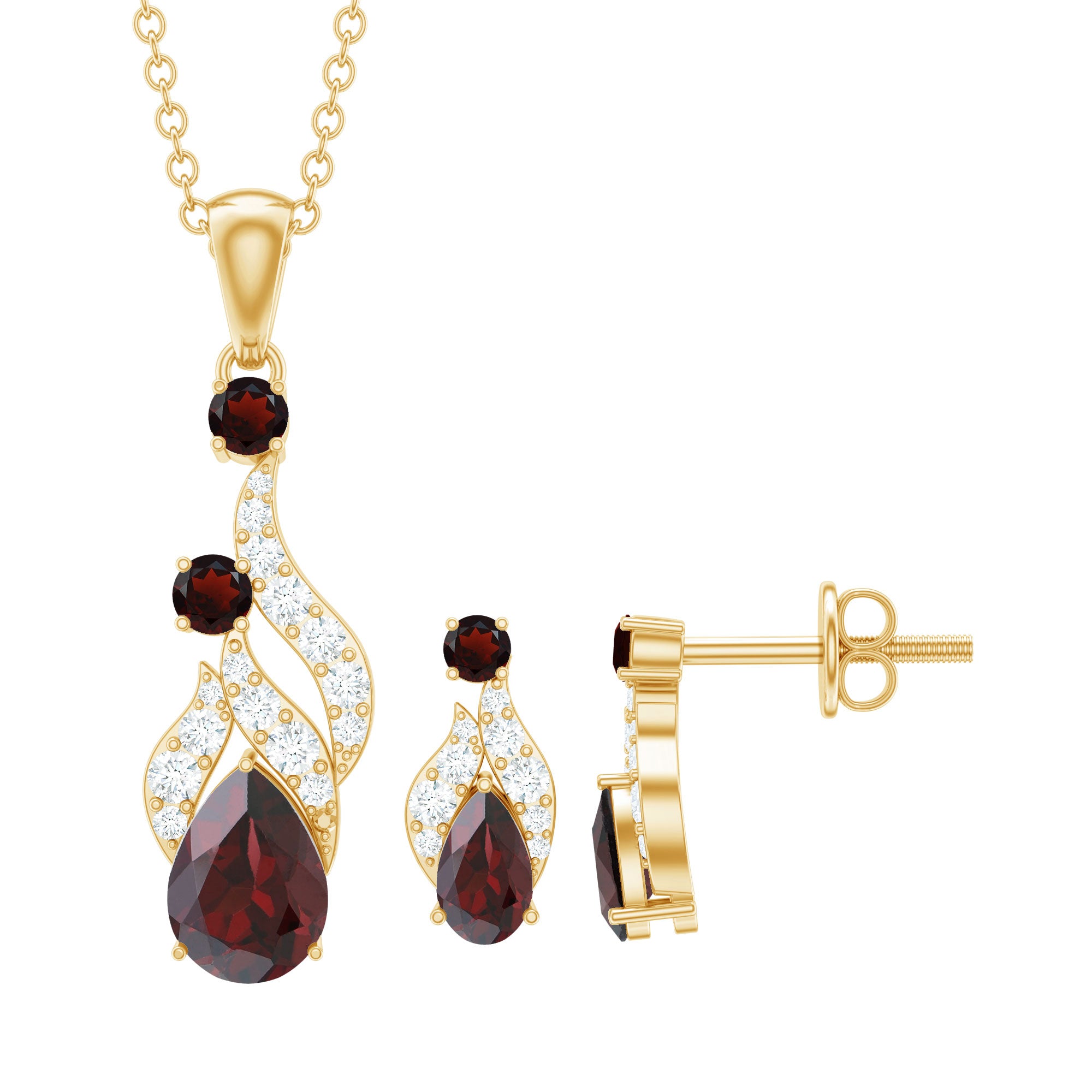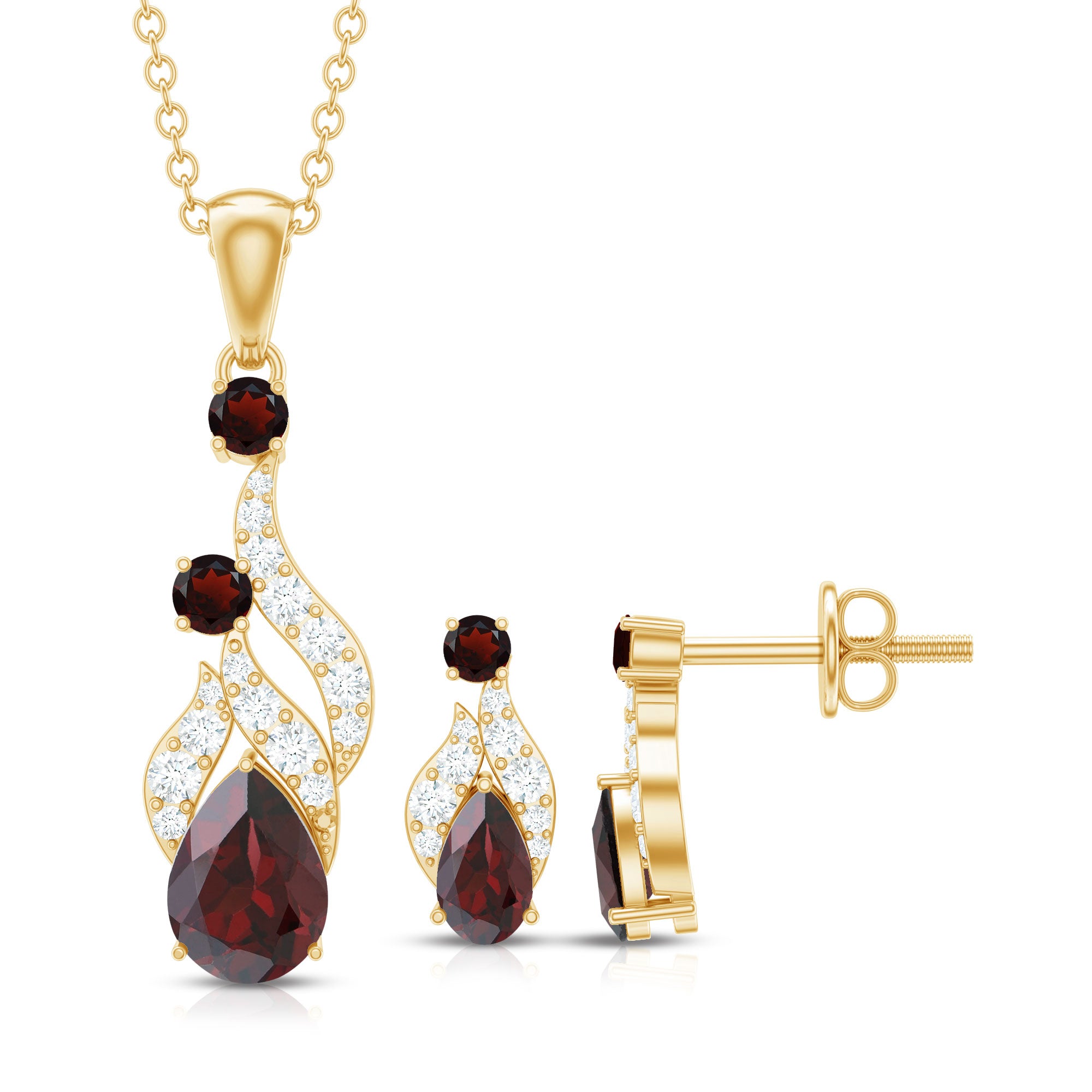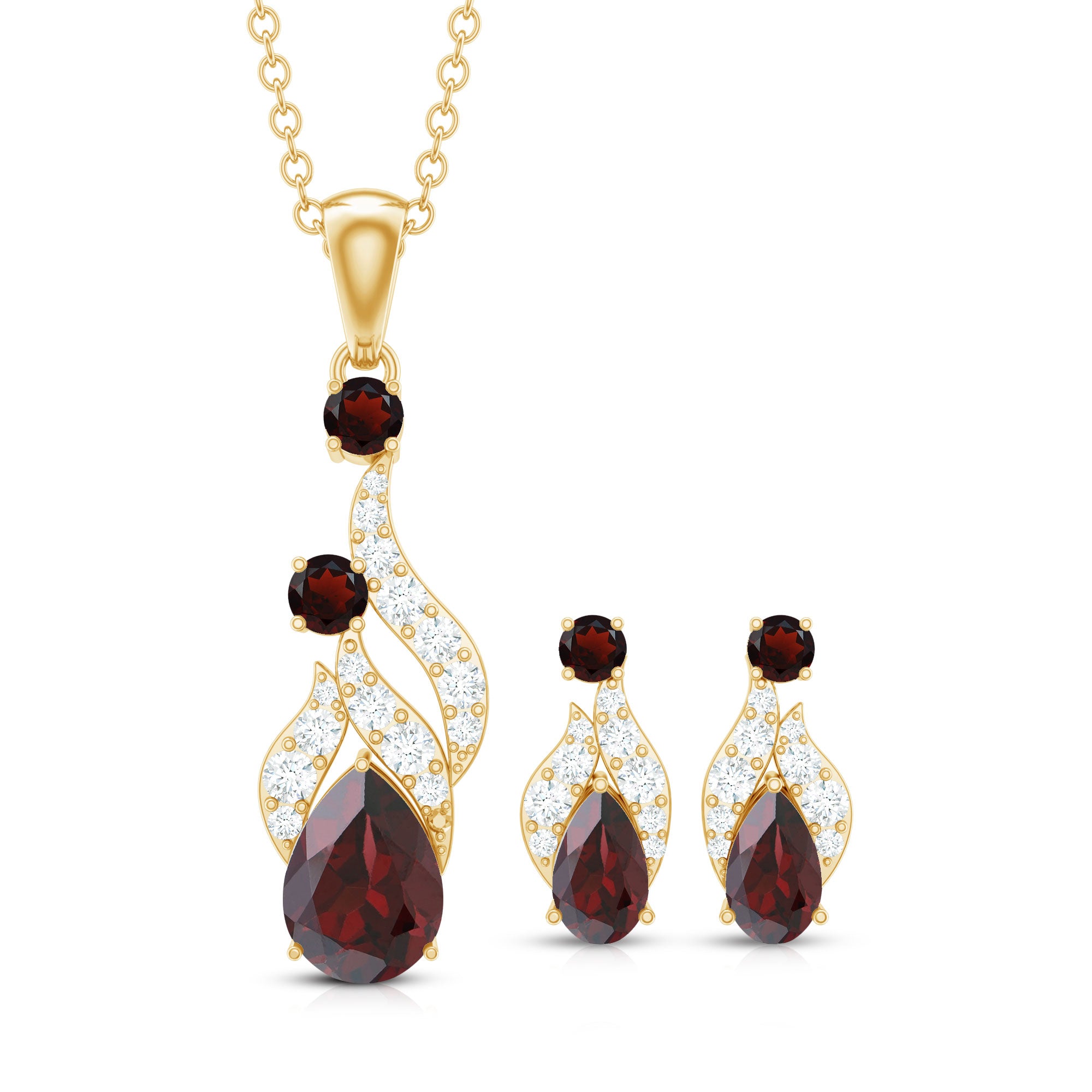 The Pear and Round Shape Garnet in Prong Setting with Diamond on Pendant Necklace and Earrings Set looks pretty cool with any of your fav outfits. Add a hint of drama with this Dangle Jewelry Set. This Bridal Pendant is a perfect statement jewelry for your special occasions. Dazzle all day long with this stunning Jewelry Set