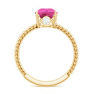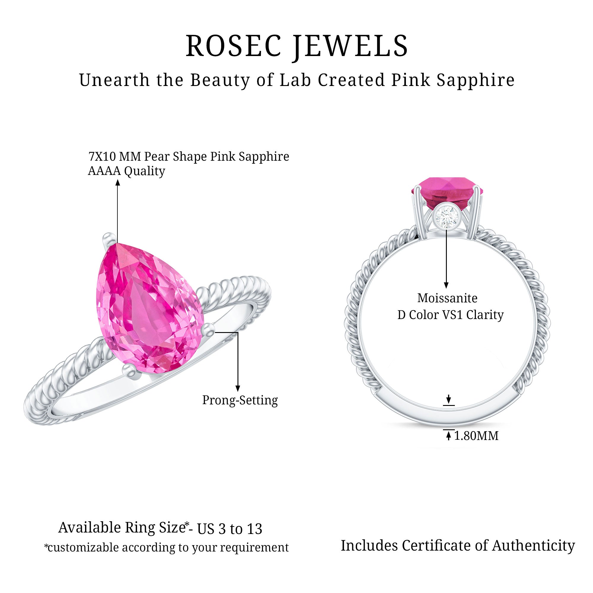 The Solitaire Engagement Ring is beautifully adorned with Pear Shaped Created Pink Sapphire secured in Prong Setting while Round Shape Moissanite studded on the bridge of the ring. It doesnt matter what the occasion is, our Created Pink Sapphire Ring will never let you down, whether its a day on the go or a night out with your girls.