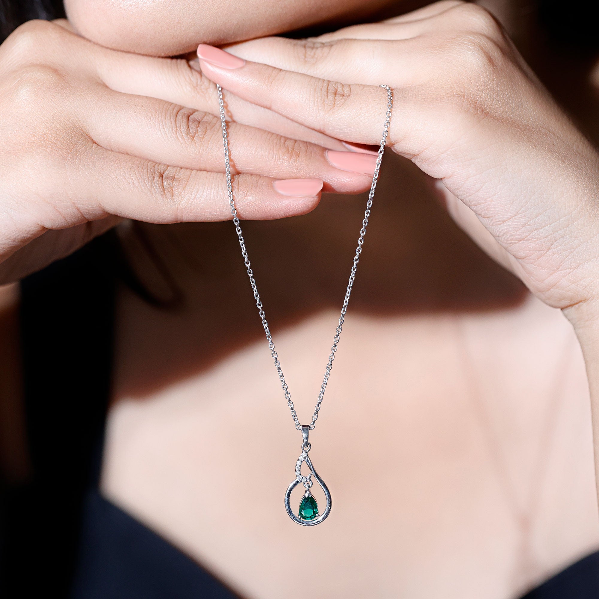 Enhance your casual or formal attire with this exquisite Emerald Teardrop Necklace. Crafted from 14K white gold plated silver, this stunning piece showcases a 5X7 MM pear shaped lab grown emerald encased in a teardrop-shaped frame adorned with a hint of round moissanites. With its AAAA quality emerald stone and brilliant polished finish, this Drop Pendant Necklace hangs gracefully from a cable chain secured by a lobster clasp. Elegant yet striking, it features a simple bail that adds to its charm. Wear this Pear Shaped Emerald Necklace with confidence and let it catch the light, captivating everyone around you. Transform any outfit with this unique accessory. Win her affection with this stunning Lab Grown Emerald Necklace that elevates her fashion game. Transform classic beauty by highlighting everlasting sophistication with this pendant, a striking jewelry piece that radiates sparkle and style.