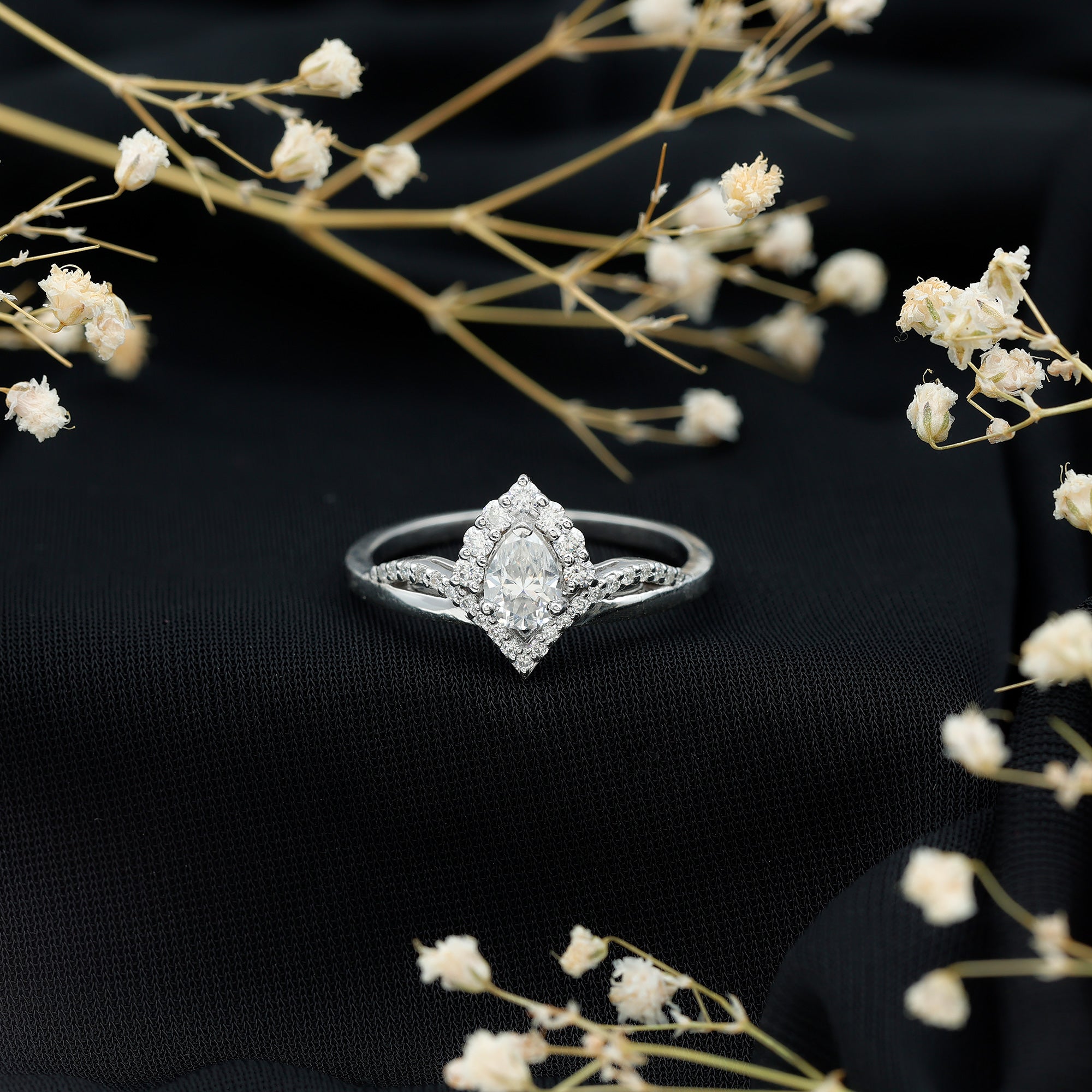 Enhance her elegance with this exquisite Designer Ring for Engagement. It features a central 5X7 MM pear shaped lab grown diamond set in prong setting, encircled by additional sparkling round-cut diamonds, making this Unique Engagement Ring truly outststanding. Crafted from precious metal, this Lab Created Diamond Engagement Ring serves as an ideal gift for her. The shank of the ring is distinctive, showcasing a designer flair adorned with petite stones. This Diamond Teardrop Ring radiates the brilliance of EF-VS quality lab-made diamonds embedded within the design. This Classic Ring is the perfect selection for your beloved on a momentous occasion. The Engagement Ring will arrive in a high-quality jewelry box, accompanied by a gemstone authentication certificate that guarantees the rings quality. This Timeless Engagement Ring will surely become a treasured addition to her jewelry collection that she will cherish for a lifetime.