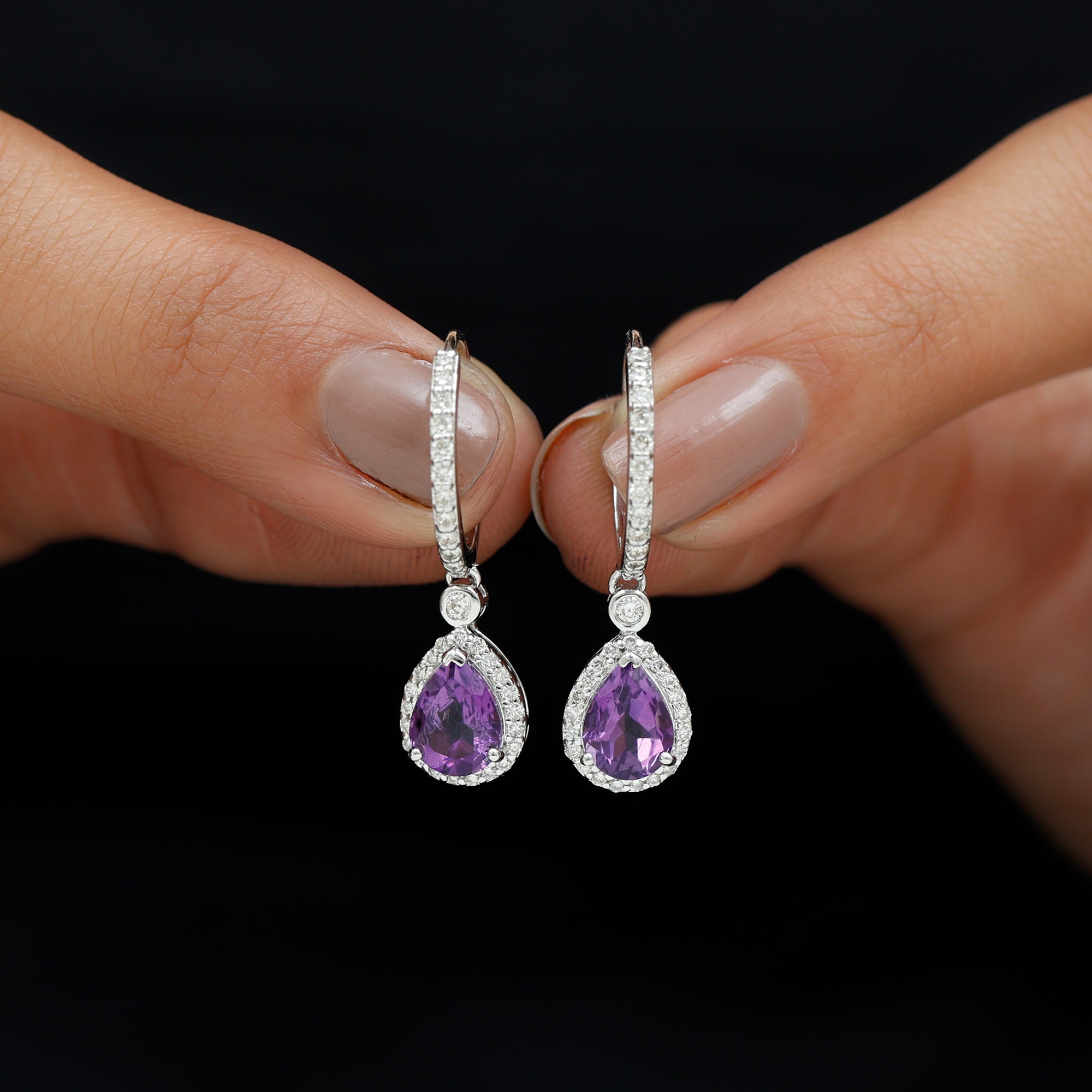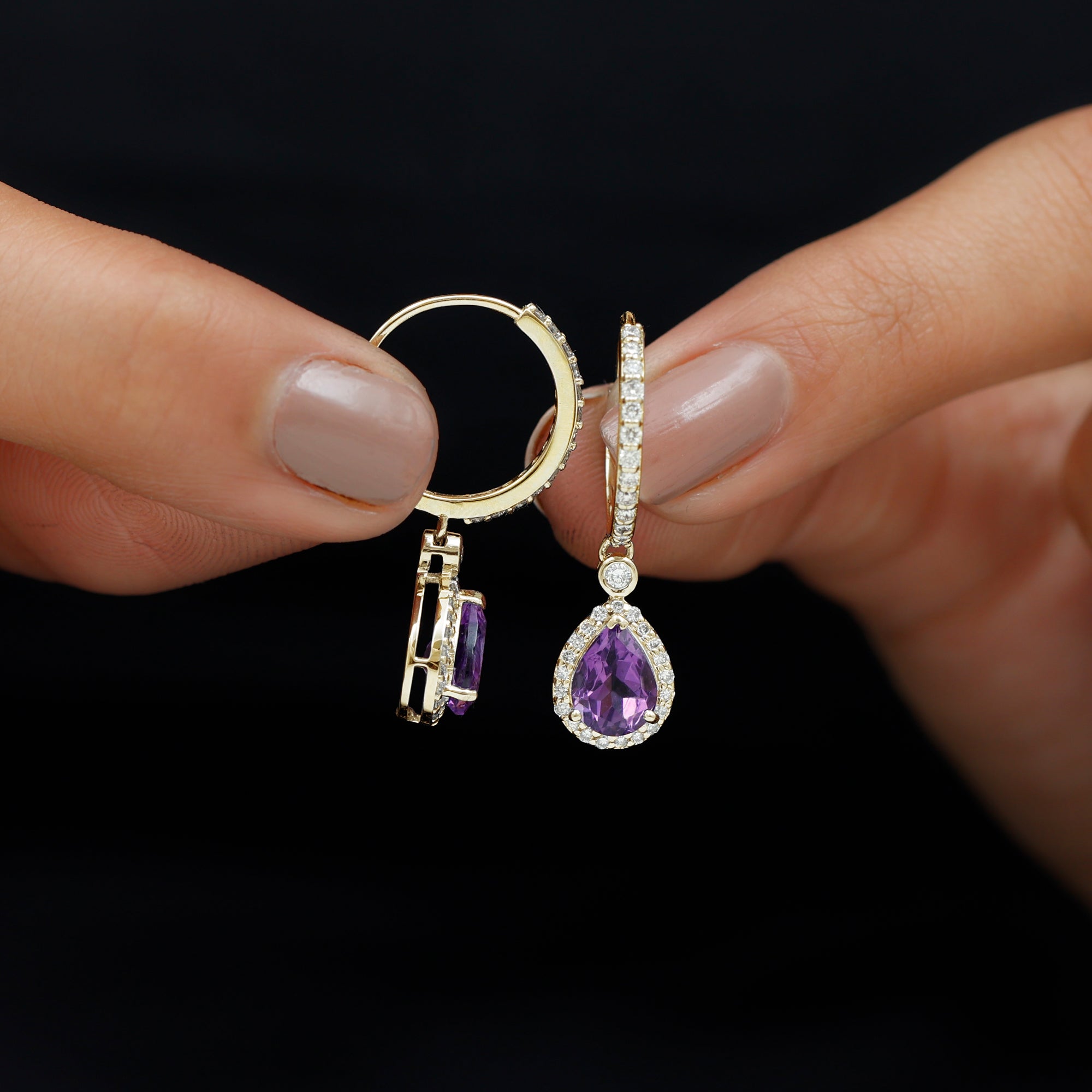 Pear Cut Amethyst Hoop Drop Earrings with Diamond Halo