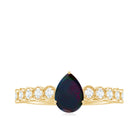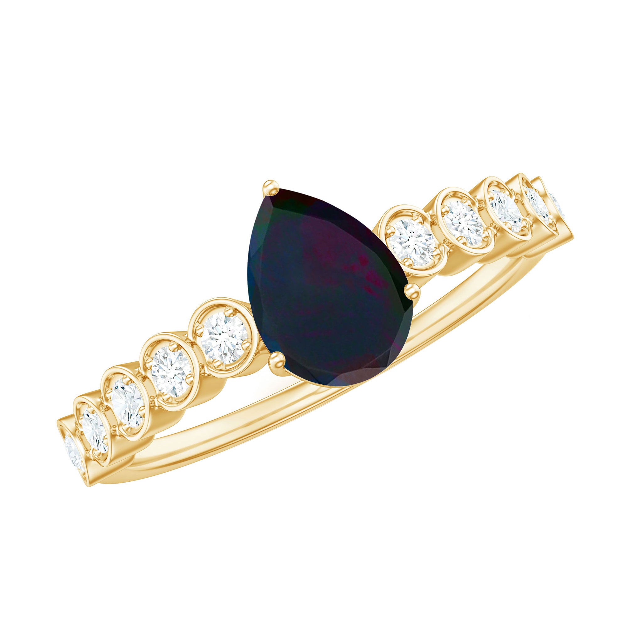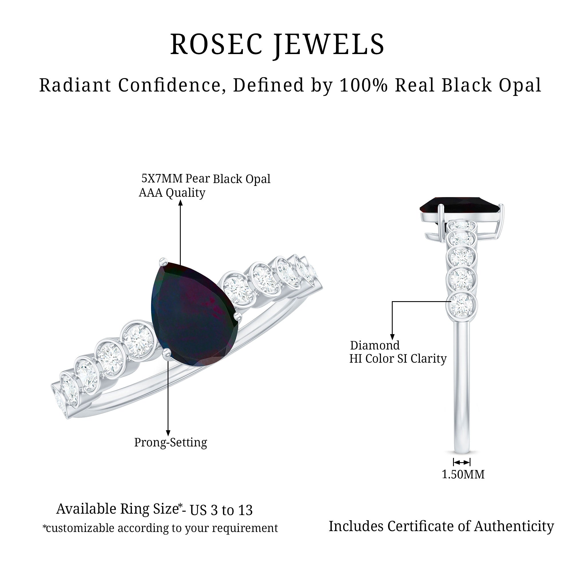 A true classic in every possible way, this is a kind of Engagement Ring embellished in Pear Cut Black Opal set as a solitaire in Prong Setting while the round-cut Diamond stones on both sides create a sparkling look. The black opal ring is highly customizable and allows you to choose your preferred metal color from the available options.