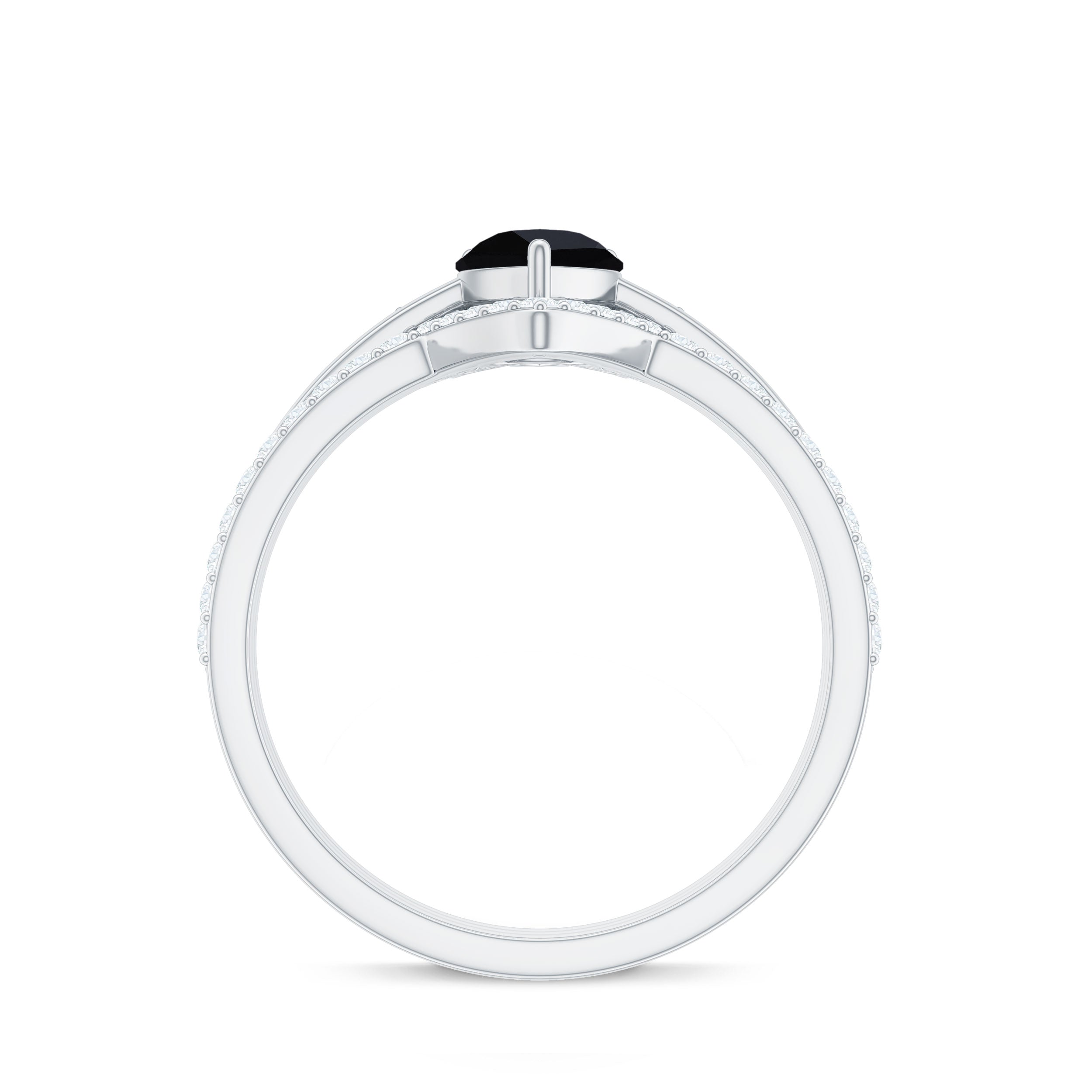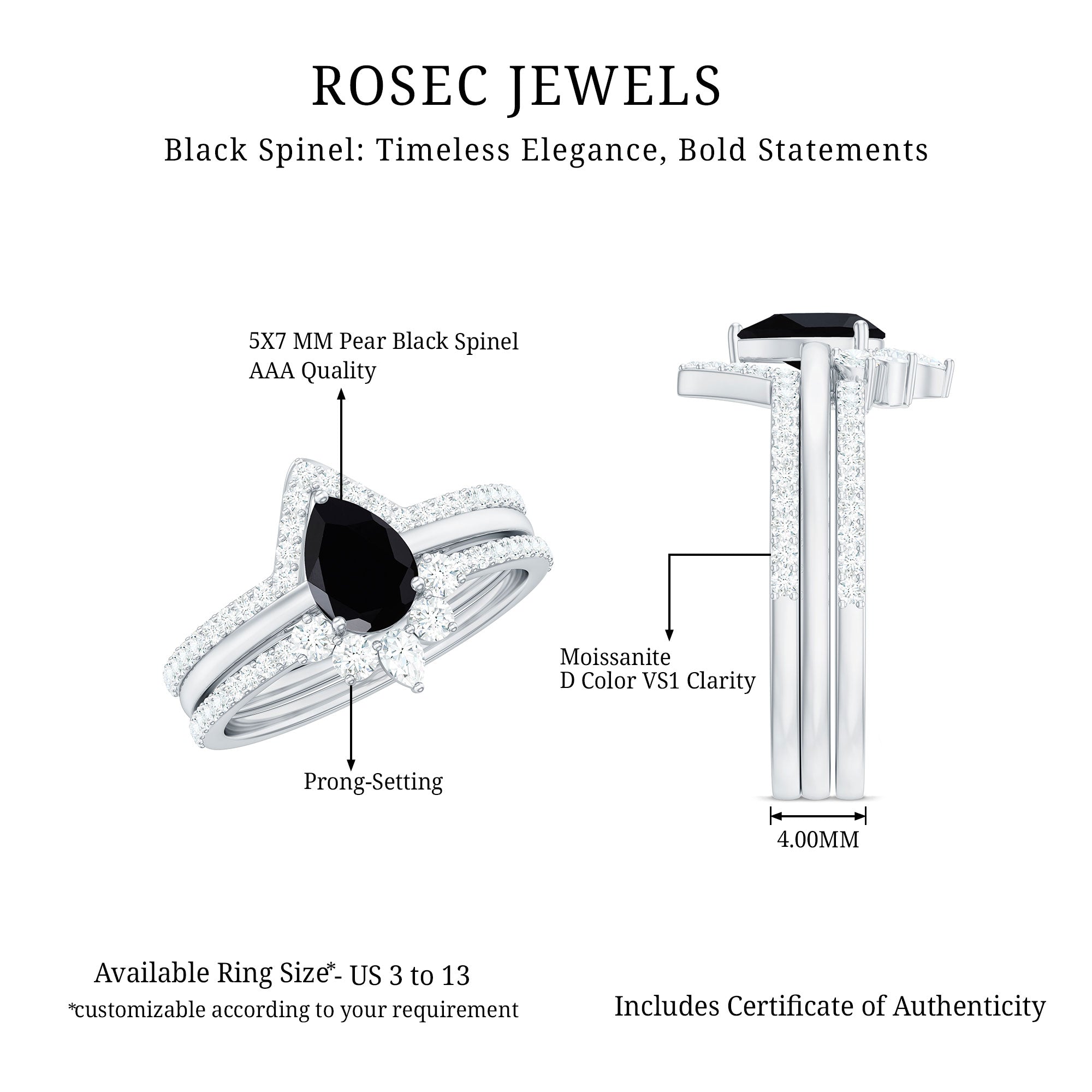 Make her big day even more memorable with this stunning Three Ring Set adorned with pear cut Black Spinel set as Solitaire in one ring with two enhancer featuring round moissanite stones. This Bridal Ring Set is a splendid choice for any woman, exuding elegance and sophistication. Surprise your lady with this exquisite moissanite ring set and let it be a cherished piece shell treasure forever, representing the beauty of your love on her big day.