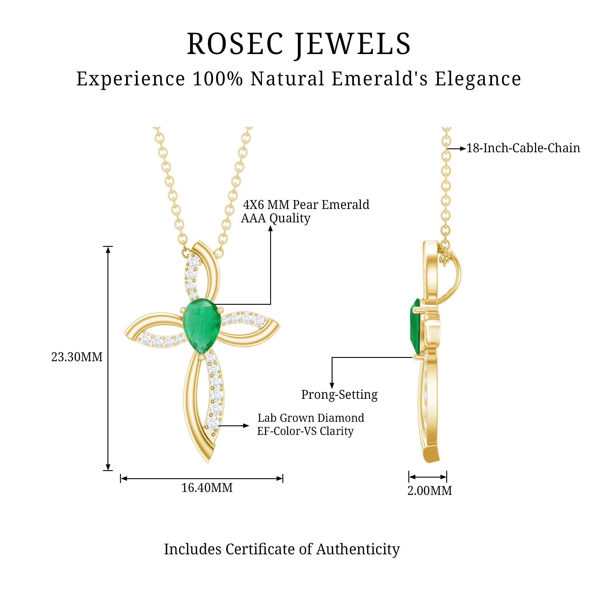 Pear Cut Emerald Cross Pendant With Lab Grown Diamond