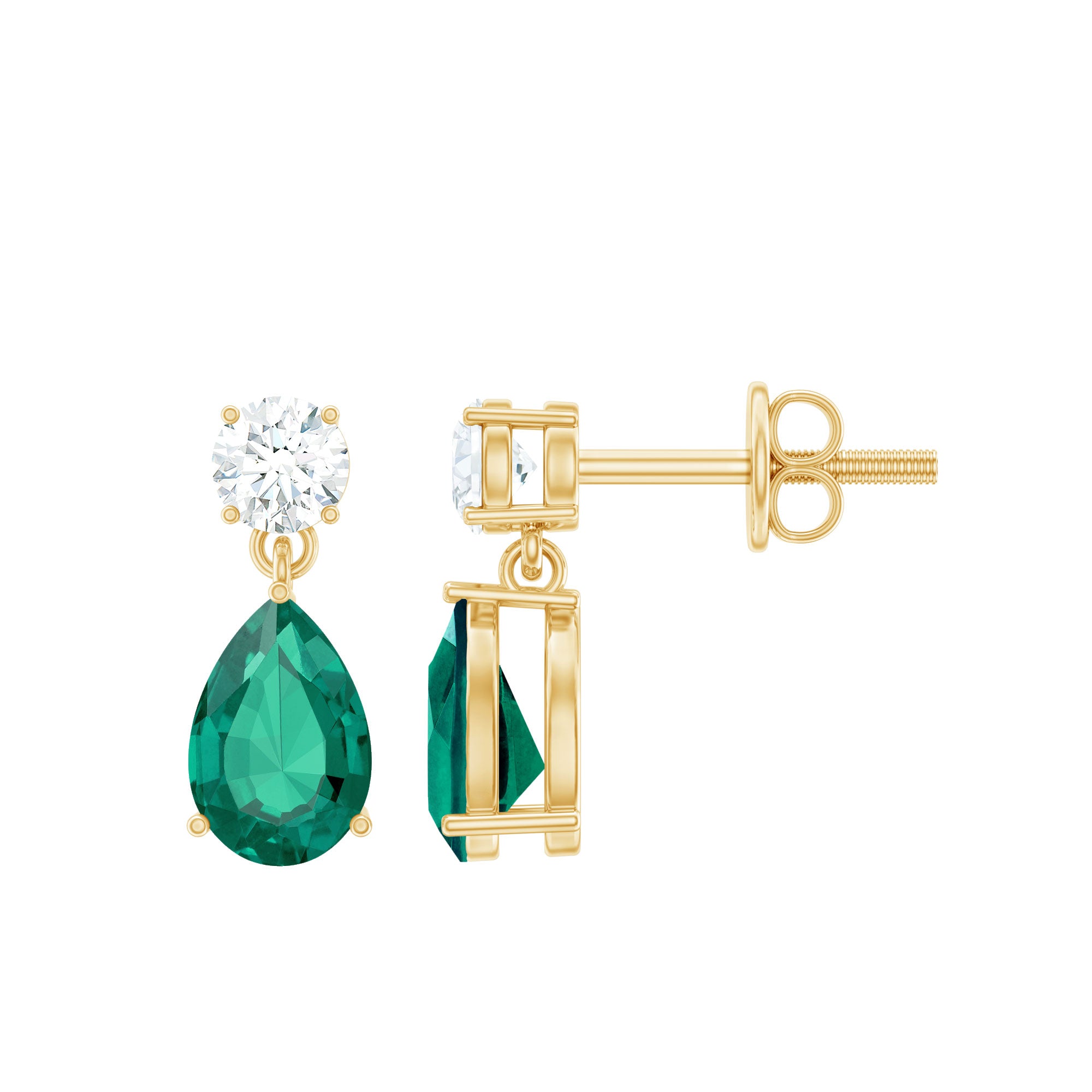 If you are looking for a stunning accessory for your special occasions and events, consider the sparkling and elegant Emerald Drop Earrings. These Teardrop Earrings feature a 4 MM Round Cut Moissanite at the top, with a stunning 5X7 MM Pear Cut Lab Created Emerald dangling below, all set in secure prong setting. The Emerald and Moissanite Earrings are designed with screw-backs for a comfortable and secure fit. This pair makes an excellent anniversary gift for your partner, surprising her with their beauty and elegance. AAA quality Lab grown emeralds offer the same beauty and elegance as natural stones but are more eco-friendly and affordable, giving you luxury without compromise. These Lab Grown Emerald Earrings come with a certificate of authenticity to ensure quality and value. Beautifully packed in a premium gift box, these Bridal Drop Earrings make a thoughtful present for birthdays, anniversaries, Valentine’s Day, wedding day, or any special moment.