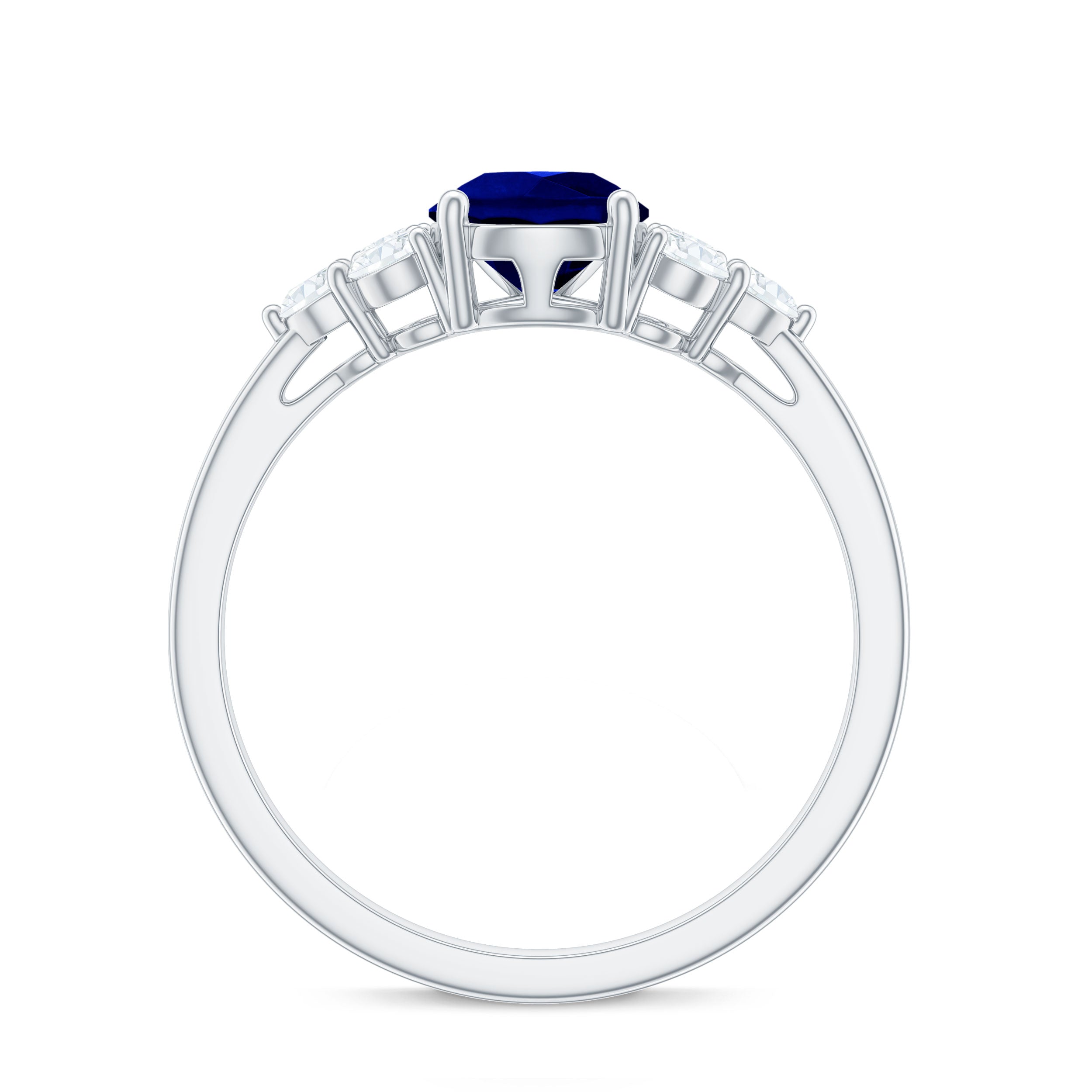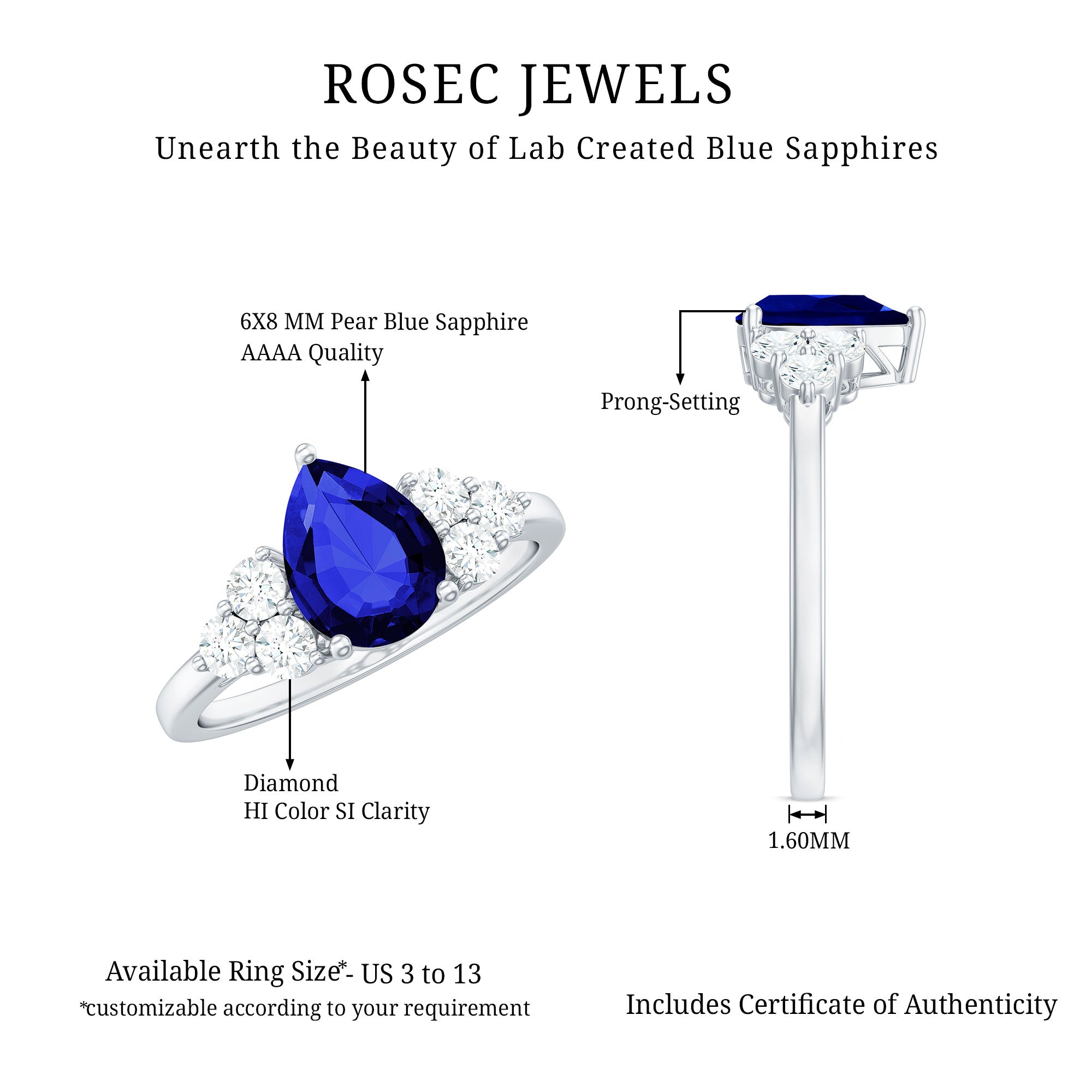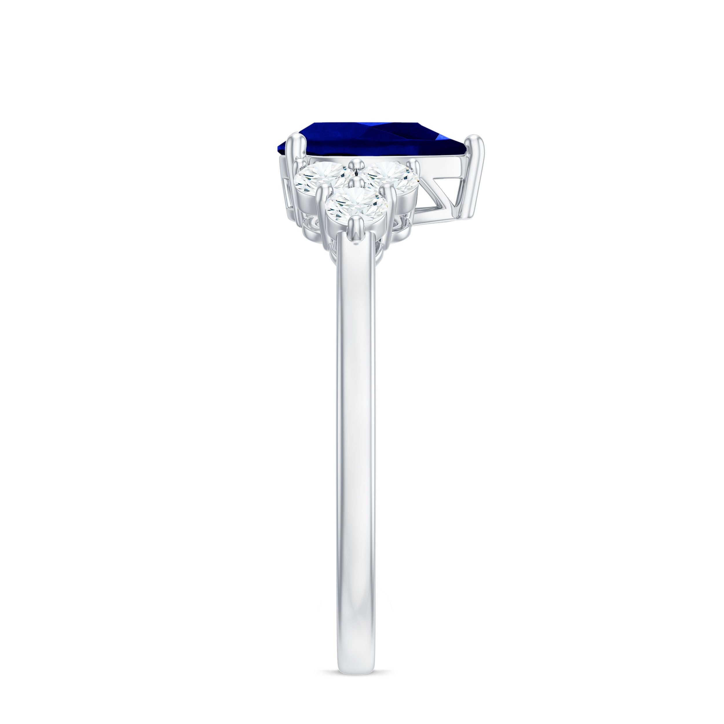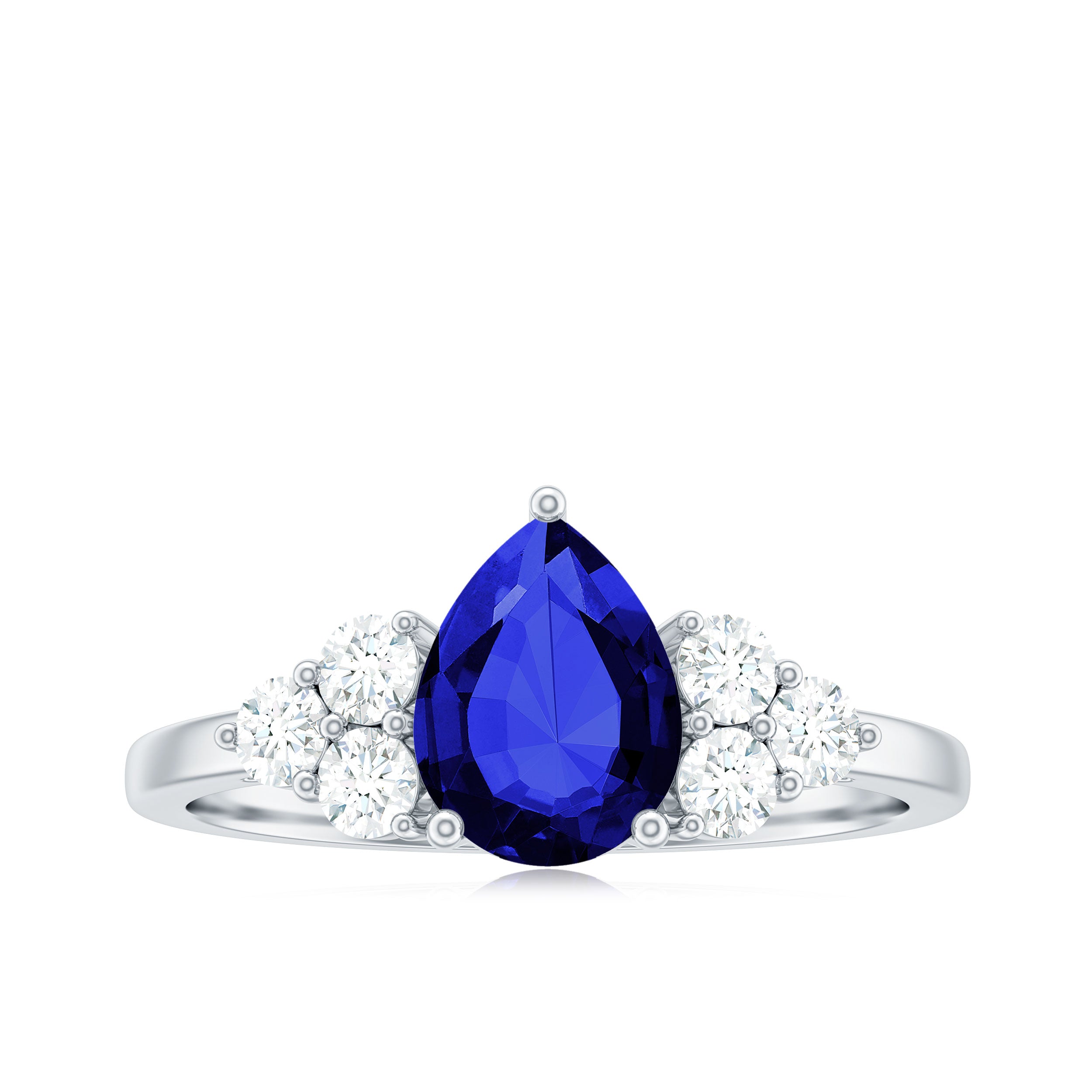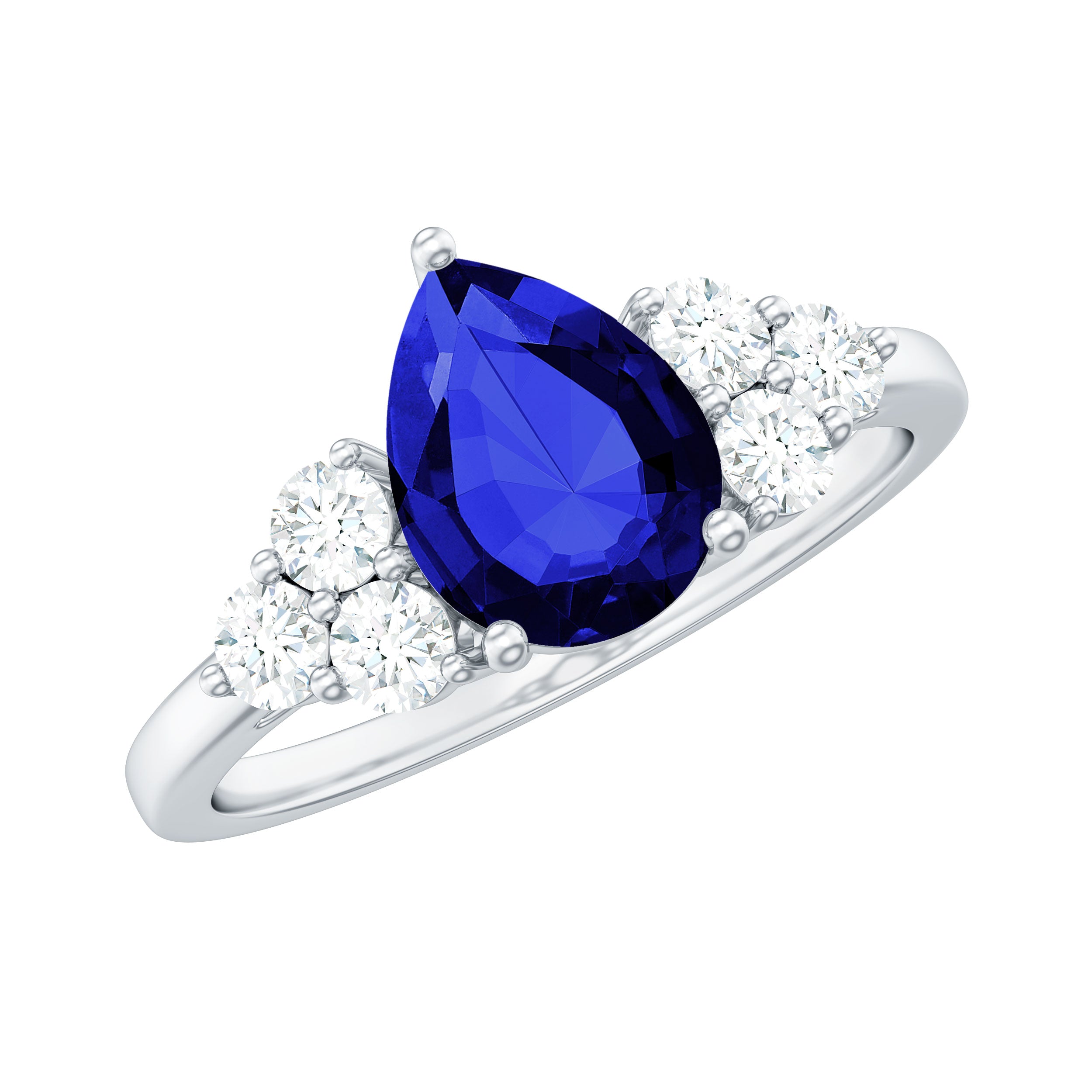 Pear Cut Lab Grown Blue Sapphire Solitaire Ring with Diamond Trio