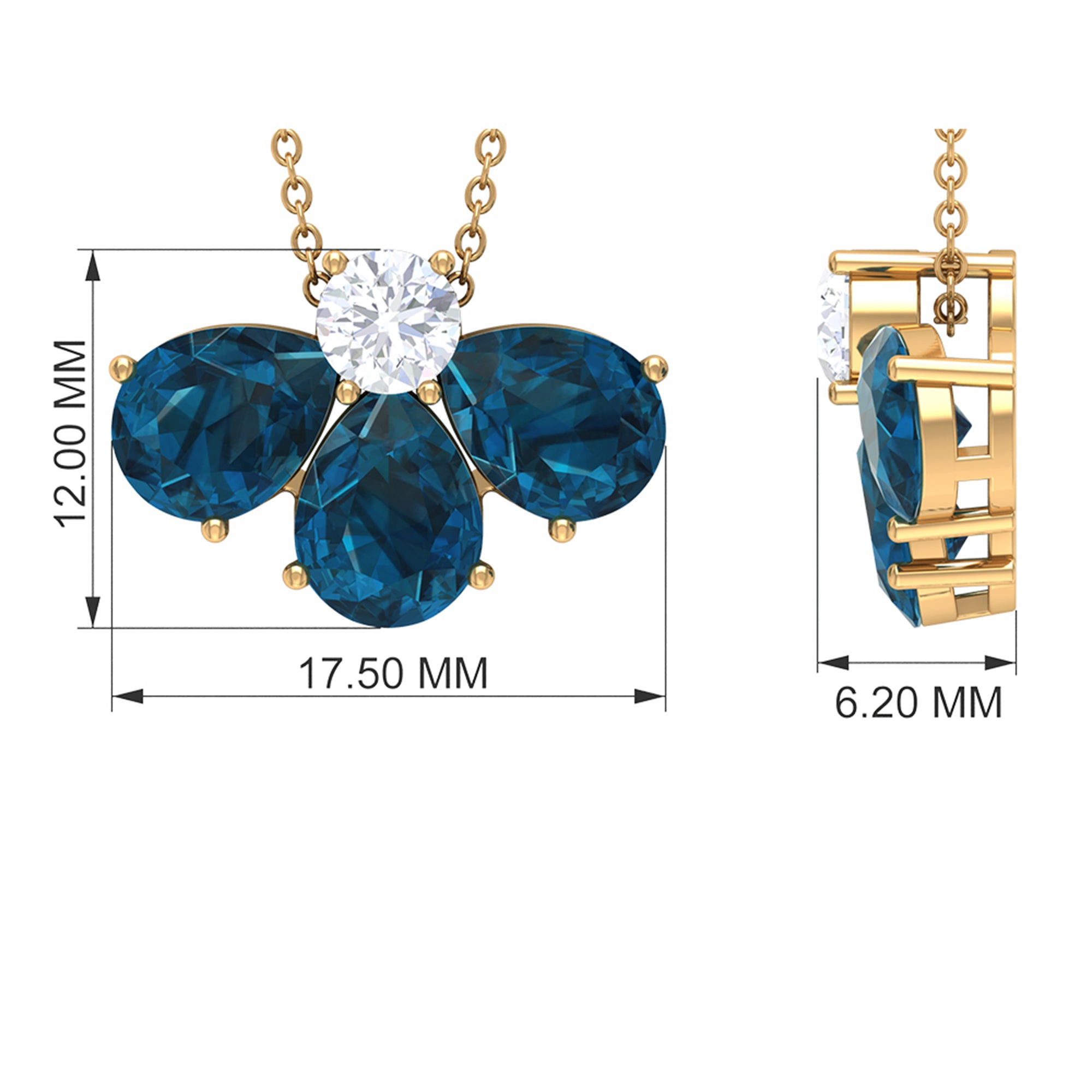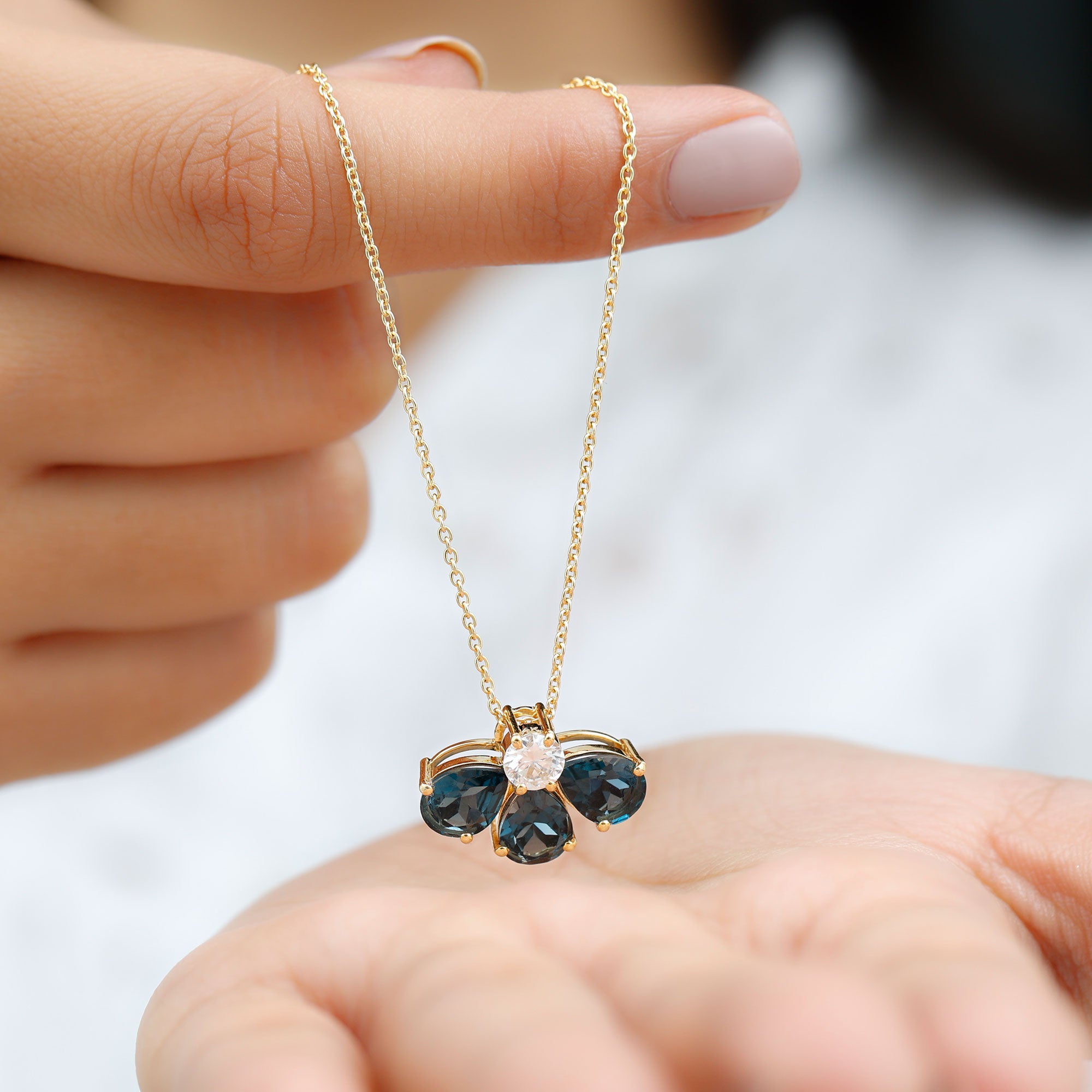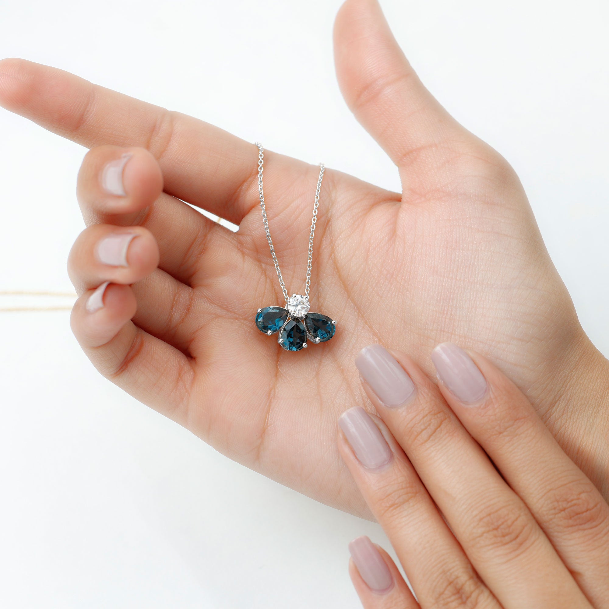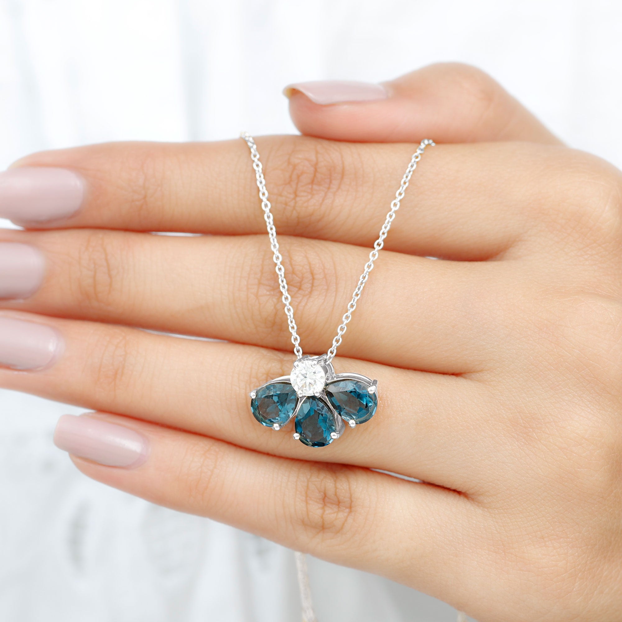 Elevate your style with this Floral Pendant, a captivating accessory that demands attention. It showcases Pear Shape London Blue Topaz gemstones meticulously set in a Prong Setting, forming a delicate Half Flower Pattern. The center stone, a brilliant Moissanite, adds a touch of elegance and sparkle to this exquisite pendant.
