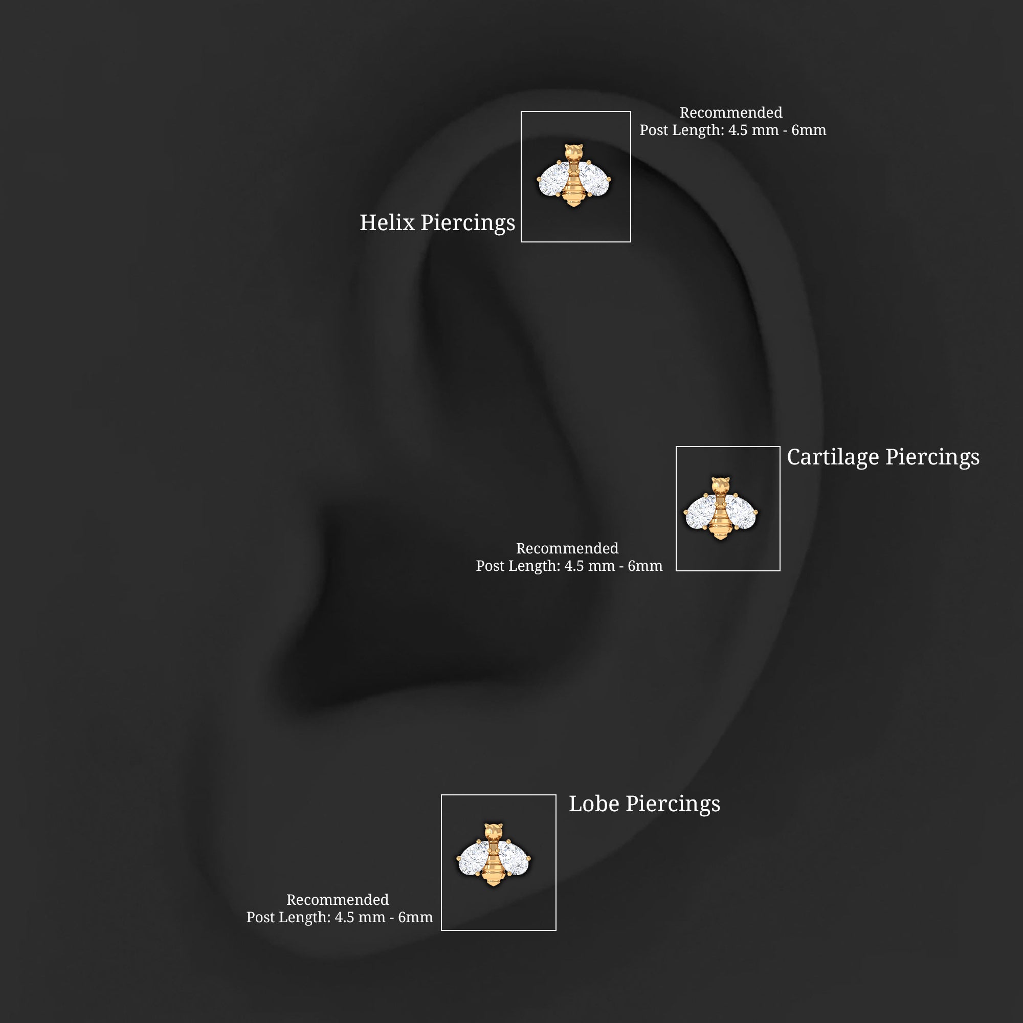 Make a lasting impression with our Moissanite Bumble Bee Earring, sure to turn heads wherever you go. Features beautiful Pear Cut Moissanite stones arranged in a bumble bee design, making it the perfect body jewelry to pair with both casual and dressy outfits. This Moissanite Earring can be worn on various piercings, including Cartilage, Helix, or Upper Lobe, and can be secured using either a Flat Back Closure for maximum comfort. Wear it solo for a simple sparkle or pair it with other studs and hoops to craft a fun ear stack. This adorable Bee Stud Earring adds a charming touch that is both playful and elegant. Whether you are getting dressed for a special event or just want to add a bit of shine to your daily look, this piece will instantly elevate your style. Plus, this Moissanite Cartilage Earring makes a thoughtful gift for your wife, girlfriend, daughter, mother, or friend who loves cute and meaningful jewelry. It comes in a lovely box, perfect for gifting or keeping safe.