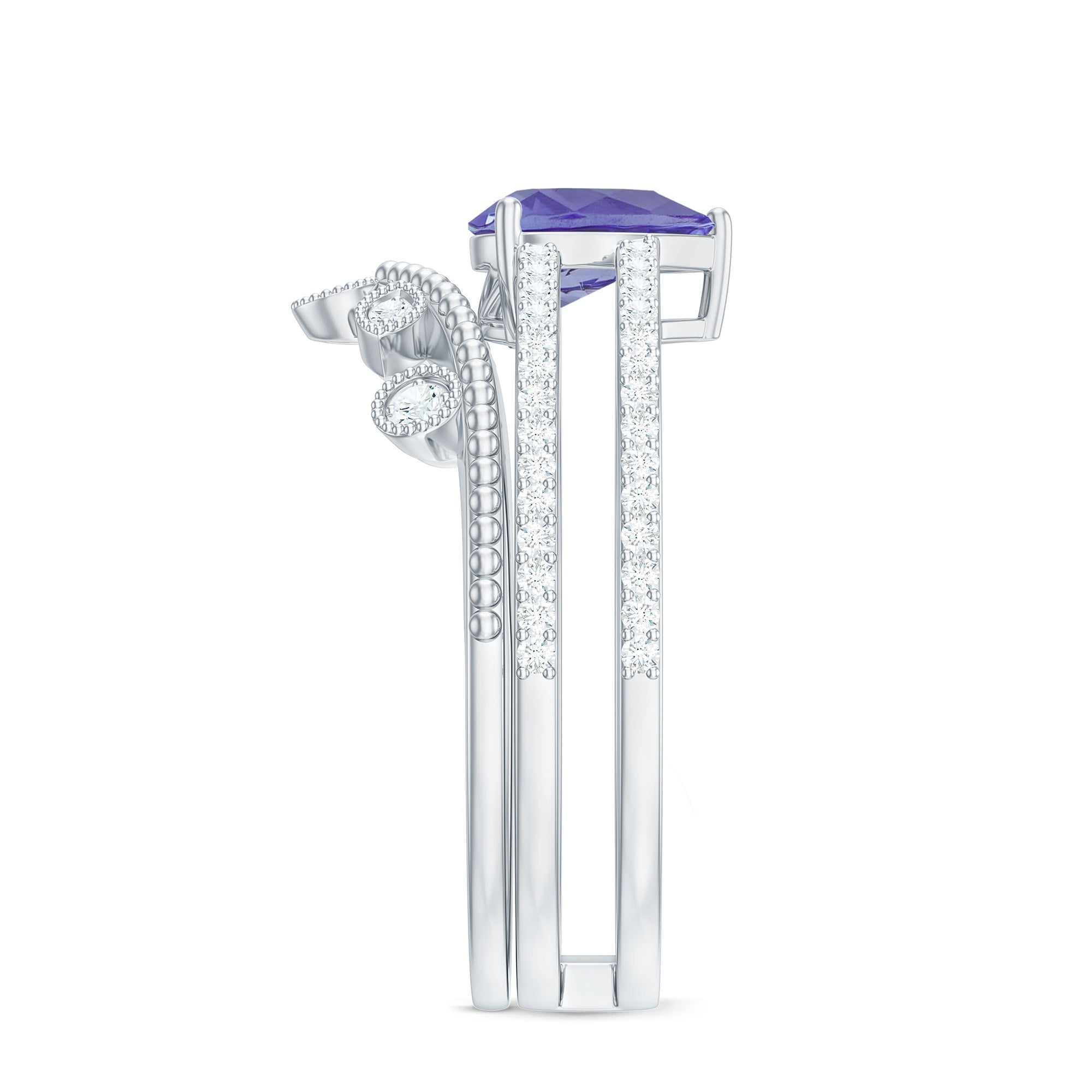 Prepare to be captivated by the mesmerizing beauty of this Bridal Ring Set. The centerpiece of this set is a stunning 5X7 MM Pear Cut Tanzanite, delicately set in a prong setting to showcase its brilliance and clarity. The solitaire ring is complemented by a Diamond band, creating a perfect blend of uniqueness and brilliance. This ring set is a true statement of refined taste and style. Let its beauty and charm adorn your finger and leave a lasting impression on all who behold it.