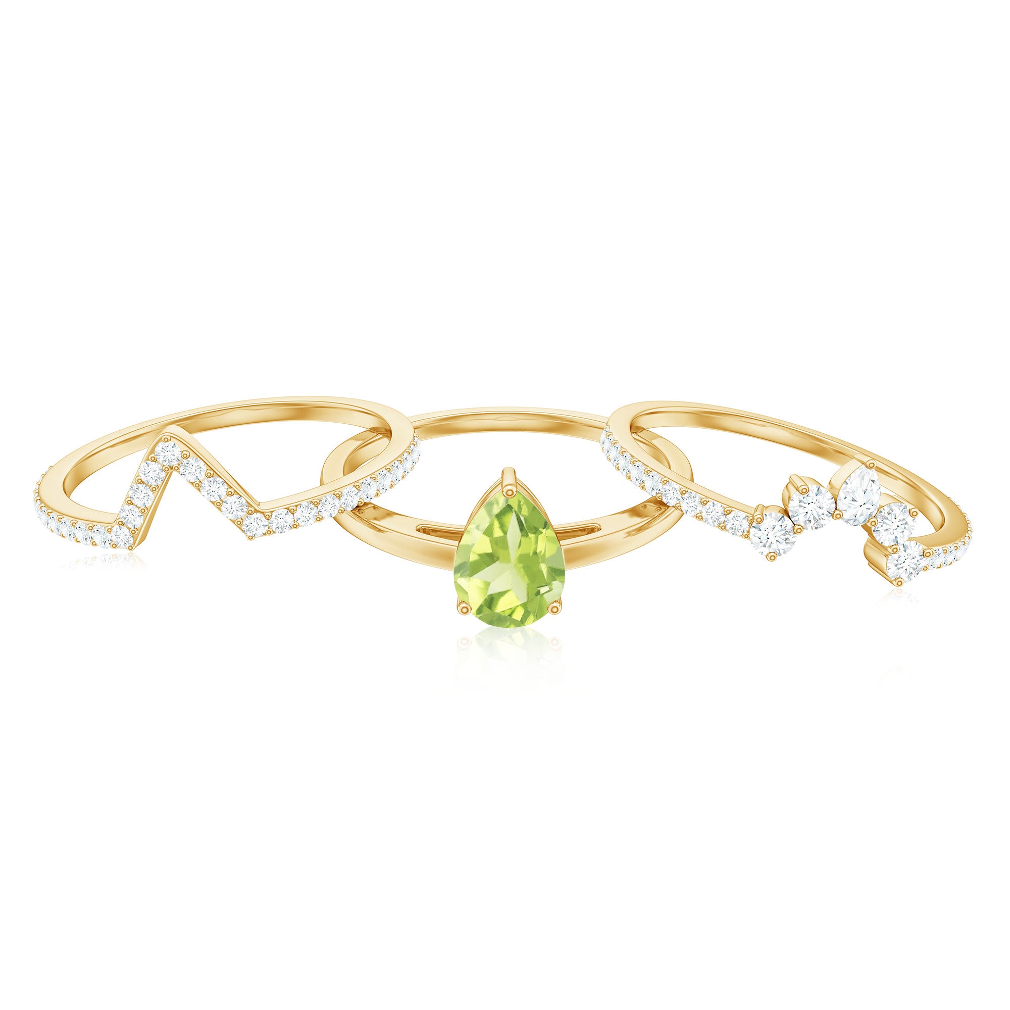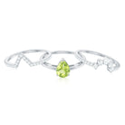 Make her big day even more memorable with this stunning Three Ring Set adorned with pear cut Peridot set as Solitaire in one ring with two enhancer featuring round moissanite stones. This Bridal Ring Set is a splendid choice for any woman, exuding elegance and sophistication. Surprise your lady with this exquisite moissanite ring set and let it be a cherished piece shell treasure forever, representing the beauty of your love on her big day.