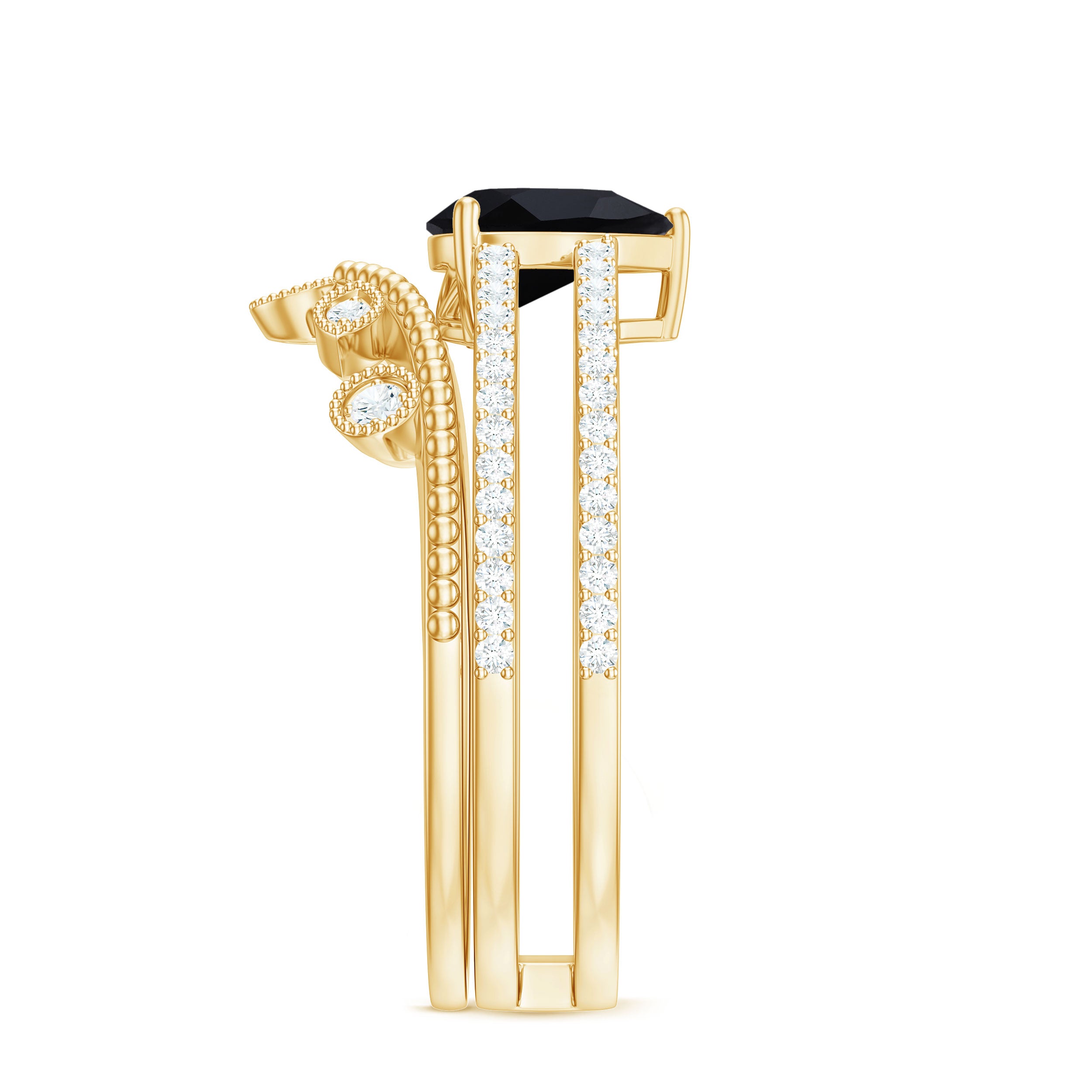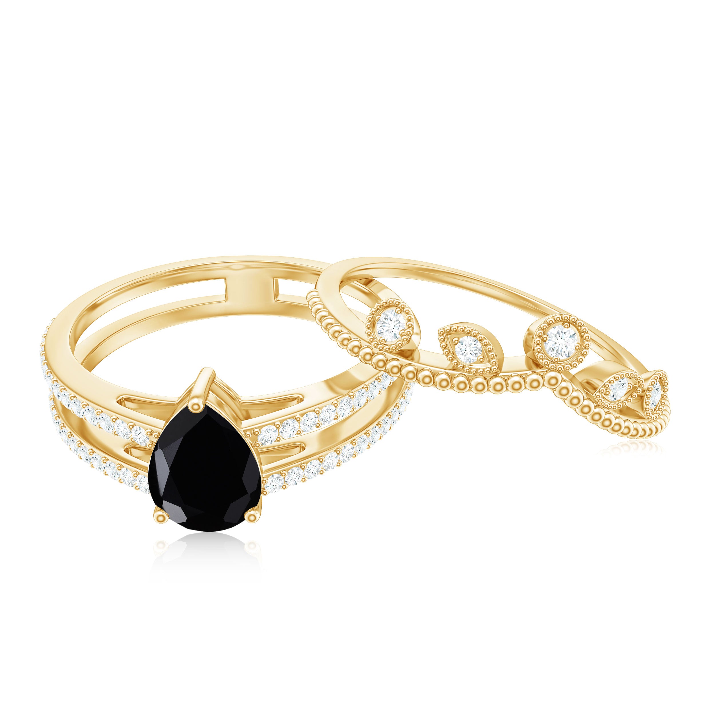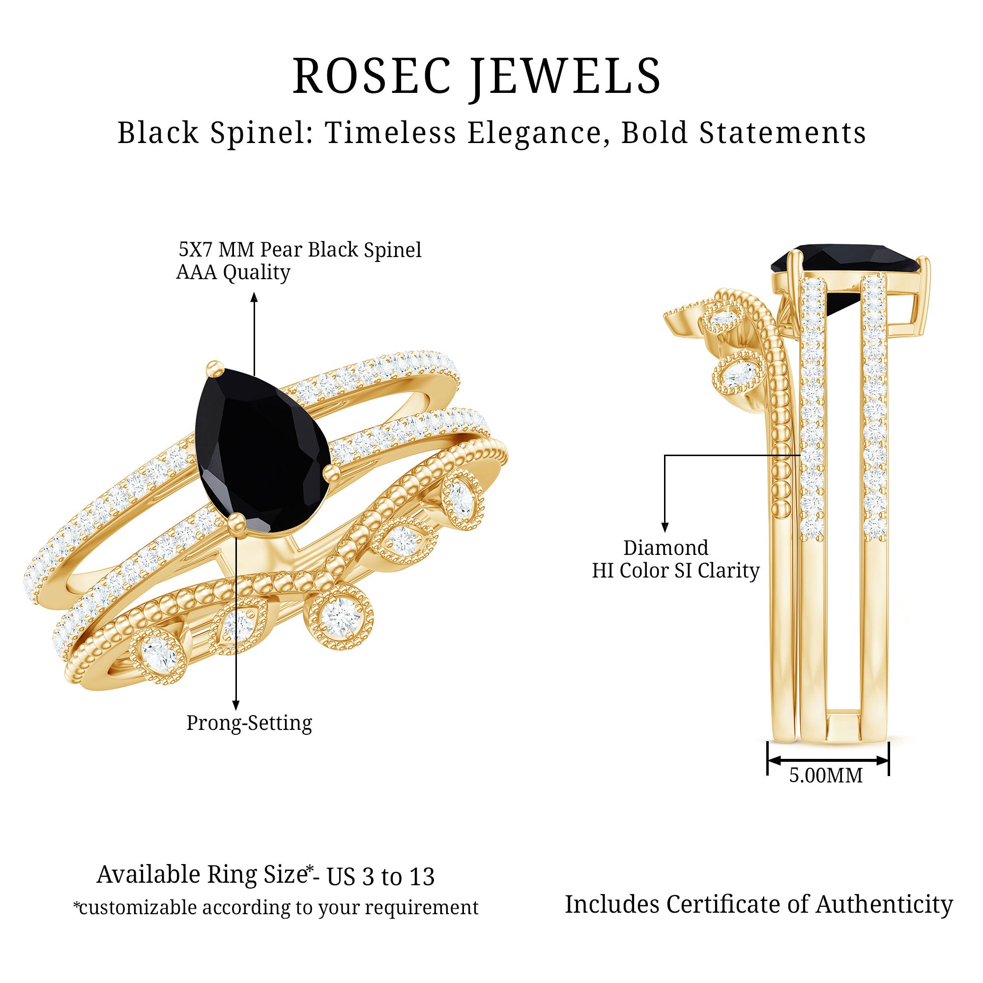 Prepare to be captivated by the mesmerizing beauty of this Bridal Ring Set. The centerpiece of this set is a stunning 5X7 MM Pear Cut Black Spinel, delicately set in a prong setting to showcase its brilliance and clarity. The solitaire ring is complemented by a Diamond band, creating a perfect blend of uniqueness and brilliance. This ring set is a true statement of refined taste and style. Let its beauty and charm adorn your finger and leave a lasting impression on all who behold it.