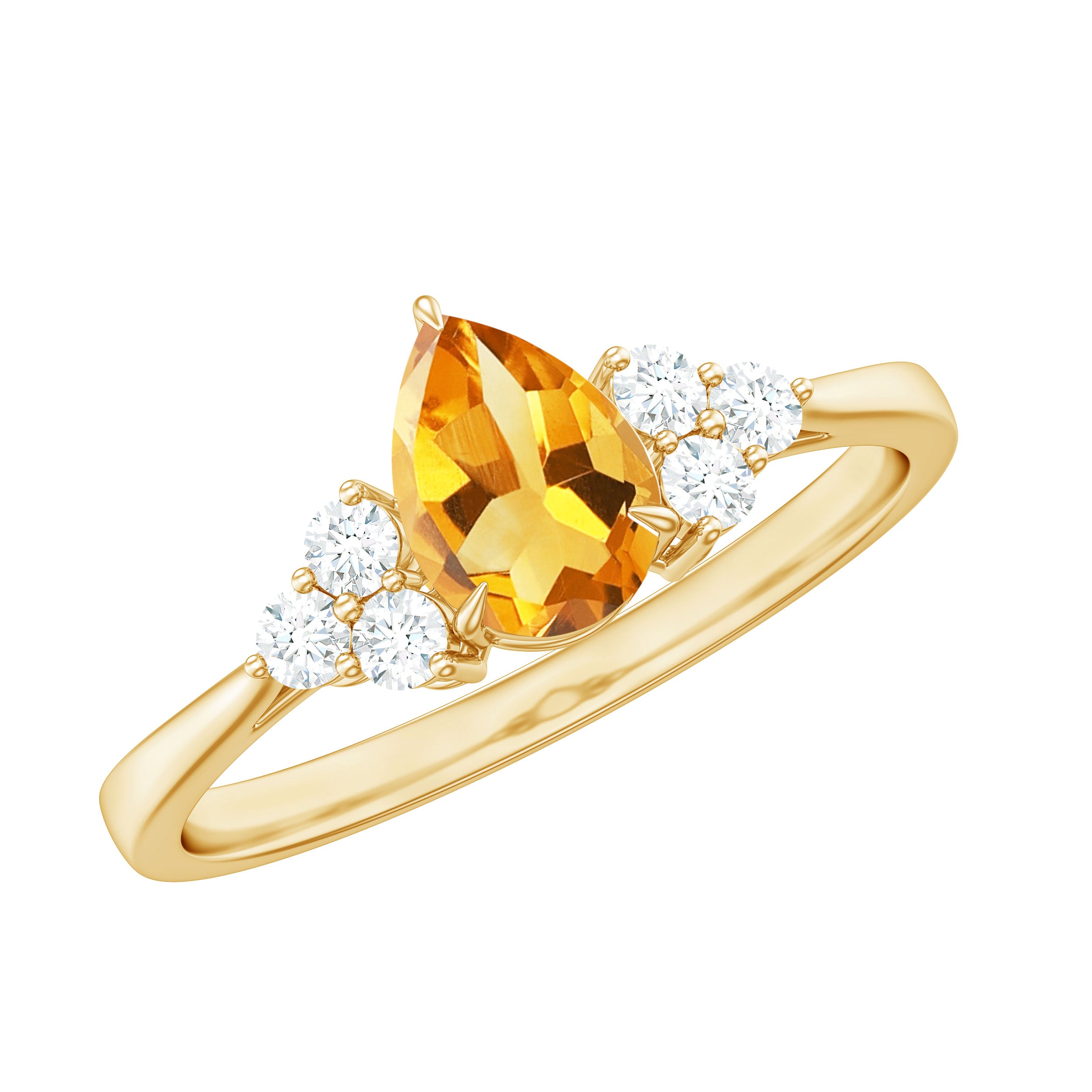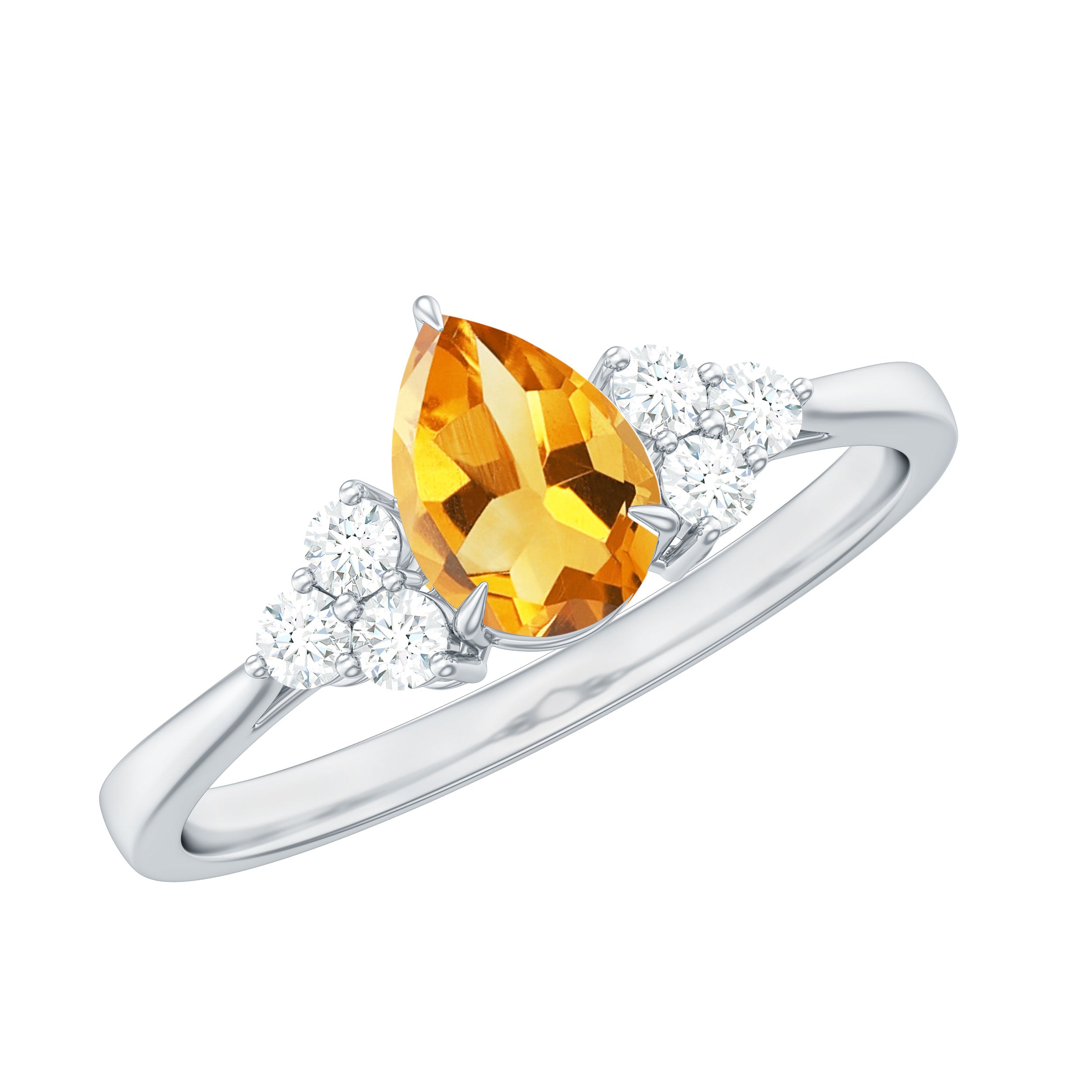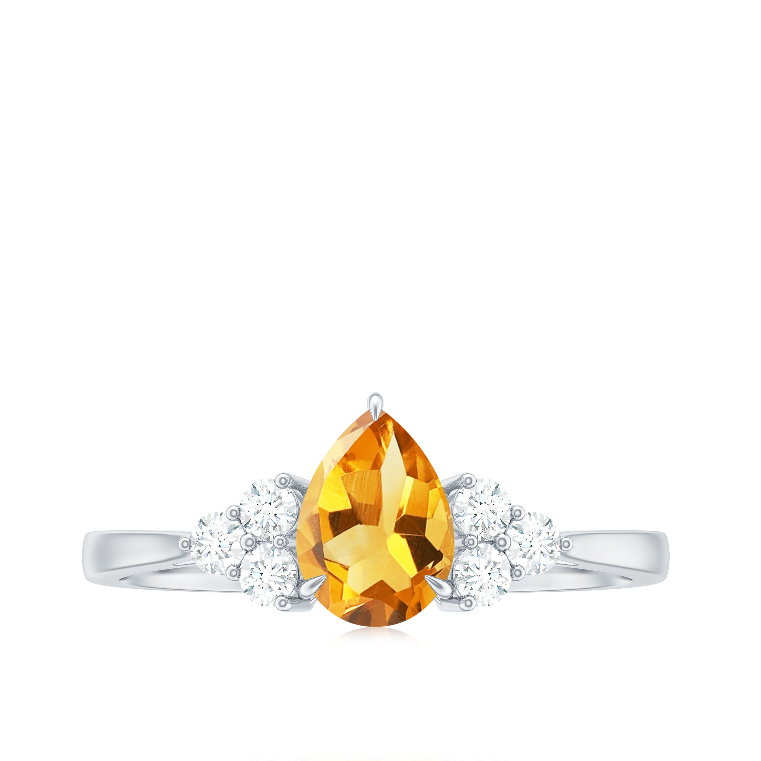 Pear Cut Real Citrine Solitaire Ring with Diamond Trio