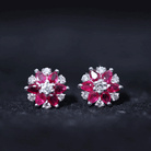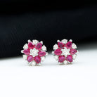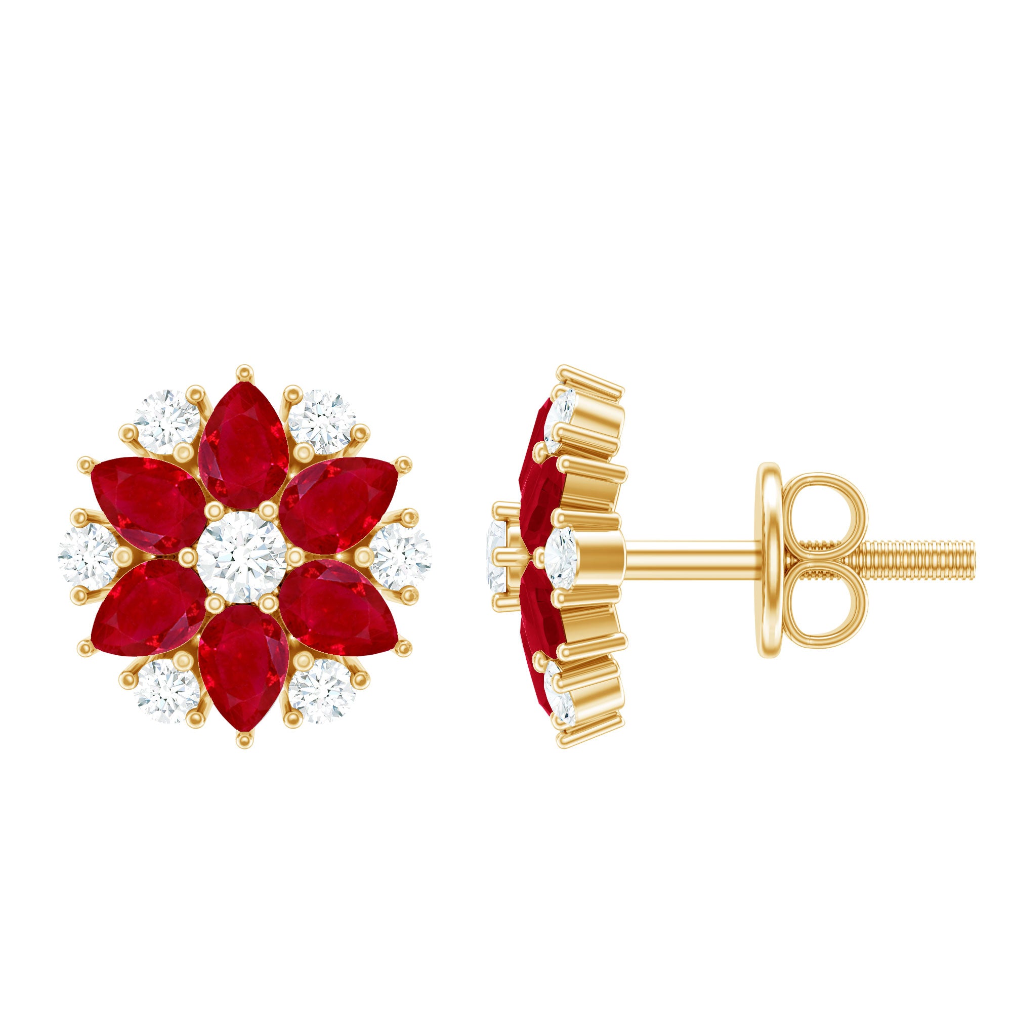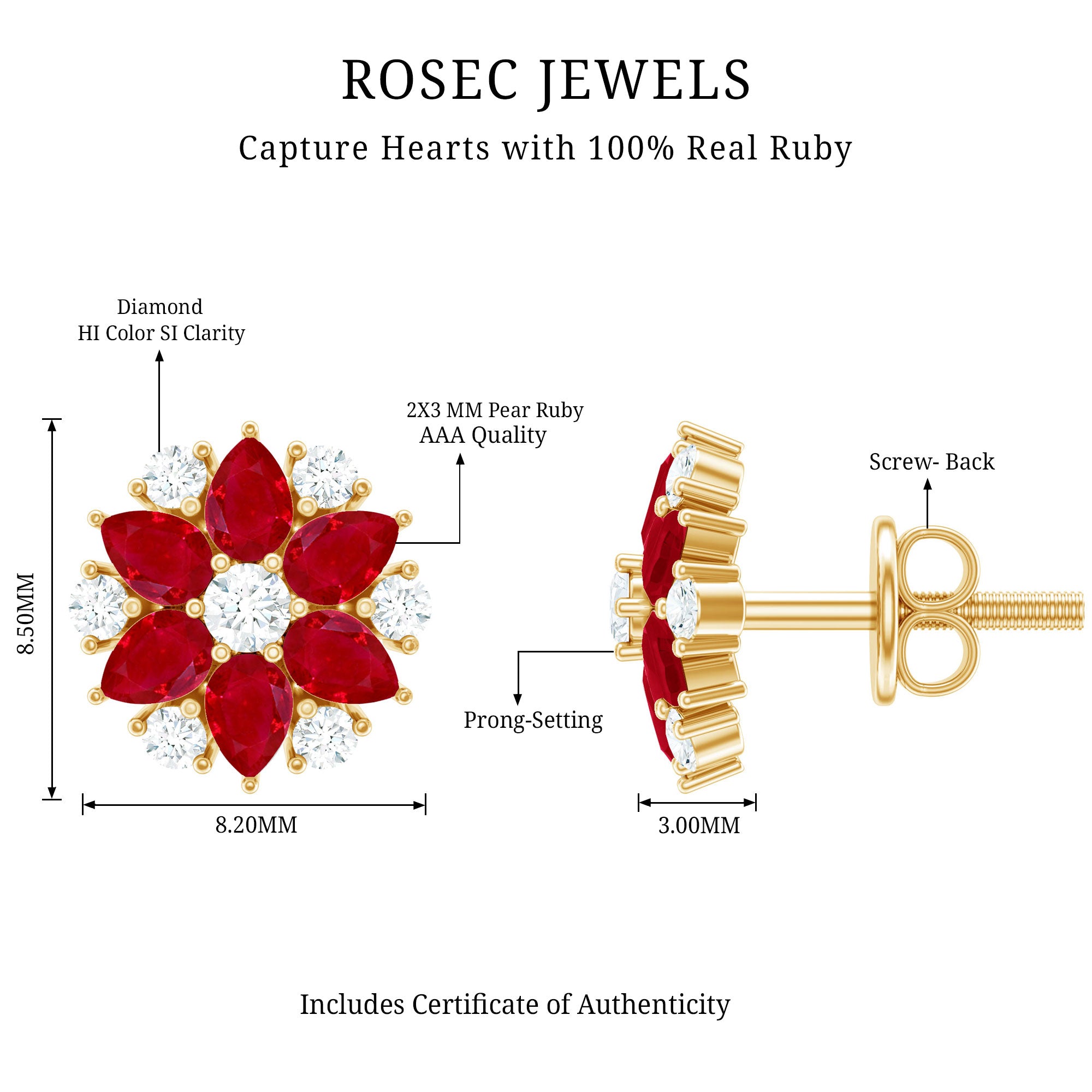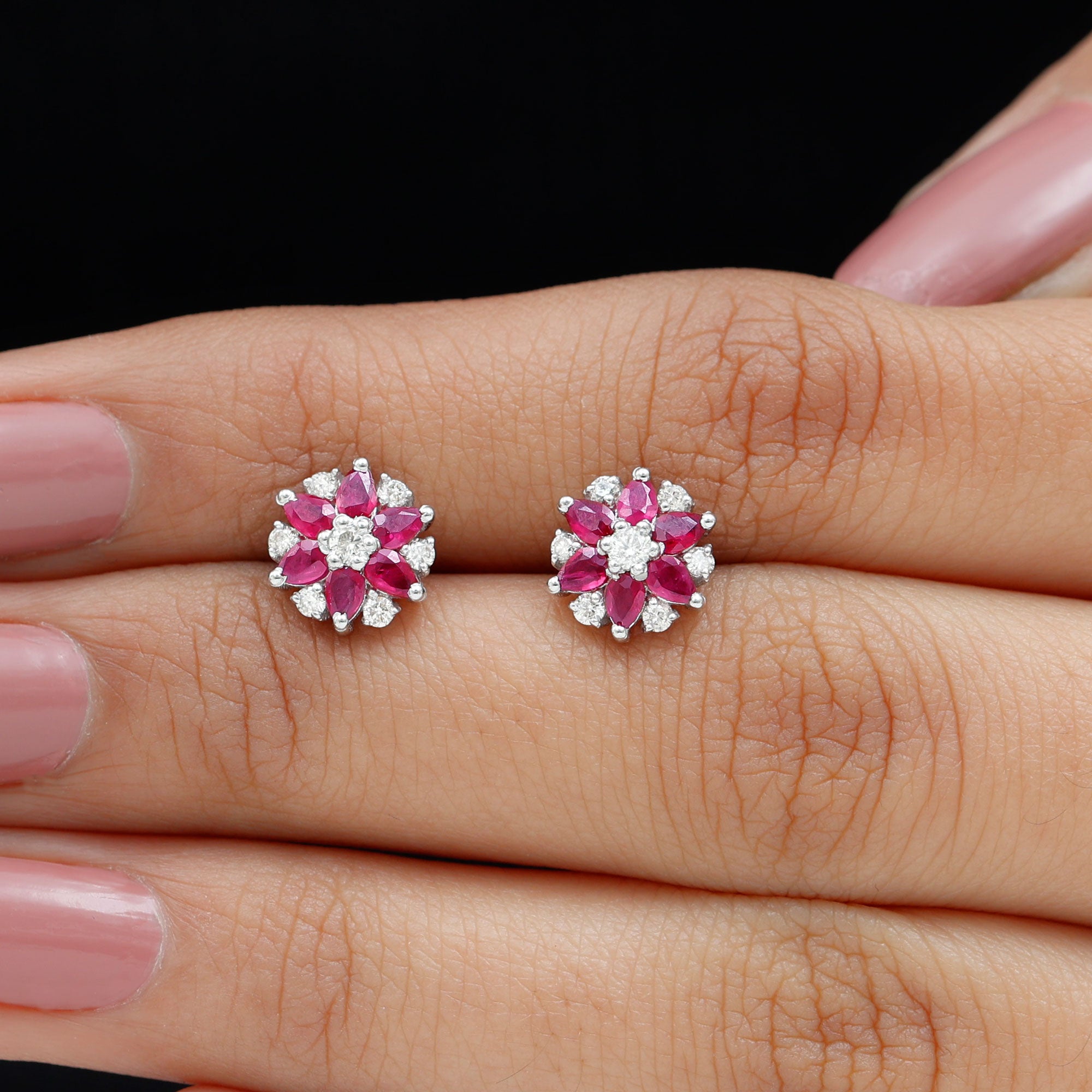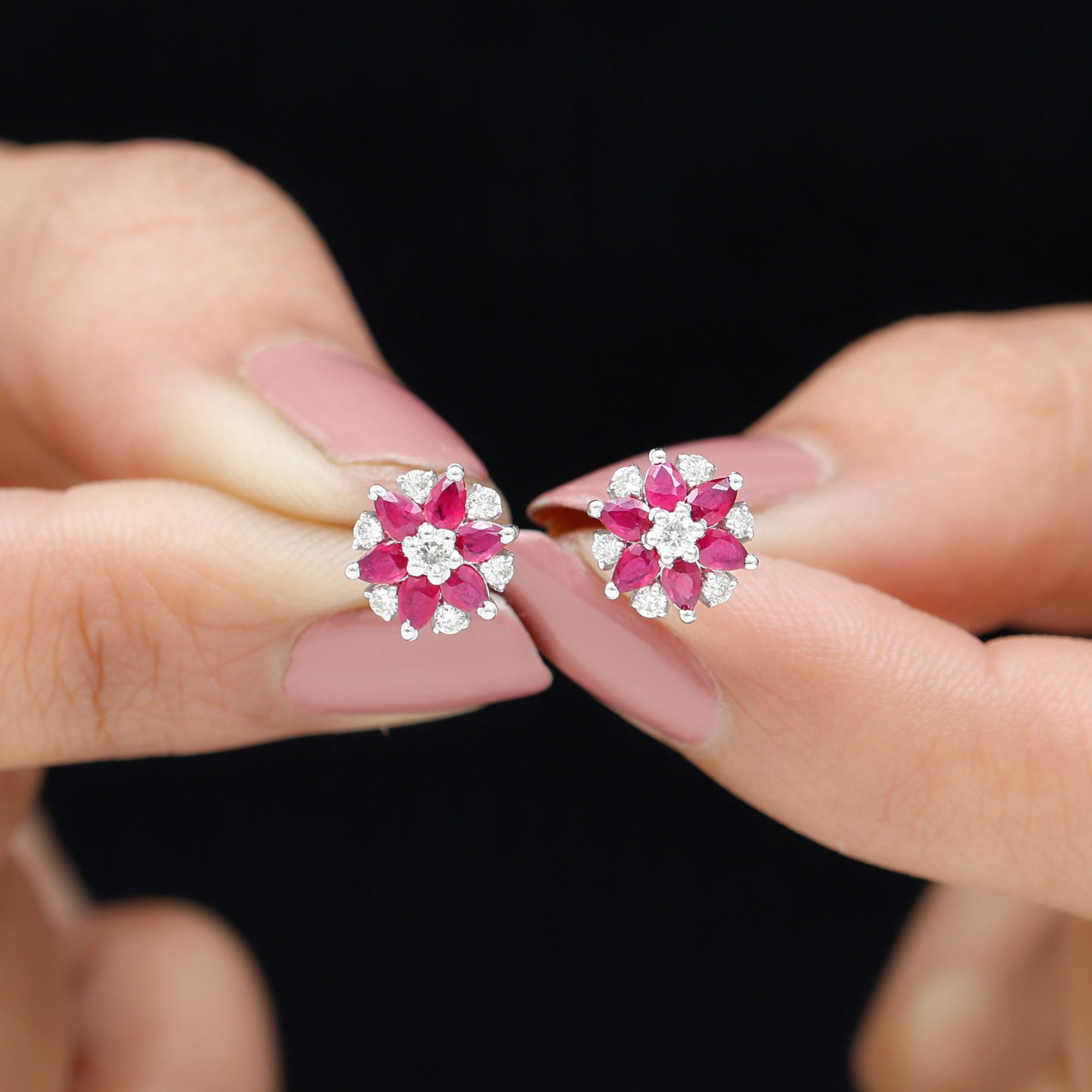 Pear Cut Ruby and Diamond Flower Stud Earrings