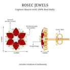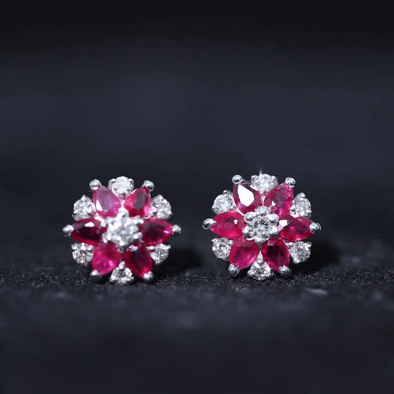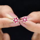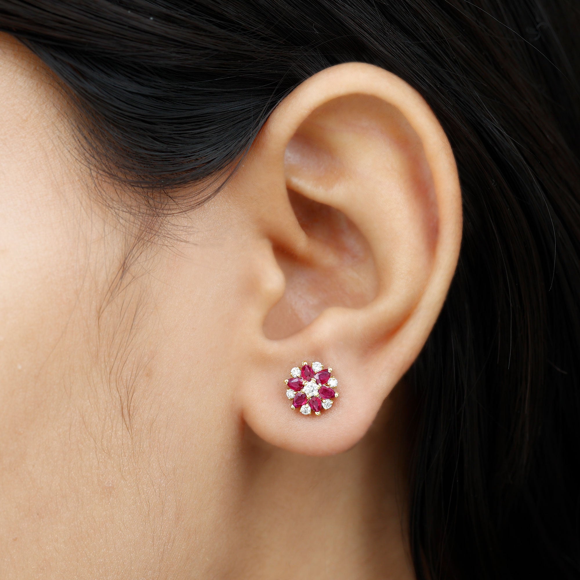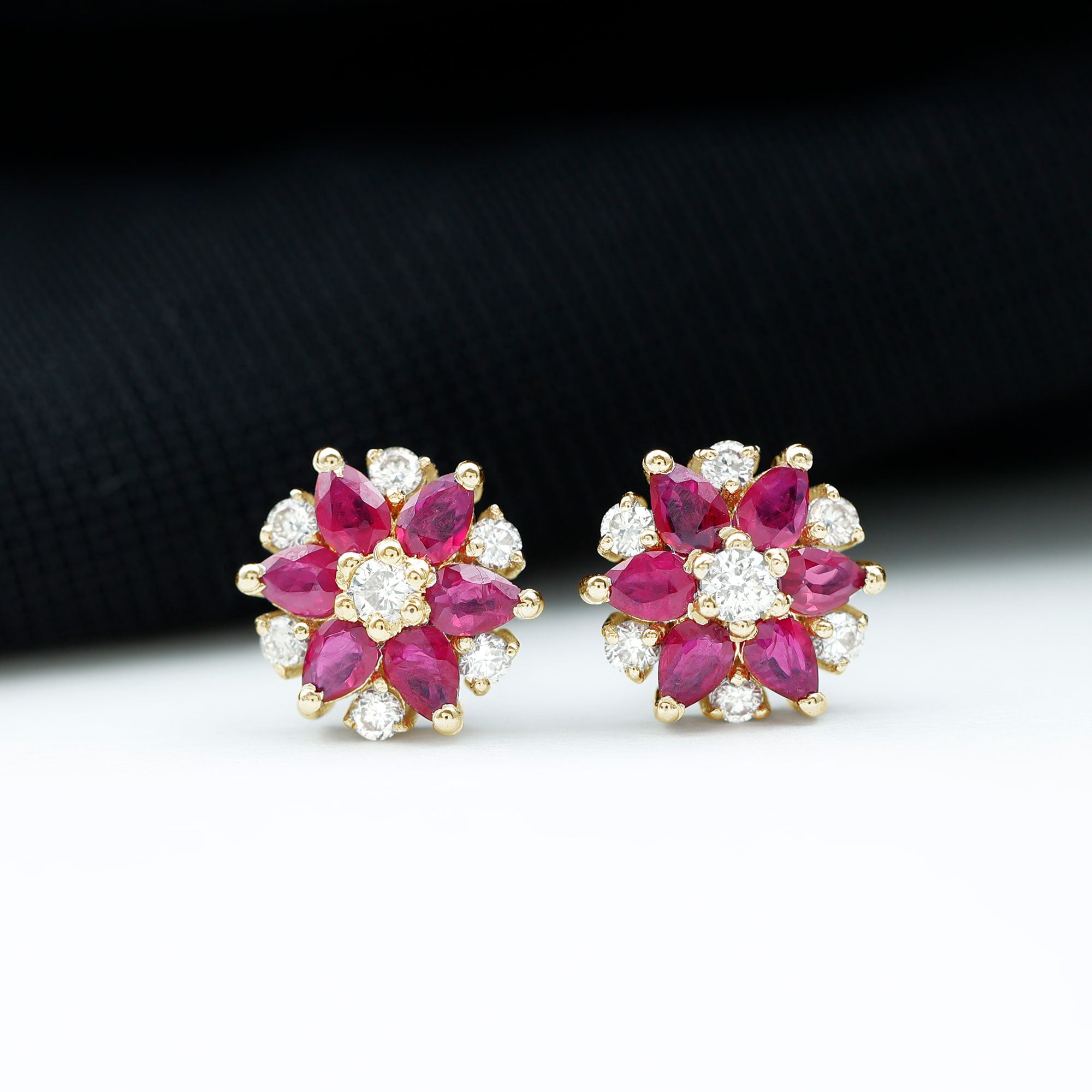Adorn yourself with the enchanting beauty of these Flower Stud Earrings. The lustrous Pear Cut Rubies take center stage, surrounded by a delicate arrangement of sparkling Diamond Stones, creating a captivating floral design. These ruby and Diamond earrings are a perfect blend of elegance and charm, adding a touch of glamour to any look.