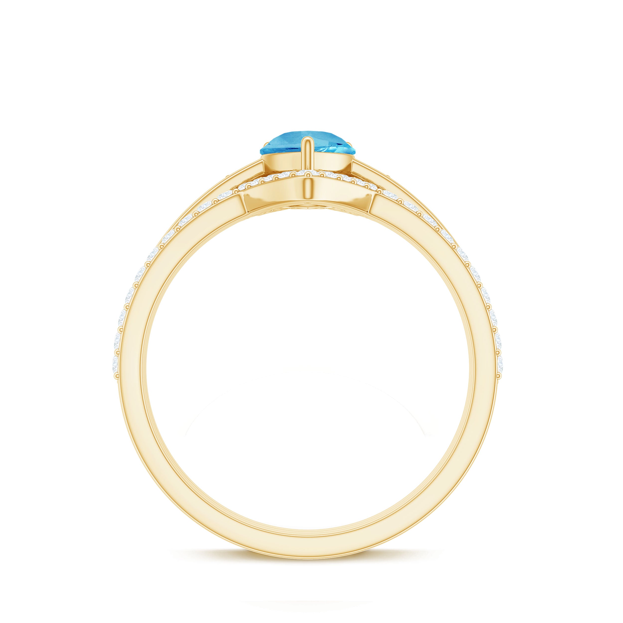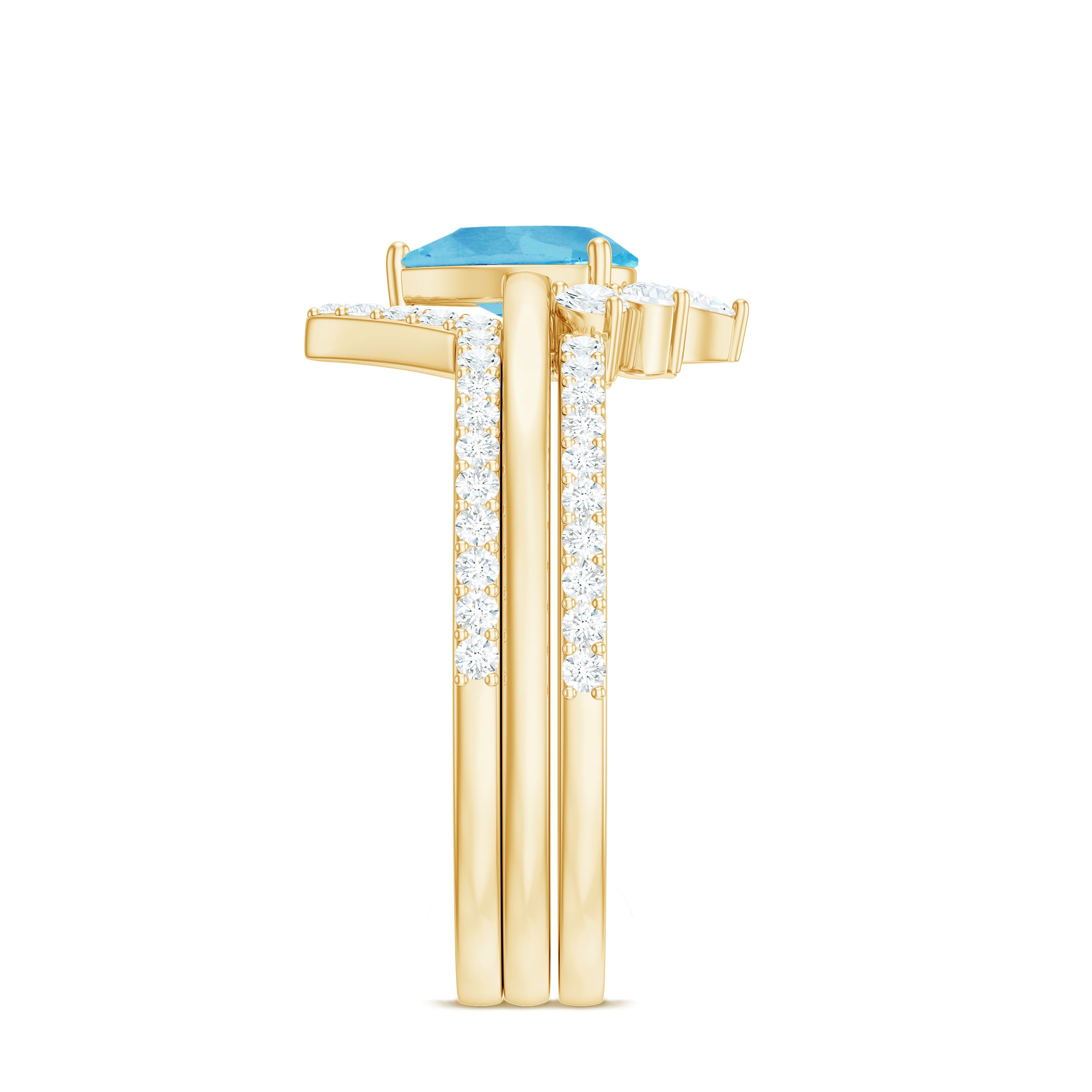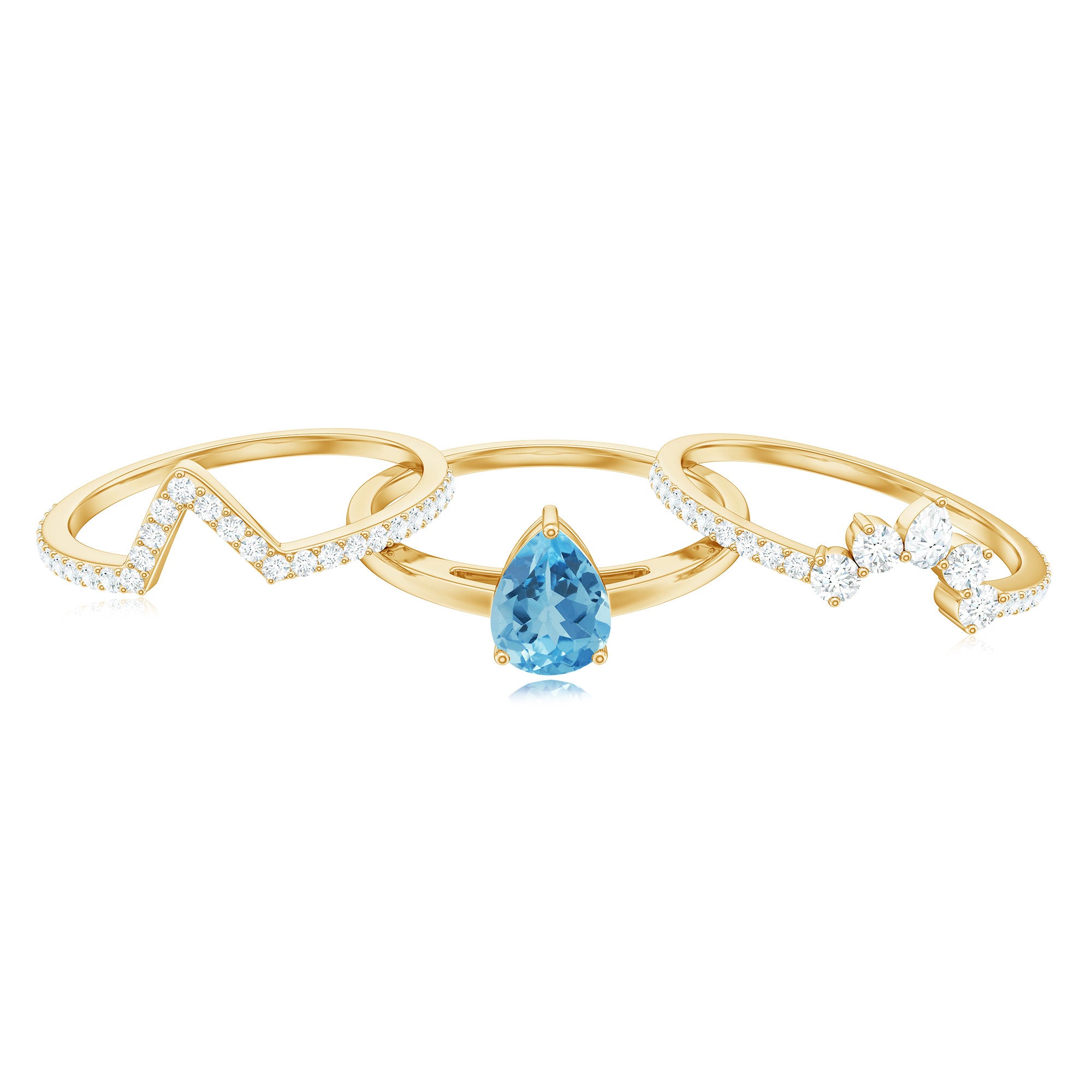 Make her big day even more memorable with this stunning Three Ring Set adorned with pear cut Swiss Blue Topaz set as Solitaire in one ring with two enhancer featuring round moissanite stones. This Bridal Ring Set is a splendid choice for any woman, exuding elegance and sophistication. Surprise your lady with this exquisite moissanite ring set and let it be a cherished piece shell treasure forever, representing the beauty of your love on her big day.