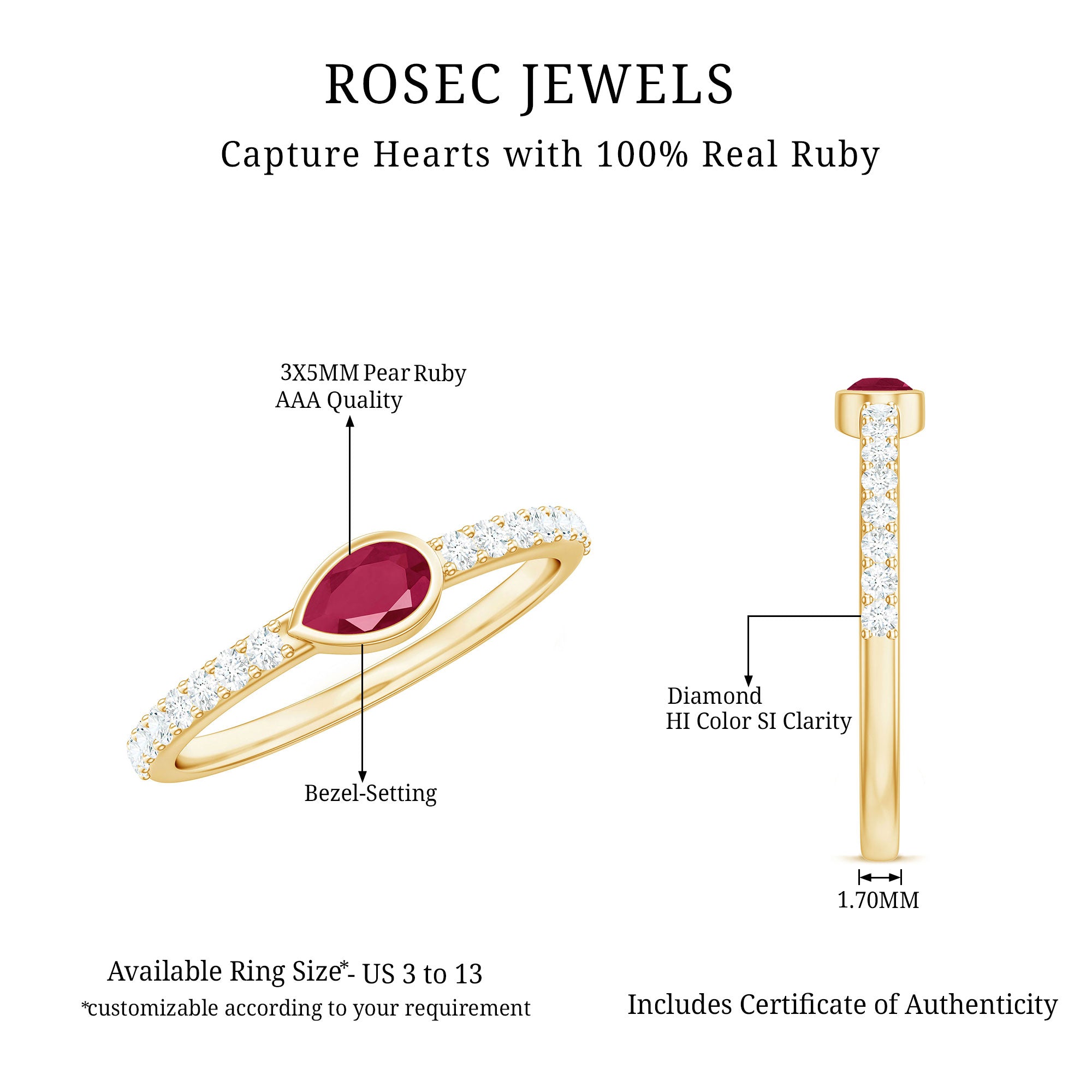 Discover a fresh take on timeless elegance with our Ruby Promise Ring. This exquisite piece redefines classic style with its uniquely Pear Shaped Ruby in Bezel Setting having the dazzling contrast of fiery rubies and sparkling Diamond as Side Stones. This Ruby and Diamond Ring is known for its captivating red hue horizontally for a modern twist, this Natural Ruby is elegantly flanked by shimmering Diamonds that accentuate its vibrant color and enhance its dazzling brilliance. This Pear Shaped Ruby Ring has a stunning design that adds a touch of luxury. Perfect for expressing your love and commitment, this Womens Promise Ring has a contemporary flair that makes it an ideal choice for those who appreciate distinctive, eye-catching designs, that speak volumes. Celebrate your bond that is exceptional and timeless as your love story and make your every moment shine brightly with elegance and passion.