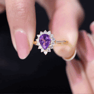 Adorned with a lustrous pear-shaped Amethyst encircled by a halo of brilliant round-cut diamonds, our Vintage Engagement Ring exudes timeless charm. This Amethyst Engagement Ring is the perfect choice for discerning women seeking an ideal piece of enduring beauty.