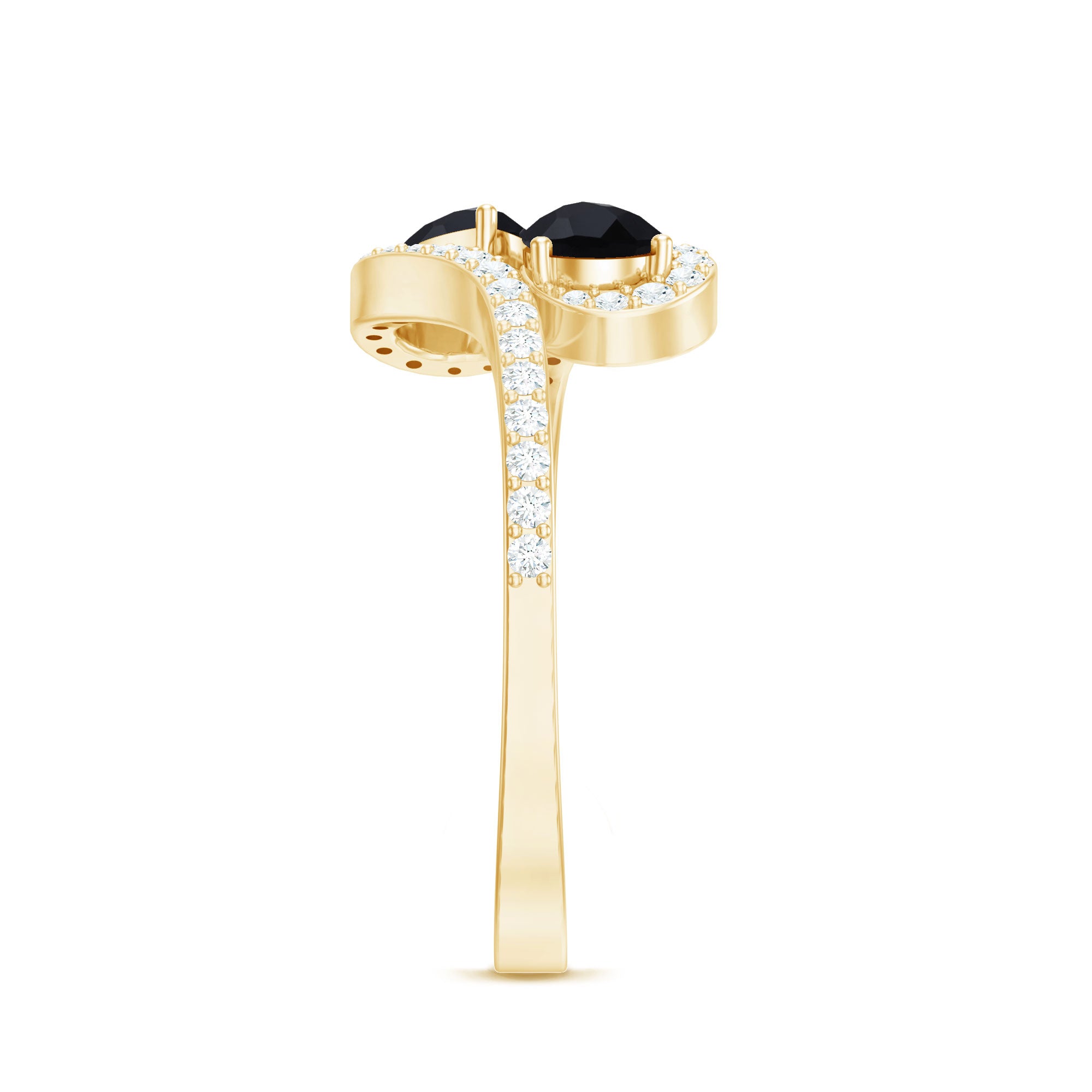 This vintage-inspired two-stone ring features two exquisite 6X8mm pear-cut Black Onyx stones, elegantly set in a prong setting over a bypass shank adorned with smaller diamond stones that enhance its sparkle and brilliance. The design of this Toi Moi ring is timeless, infused with a touch of old-world charm that remains perpetually fashionable. Crafted with meticulous attention to detail and utilizing only the highest quality materials, this Bypass Engagement ring serves as a perfect emblem of enduring love and commitment. Whether intended as an engagement ring or a gift for a special occasion, this ring is guaranteed to impress and bring joy. The elegant bypass shank, adorned with subtle moissanite details, introduces a contemporary flair and symbolizes the beautiful intertwining of two lives as they progress together as one. This Two Stone Engagement Ring transcends mere adornment; it commemorates the bond and chemistry shared, meticulously designed to celebrate your distinctive love narrative. Delivered in a sophisticated signature jewelry box and offered in multiple sizes, this Real Onyx Ring for Women is tailored for a perfect fit, ensuring your memorable occasion is truly unforgettable. Its eye-catching design sparks conversations and infuses a touch of enchantment into any proposal or significant celebration.