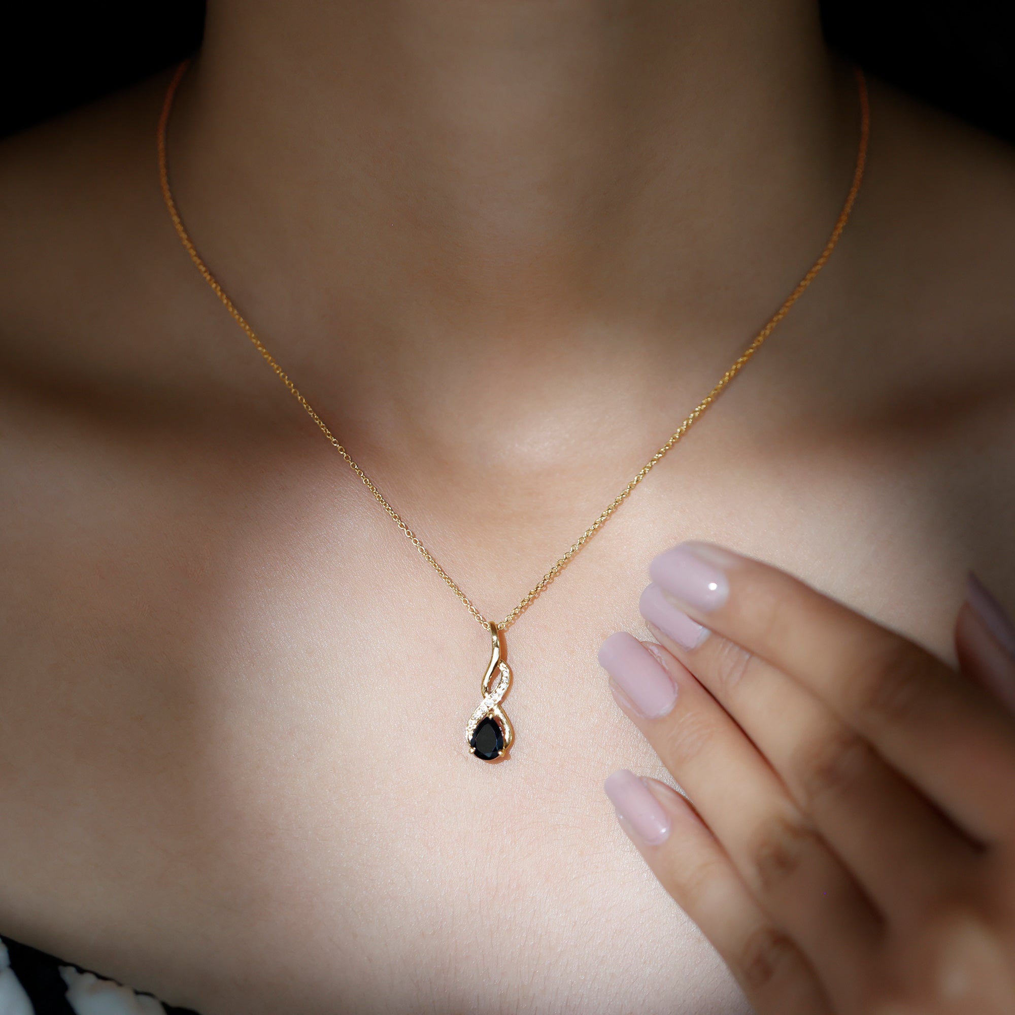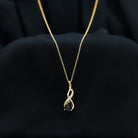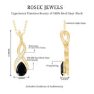 It is a Infinity Pendant Necklace for Women mounted in Solid Gold consisting of Pear Cut Black Onyx Solitaire embellished in Prong Setting with Round Brilliant Moissanites embellished in Pave Setting on the Infinity Pattern.