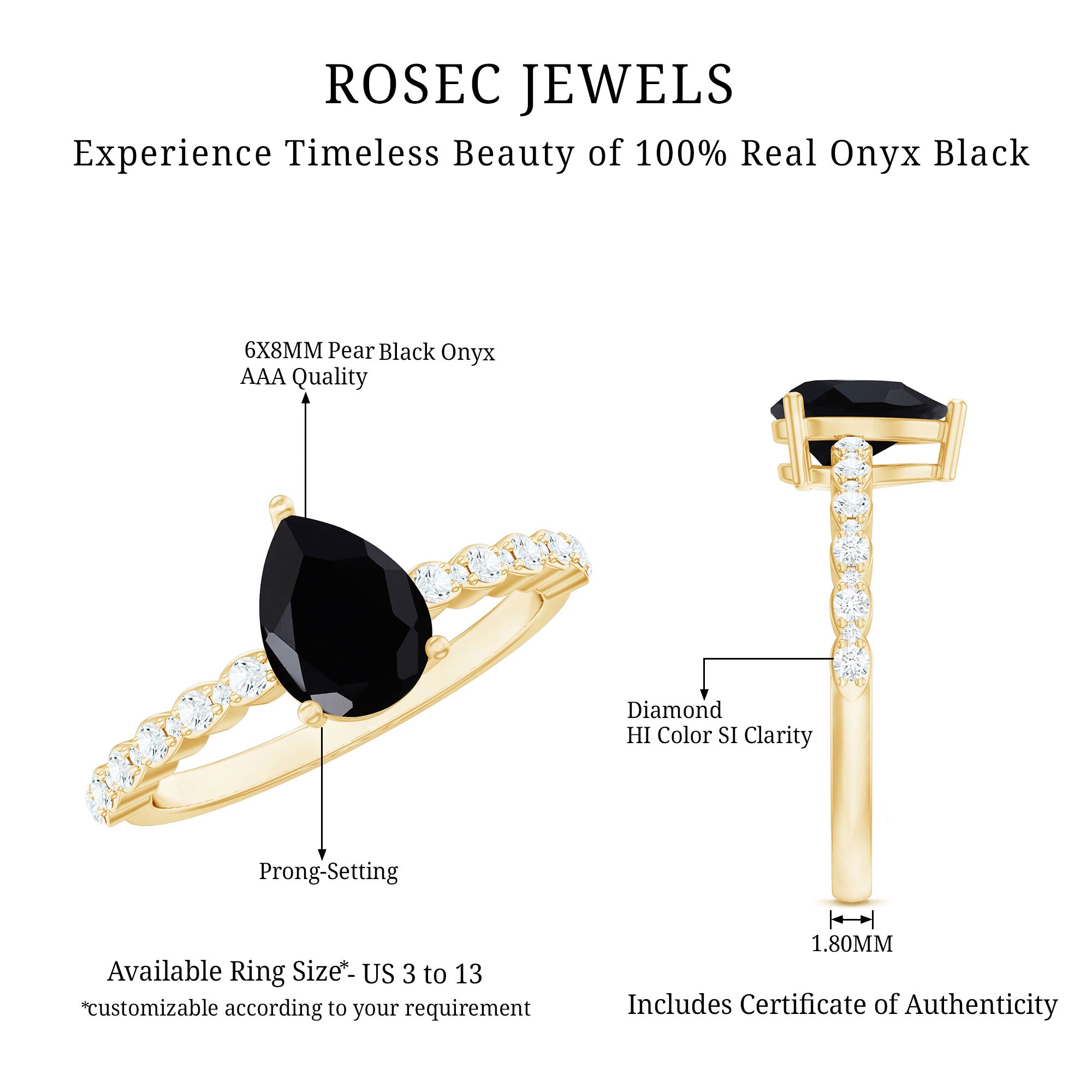 This pear shape black onyx solitaire promise ring with diamond is a unique and stylish piece of jewelry that is perfect for any occasion. This exquisite ring features a 5X7 MM pear shape black onyx center gemstone flanked by sparkling diamond side stone. The ring comes in a 3 prong setting. The black onyx gemstone is known for its grounding and protective properties, while the diamond adds a touch of luxury and sparkle. This is the perfect way to keep your promise alive with your partner.