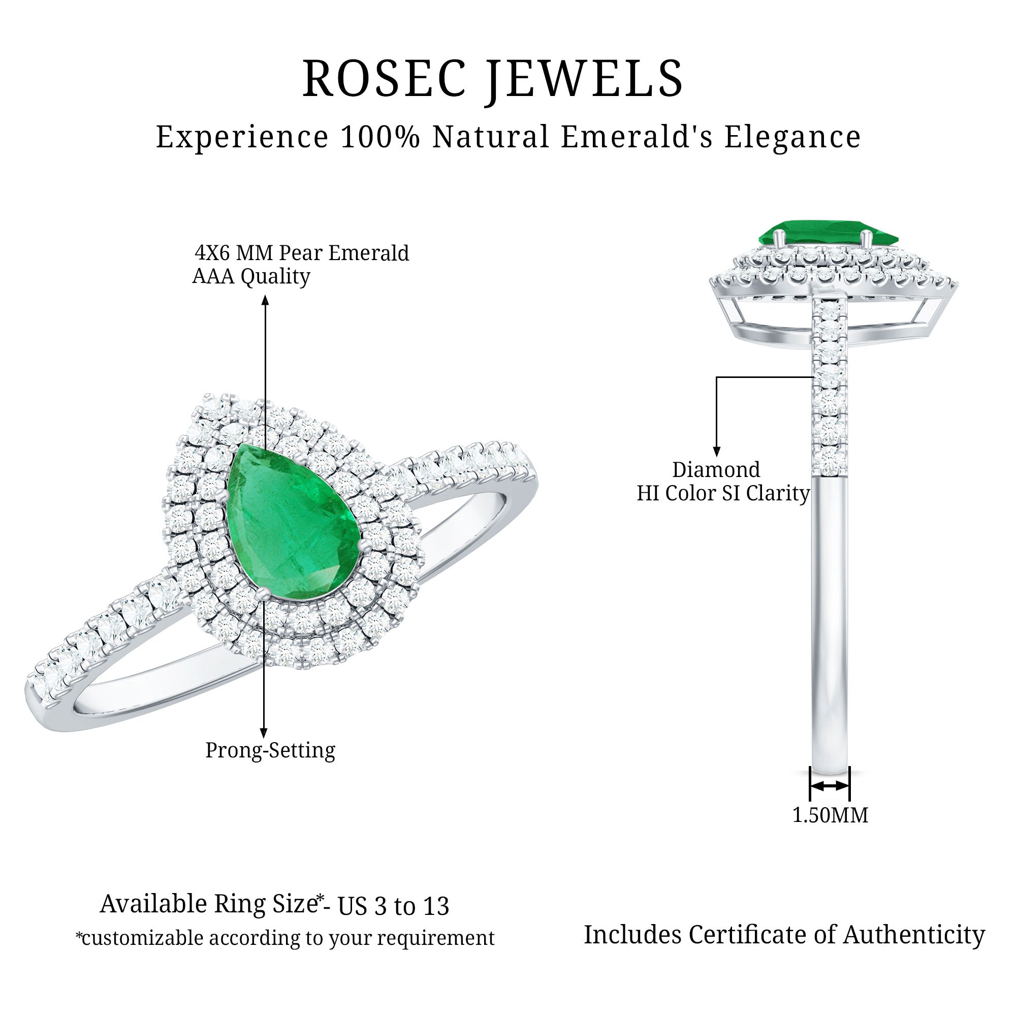 Embrace the essence of everlasting love with this enchanting Teardrop Engagement Ring, a piece that captures emotion in its purest form. The mesmerizing 4X6 mm Pear Shape Emerald set in Prong Setting gleams with rich green allure, symbolizing a love that continues to grow. Surrounding it, a breathtaking Double Halo of Diamond stones enhances its glow, creating a dazzling play of light that feels like a celebration of every heartbeat shared. Along the slim, Diamond studded band, each sparkling stone adds a whisper of elegance and grace, making this Emerald Diamond Engagement Ring a true embodiment of sophistication and sentiment. Designed for the woman whose love story is as timeless as it is unique, this Double Halo Engagement Ring exudes both modern beauty and classic romance. Perfect for a proposal, anniversary or promise of forever, this Pear Shaped Engagement Ring with Emerald arrives in a signature jewelry box and is available in a range of ring sizes for the ideal fit. With its captivating contrast of emerald and diamond, this Emerald Ring for Women is a reflection of a love that shines endlessly.