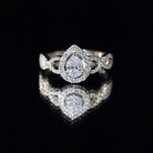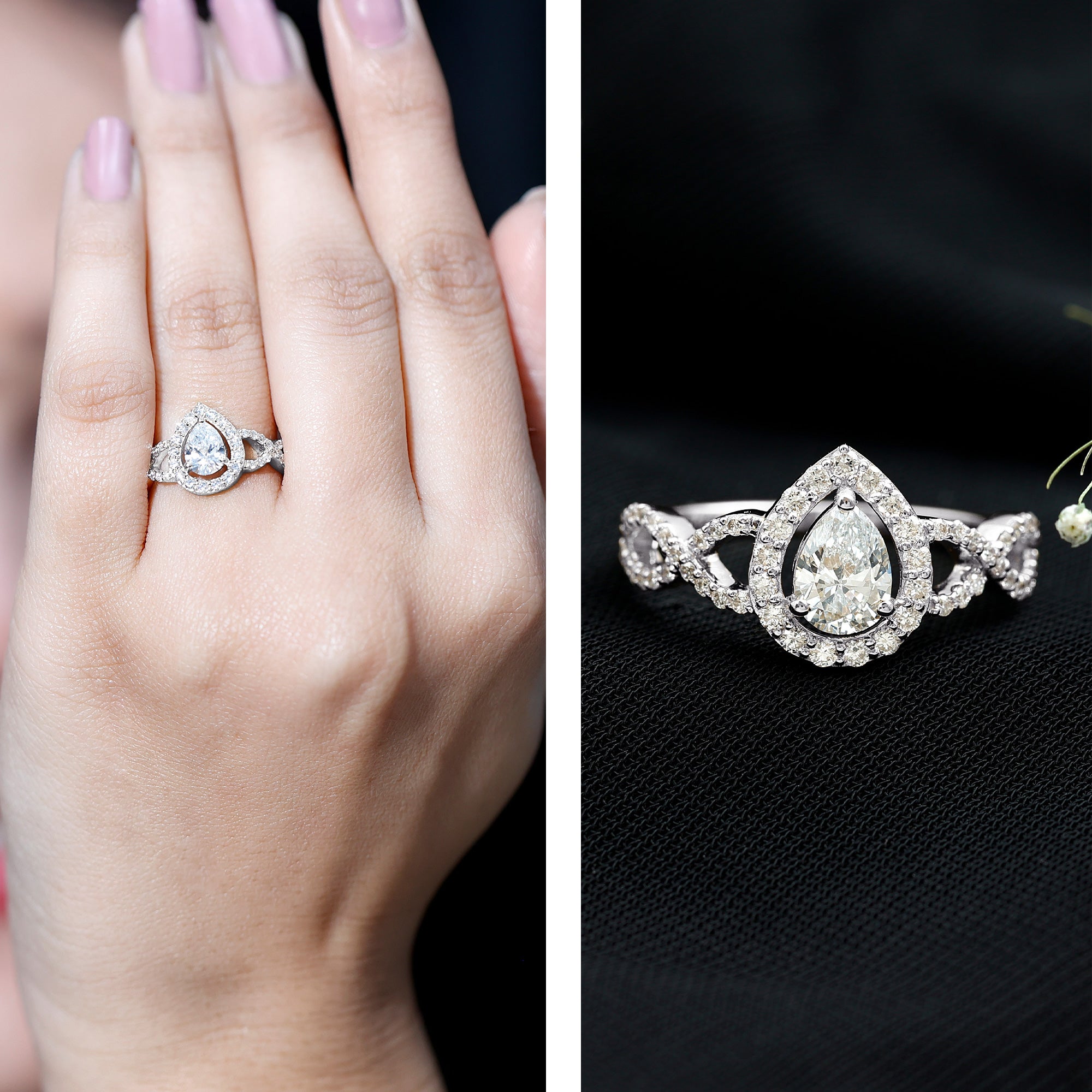 This exquisite Engagement Ring features a 5X7 MM Pear Shape Lab Grown Diamond encircled by sparkling Halo. Set in a graceful teardrop design over the Crossover Shank, the Simulated Diamond sparkles with timeless elegance. With its captivating beauty, this ring is a symbol of your commitment to your partner. Celebrate your love story with this unique engagement ring.