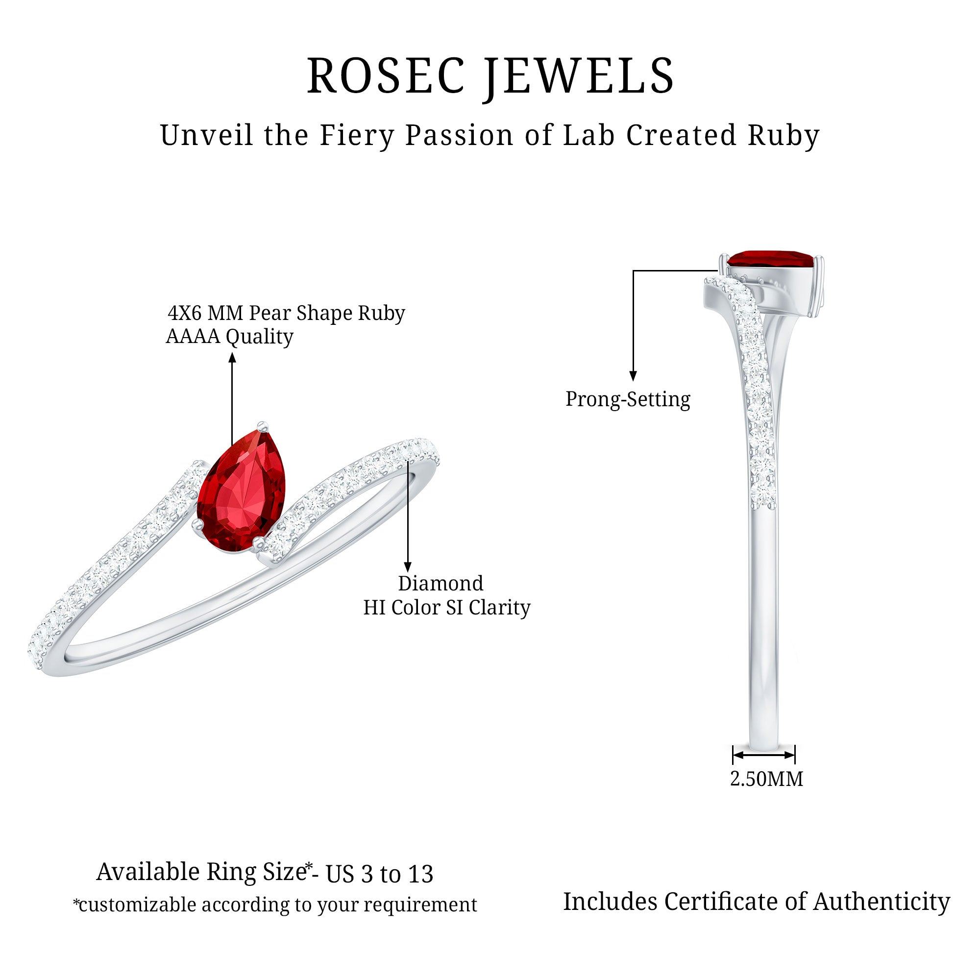 This elegant promise ring features a tilted pear shaped created ruby and sparkling Diamond gemstones set on bypass shank. The deep red hue of the created ruby is complemented by the brilliance of the Diamond stones, which are expertly placed to highlight the beauty of the center stone. With its timeless design and exceptional quality, this created ruby promise ring is a beautiful and meaningful way to symbolize your love and commitment.
