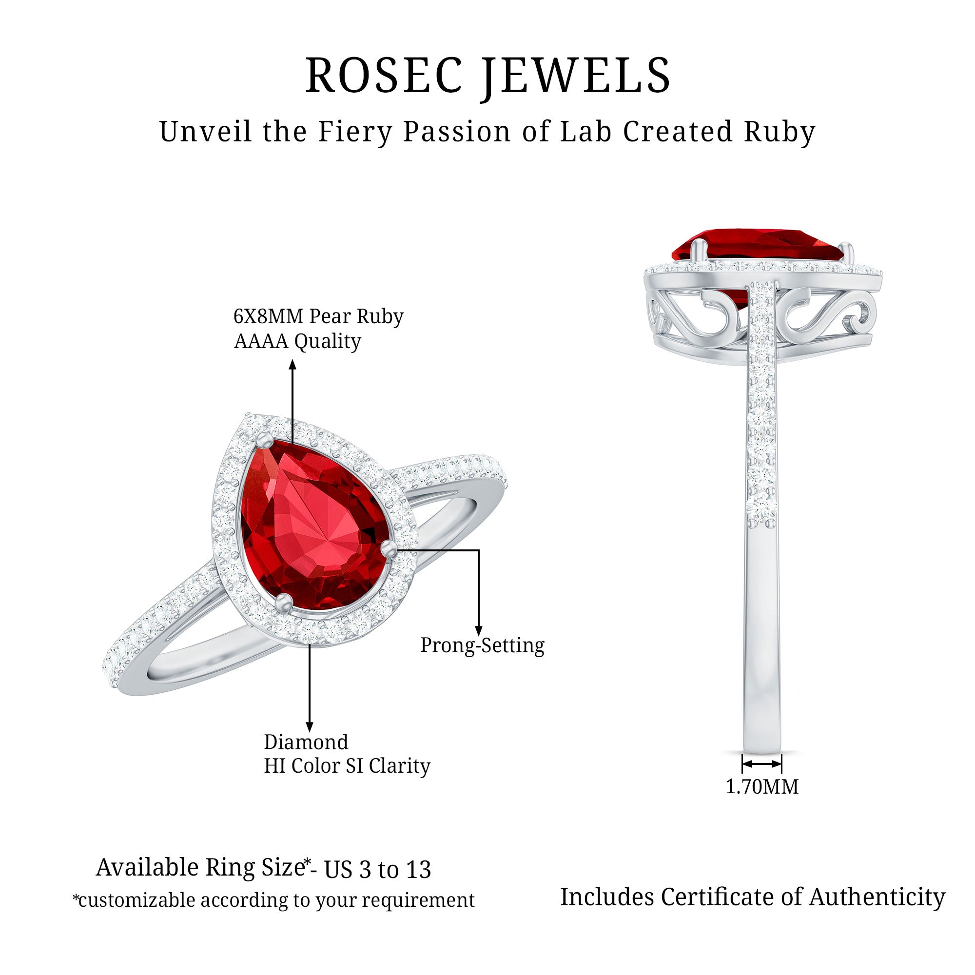 Elegance meets innovation in our Teardrop Engagement Ring, adorned with a dazzling Diamond Halo. Crafted with precision and passion, this ring exudes timeless allure, combining the rich allure of a 6X8 MM Pear Shape Created Ruby set in 3 Prong Setting with the brilliant sparkle of a Diamond halo. A symbol of love and sophistication, this exquisite piece is a radiant choice for those seeking a unique and modern craftsmanship.