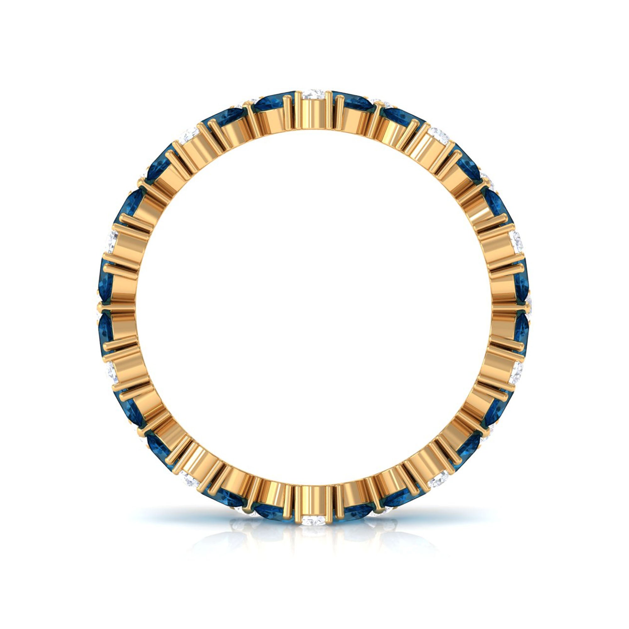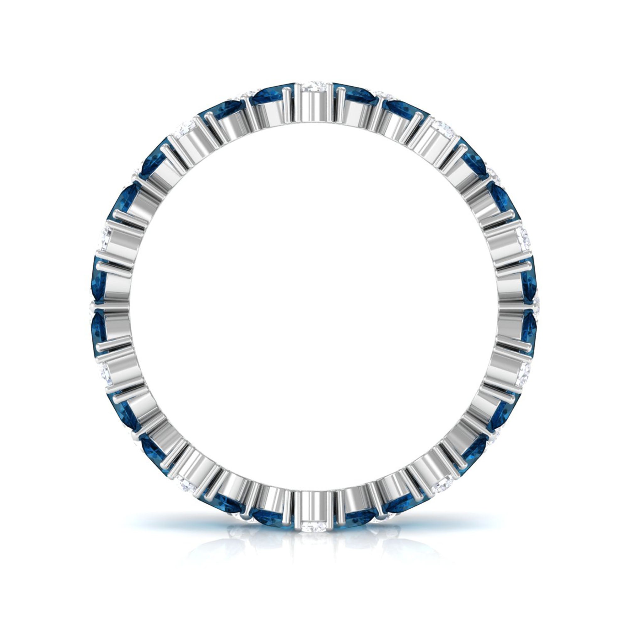 Step away from the conventional with this eye-catching Blue Topaz Wedding Band that introduces contrast and harmony to your jewelry collection. Crafted with an imaginative blend of shapes and hues, it is designed to stand out in a subtle yet sophisticated manner. This refined Full Eternity Band showcases alternating pear-shaped london blue topaz gemstones and round moissanites, providing a rhythm and flow that embodies both modernity and tradition. The rich blue of the topaz contrasts beautifully with the brilliant clarity of the moissanites, resulting in a striking appearance. Each stone is secured in a prong setting to ensure the design remains stable and smooth against the finger. Whether combined with other rings or worn alone, this Eternity Stacking Ring imparts a fashionable edge to your ensemble. It is a convenient choice for daily wear while also being elegant enough for special occasions. Constructed with AAA quality london blue topaz and D-VS1 quality moissanites, along with expert craftsmanship, this piece guarantees both durability and aesthetic appeal. The contrasting stones and sleek band make it a ring you will consistently choose. For those who appreciate a monochromatic style infused with creativity, this blue topaz and diamond ring is an ideal selection.