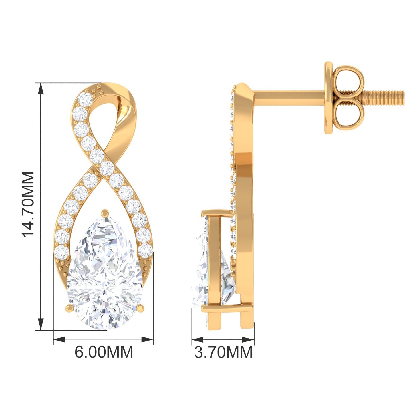 Share your infinite love with your partner with this pear shape moissanite infinity stud earrings. These stunning earpieces feature 5X7 MM pear-shaped moissanite center stone encased in graceful infinity symbols and small round moissanite are encrusted over the infinity symbol, these earrings capture the essence of eternal love and devotion. These earpieces are more than just jewelry, they are a reminder of the infinite love that you share with your partner.