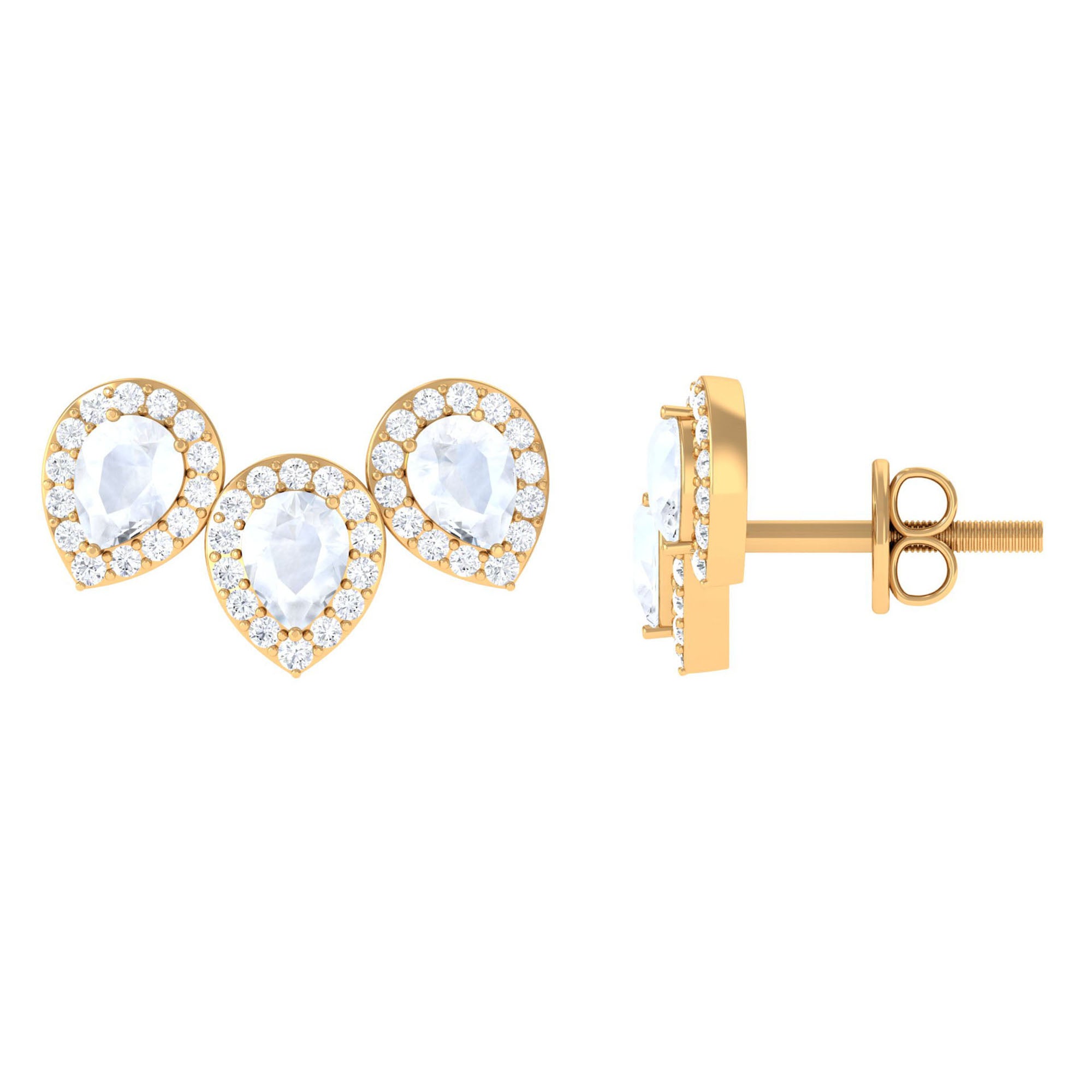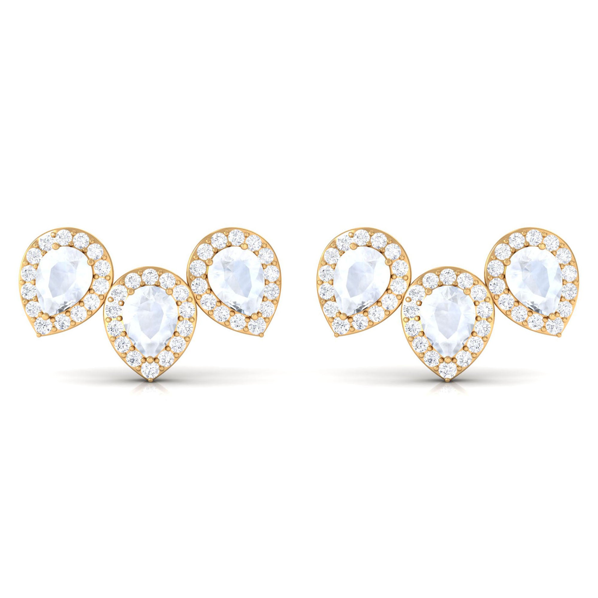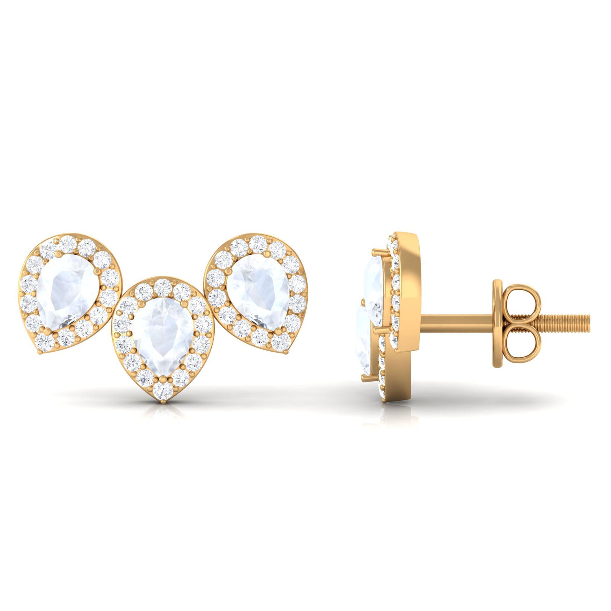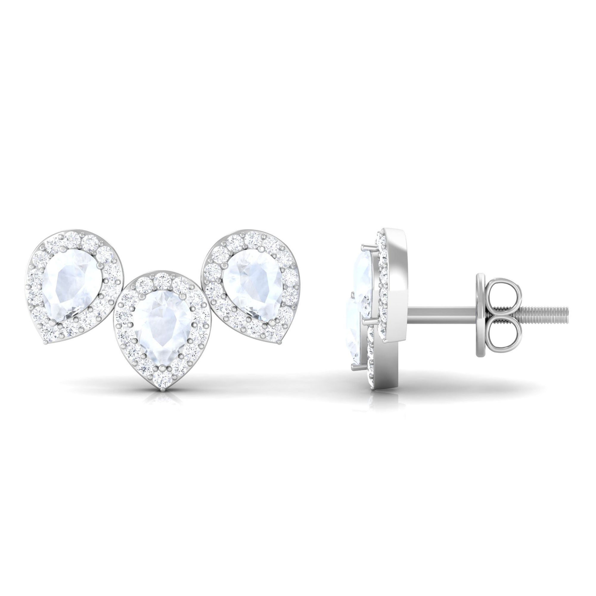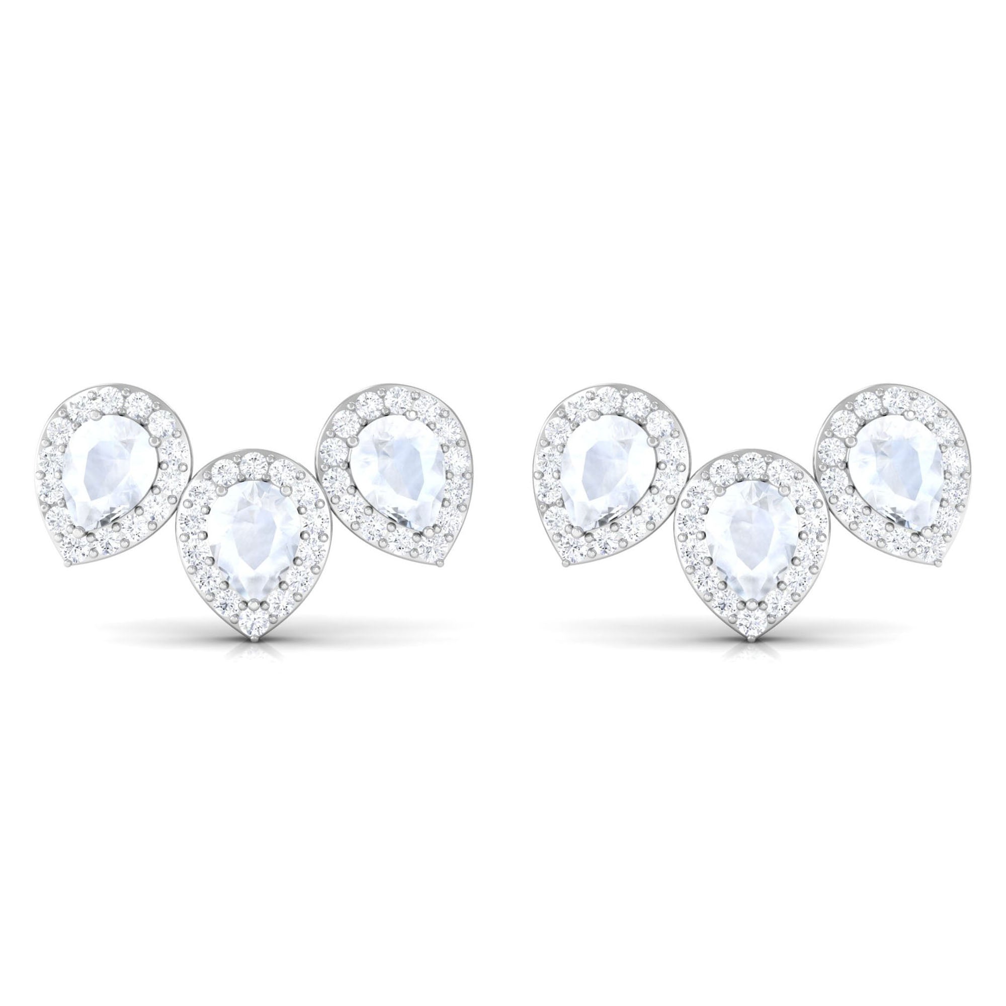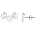 Pear Shape Moonstone Three Stone Bridal Stud Earrings with Diamond Halo