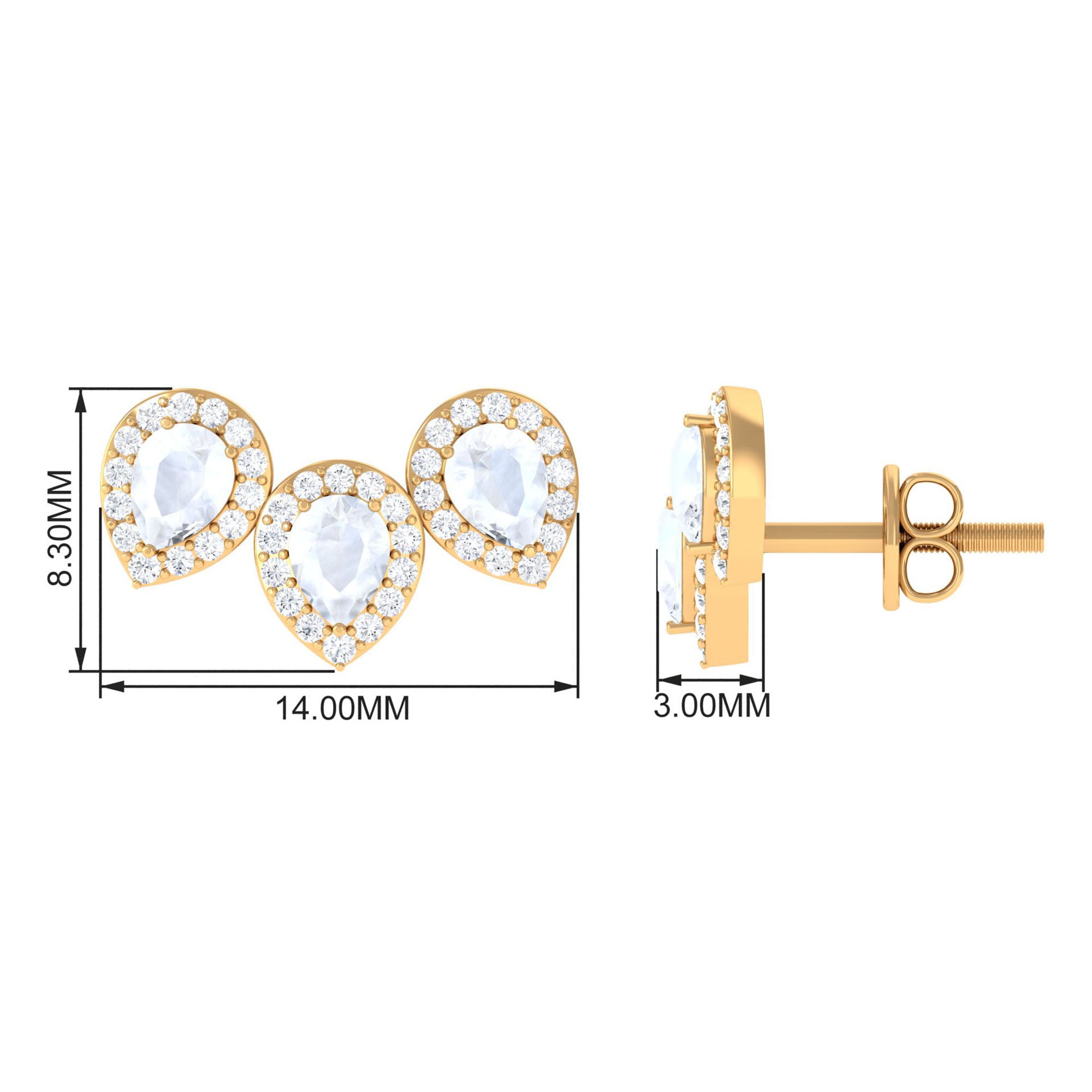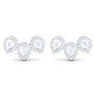Indulge in timeless elegance with these Moonstone Stud Earrings. They feature three Pear Shape Moonstones set securely in a Prong Setting, each surrounded by Diamond Halo. These Bridal Earrings offer a trendy and stylish choice for various occasions. Seal your promise to your beloved with the beauty of Moonstone and Diamond in these Three Stone Earrings.