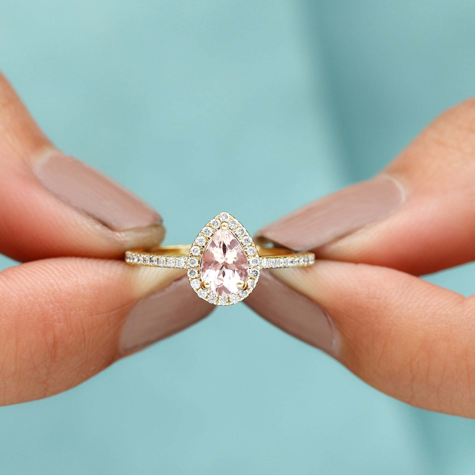 Embrace timeless beauty with this Engagement Ring, a symbol of love, passion, and your unique style. Embellished with Pear-Shaped Morganite elegantly set in the center surrounded by a halo of Diamonds. Additional Diamond adorned on the shank adds an extra touch of elegance and sophistication. The fascinating hue of this Morganite Ring makes this piece an absolute beauty. With AAA Quality Morganite, the Teardrop Ring ensures incredible durability and unmatchable brilliance. Get this Halo Ring for the love of your life and make every moment unforgettable with her.