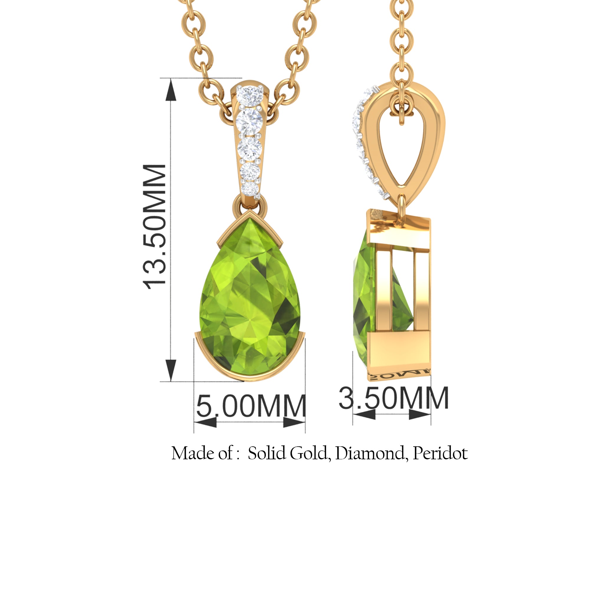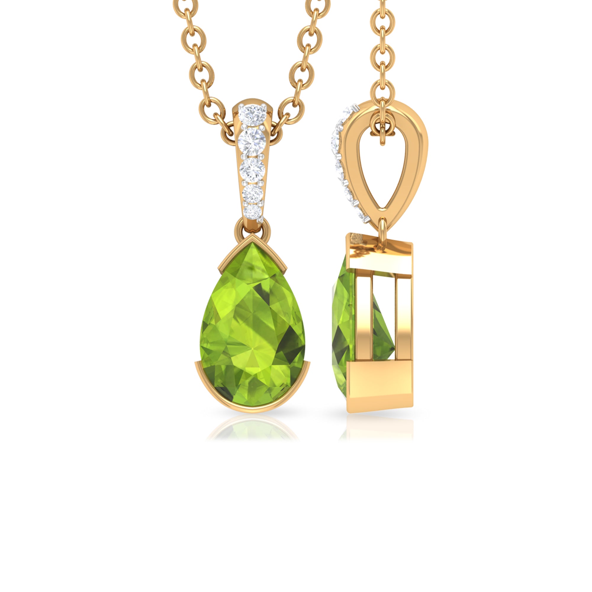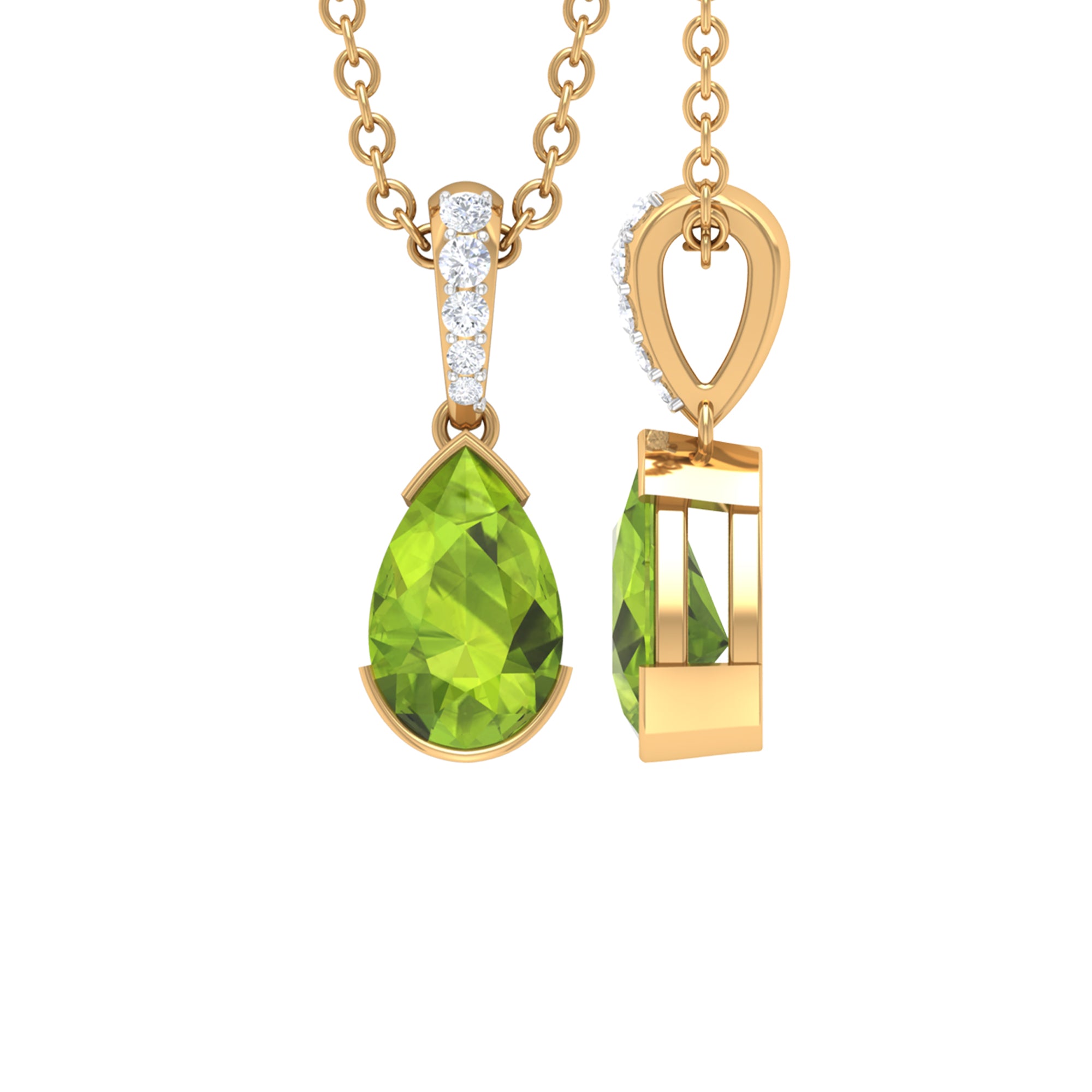 Glam up your outfit with this elegantly beautiful Solitaire Pendant which is beautified with Pear Cut Peridot Gemstone set as a Solitaire in Half Bezel Setting with Diamond Accent Bail