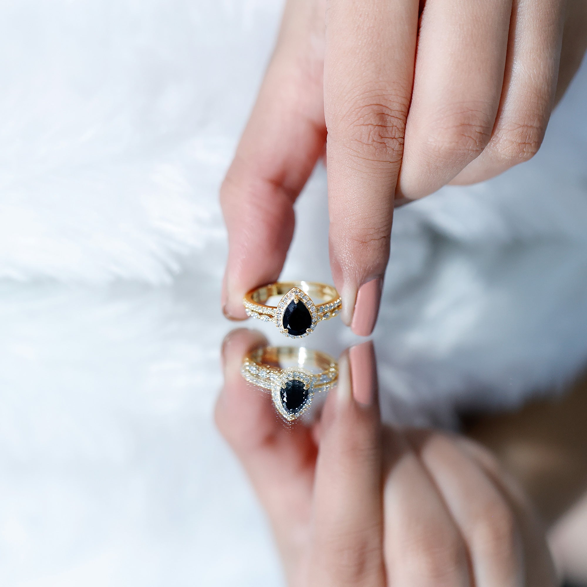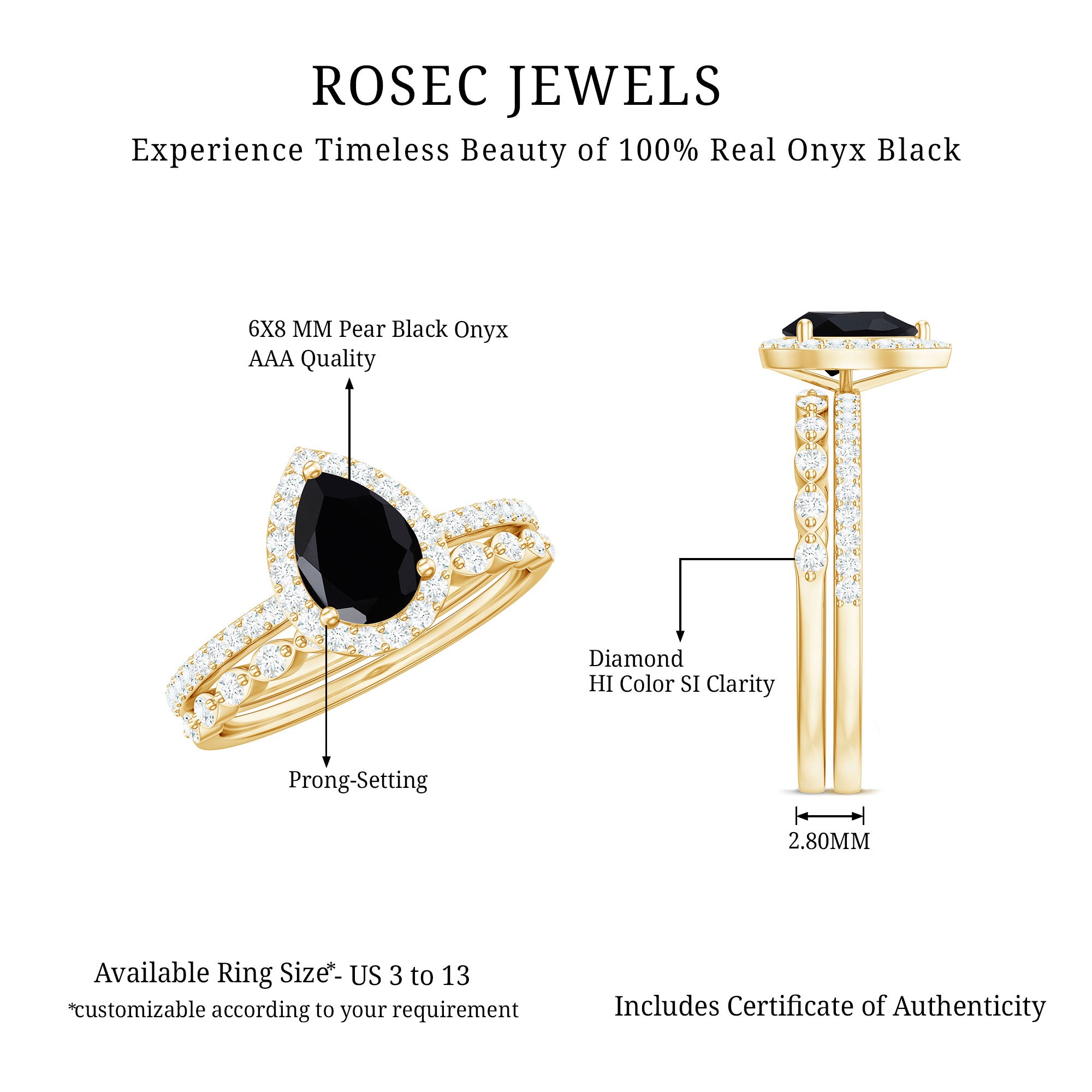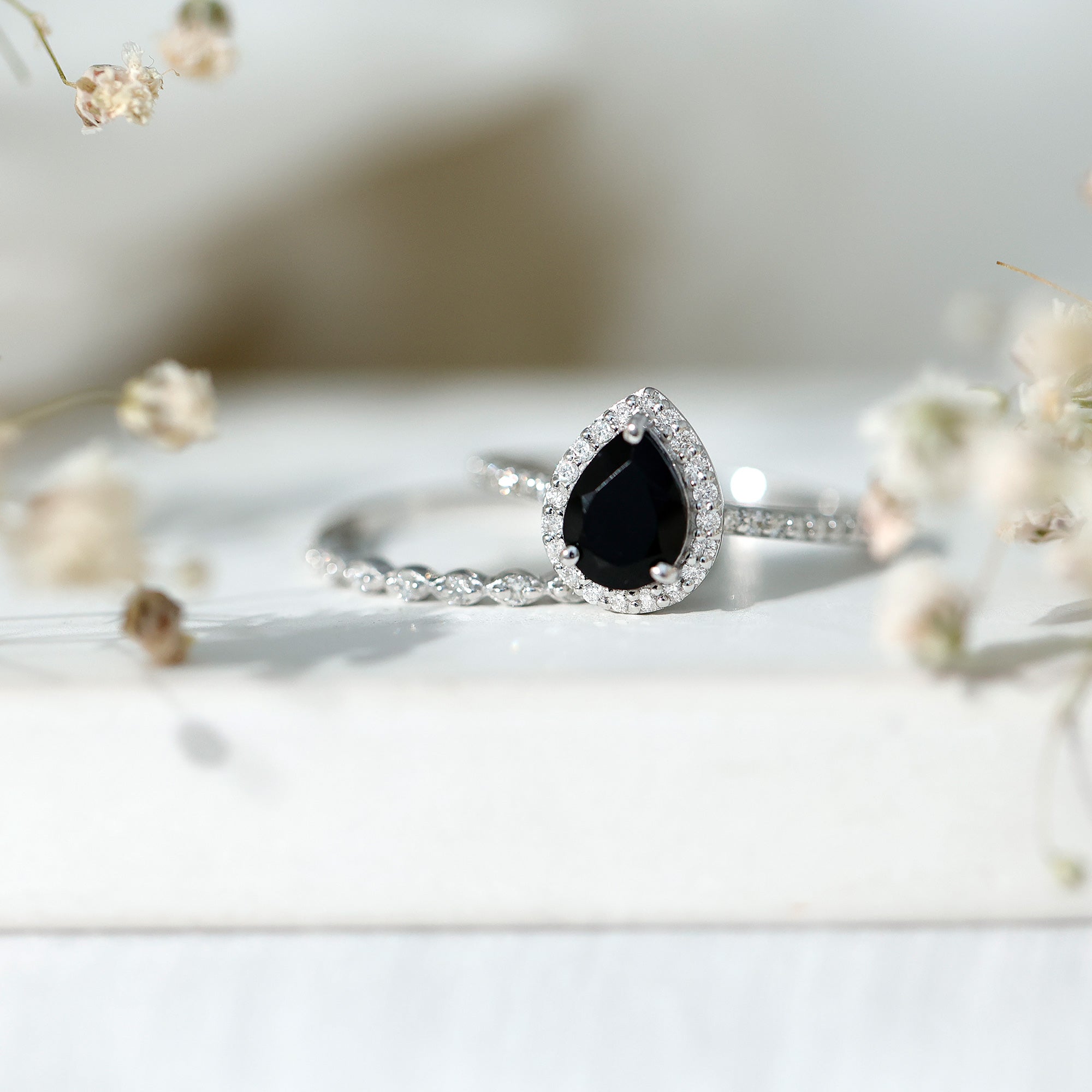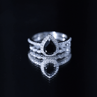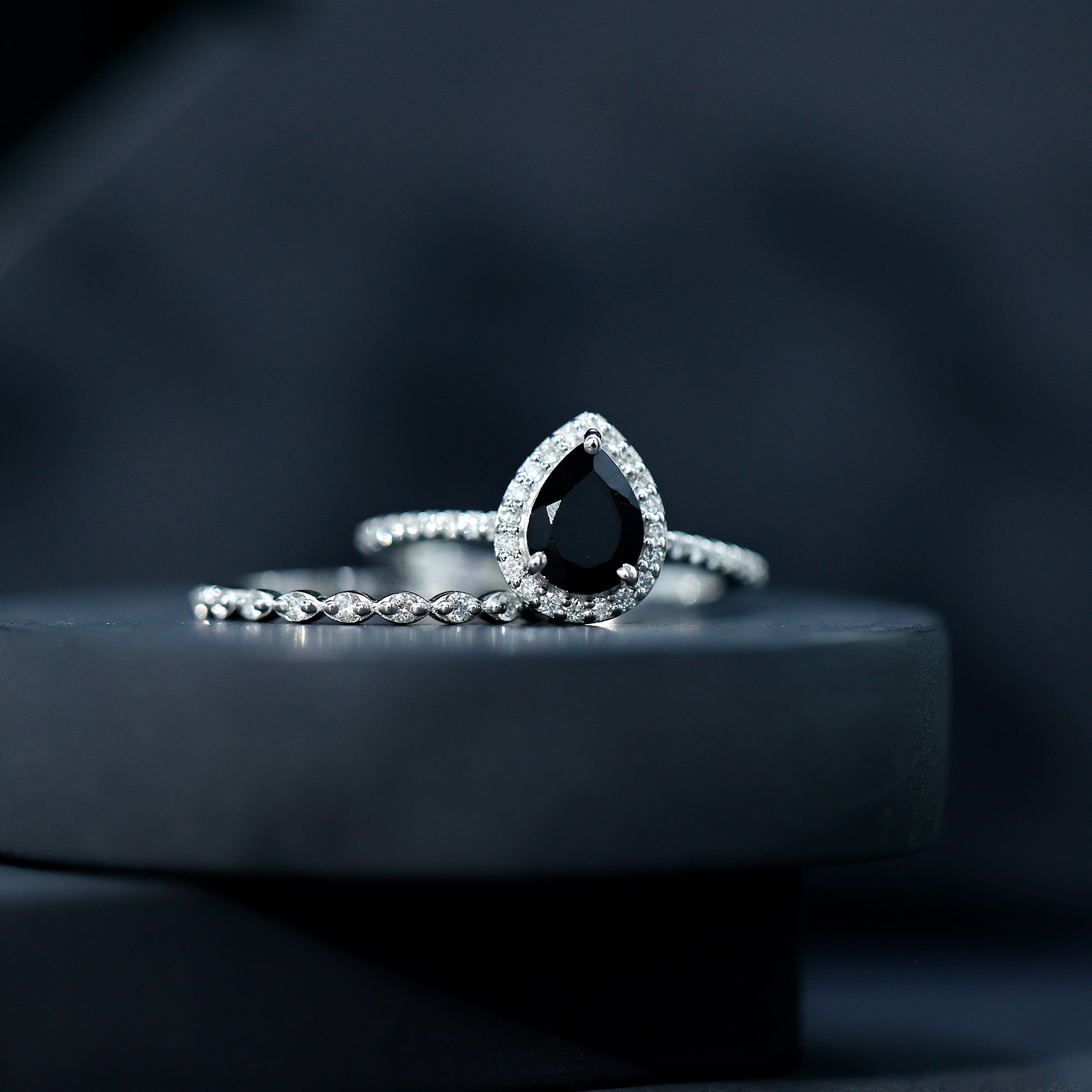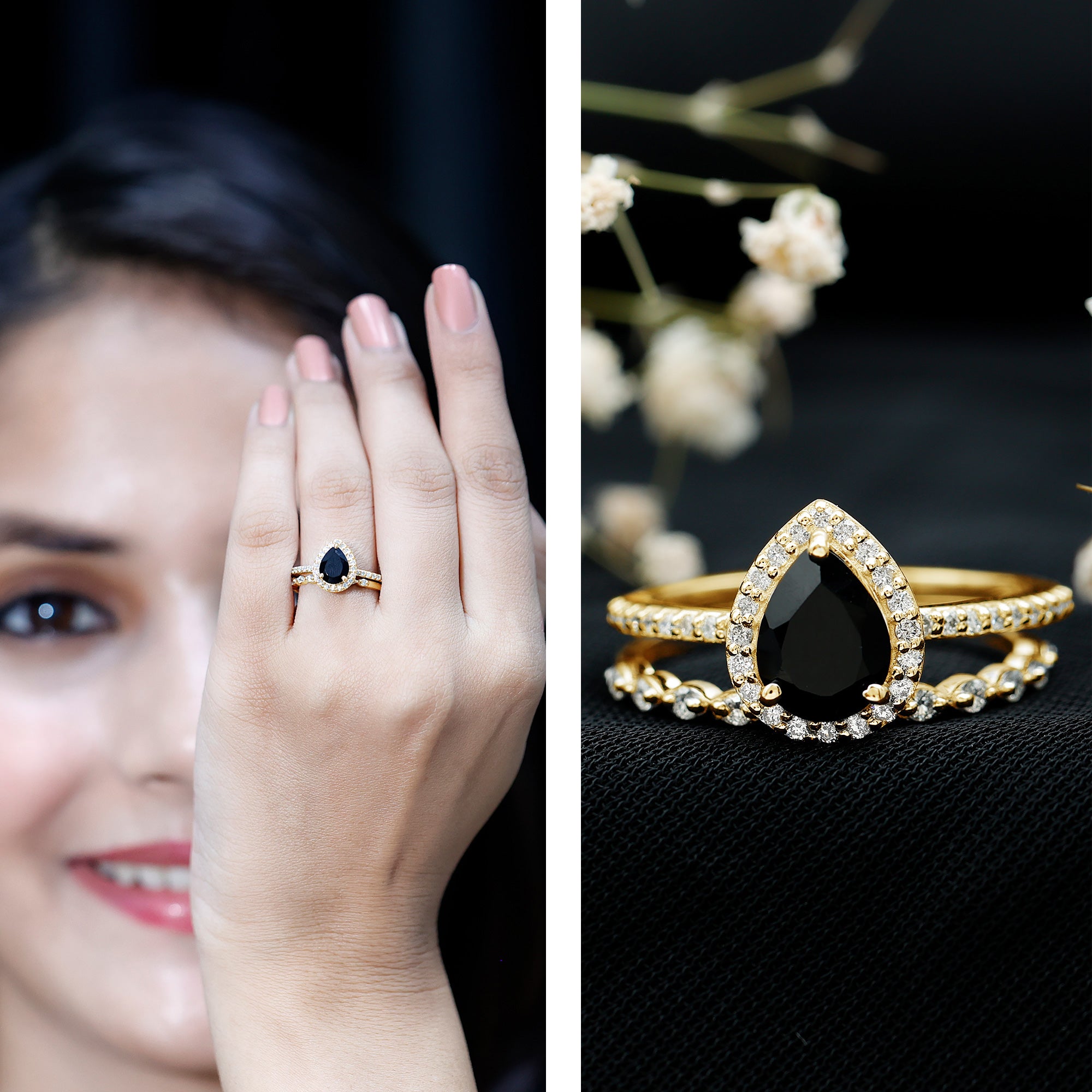 When love calls for something truly unique, this Black Onyx Bridal Ring Set answers with style and soul. Made for the bride who leans into bold choices and timeless details, it is the kind of set that feels both deeply personal and effortlessly elegant. The engagement ring is centered around a captivating 6X8 MM pear shaped black onyx, while a sparkling halo of round diamonds wraps around the center stone, and more diamonds trail along the band, adding a soft glimmer to every gesture. The matching wedding band is designed enough to add a whole new look to this Teardrop Wedding Set. Tiny round diamonds sit within marquise shaped details, creating a delicate, vintage inspired pattern that adds charm without overwhelming the look. Together, the rings strike a beautiful balance, bold, feminine, and full of meaning. Whether you are planning a proposal or simply looking for rings that reflect your individual style, this Black Onyx and Diamond Wedding Ring Set was made for moments that matter. Crafted with care and offered in US sizes 3 to 13, it is designed for a perfect fit and lasting comfort. Packaged in an elegant jewelry box and ready for your big moment, this Pear Shaped Wedding Ring Set is about the story you are building together.