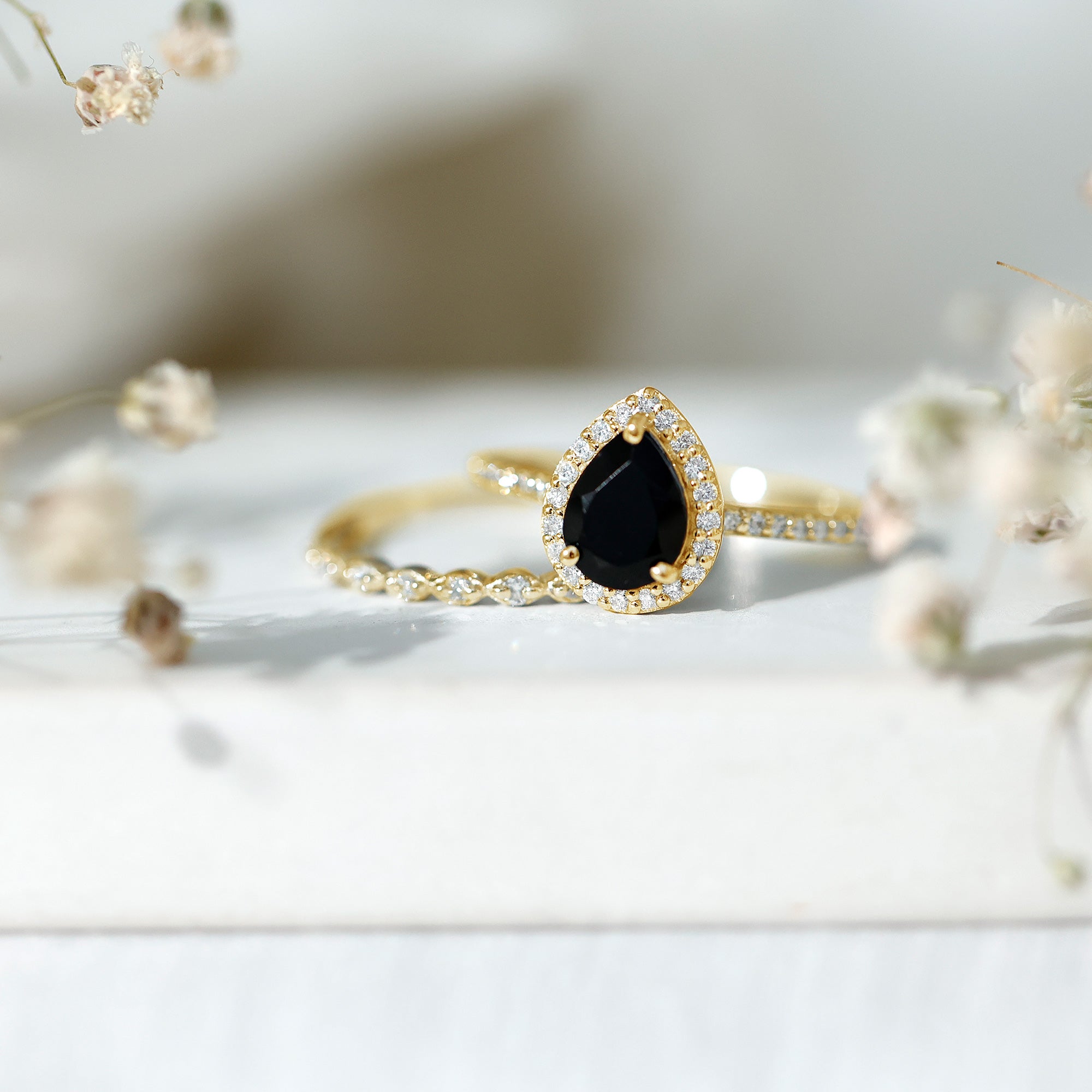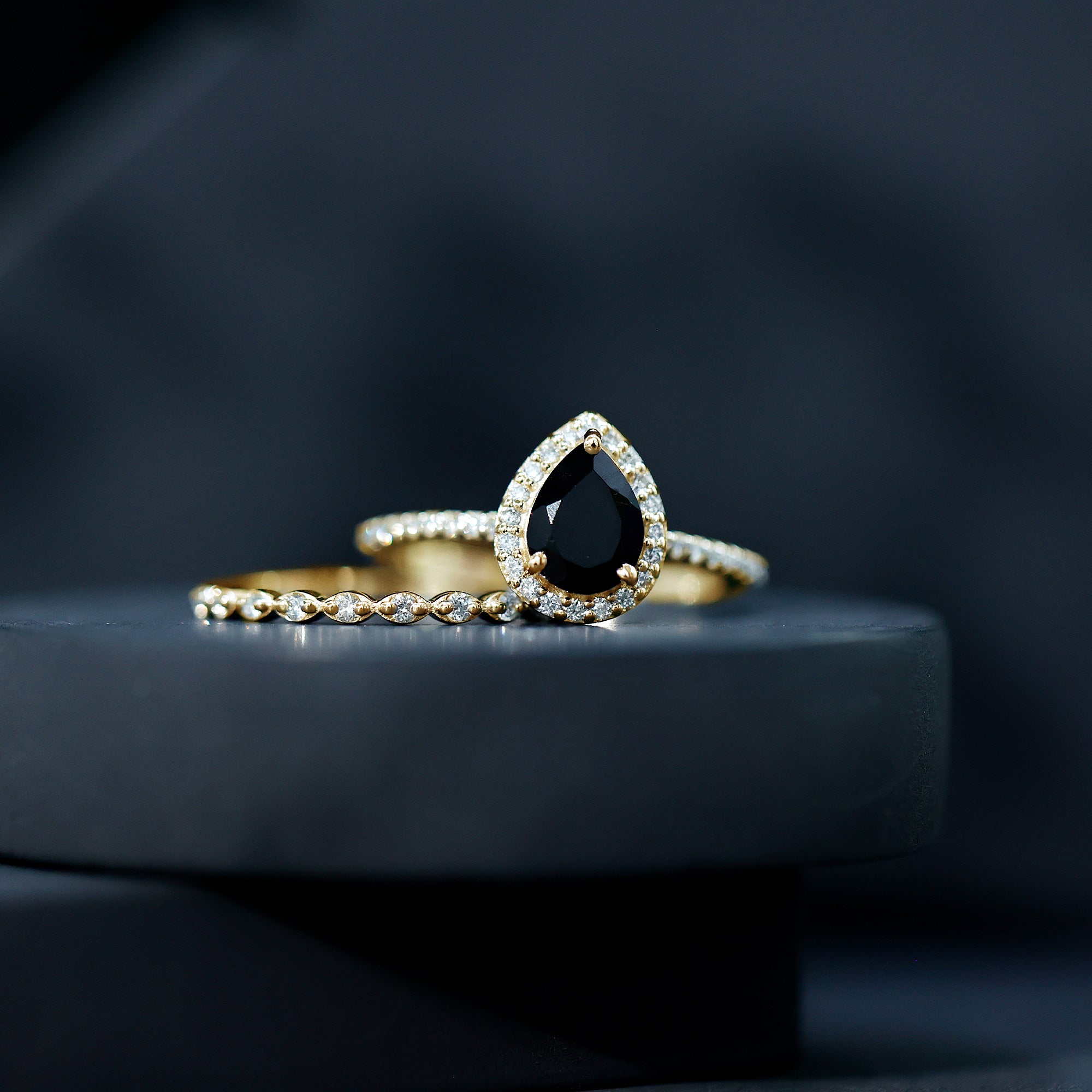 Pear Shaped Black Onyx and Diamond Halo Bridal Ring Set With Certificate