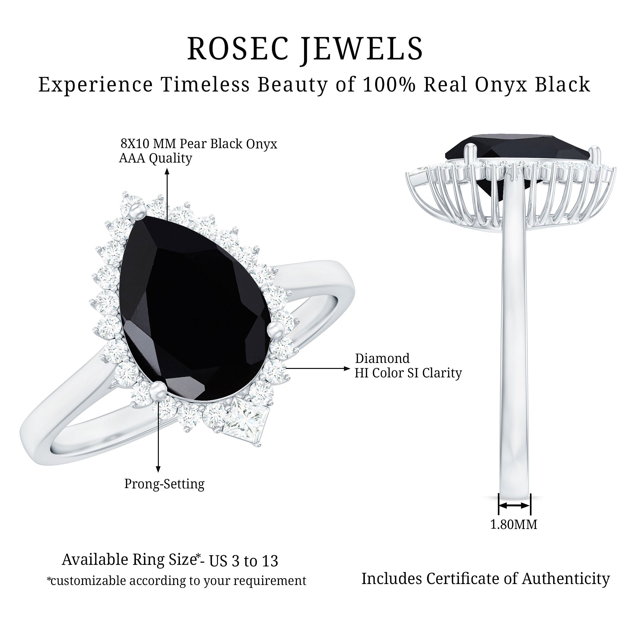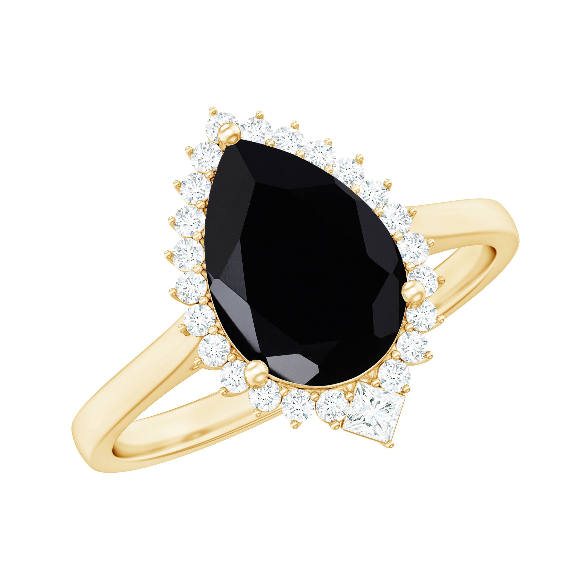 Stand out with a ring that brings together drama, elegance, and thoughtful design. This stunning Cocktail Ring centers around a striking 8X10 MM pear shaped black onyx of AAA quality. Surrounding the onyx is a shimmering halo of round cut diamonds, carefully set to add just the right amount of brilliance. Each gem is securely held in prong setting, allowing the design to stay elegant yet durable. Adding an extra detail of charm, a princess cut diamond sits at the base of the halo, giving a subtle nod to classic design while blending seamlessly into the modern silhouette. This thoughtful touch brings a traditional element to the Onyx and Diamond Engagement Ring, perfect for those who appreciate both vintage inspiration and contemporary flair. The band is simple and sleek, allowing the eye to focus on the rich detailing of the setting. This balance between elegance and bold design ensures the Huge Engagement Ring is perfect for both daytime wear and cocktail evening wear. Crafted with care and available in a range of sizes, it is a piece that fits comfortably while making a strong impression. Whether gifted or chosen for yourself, this Teardrop Engagement Ring captures attention and speaks of style, grace, and individuality.