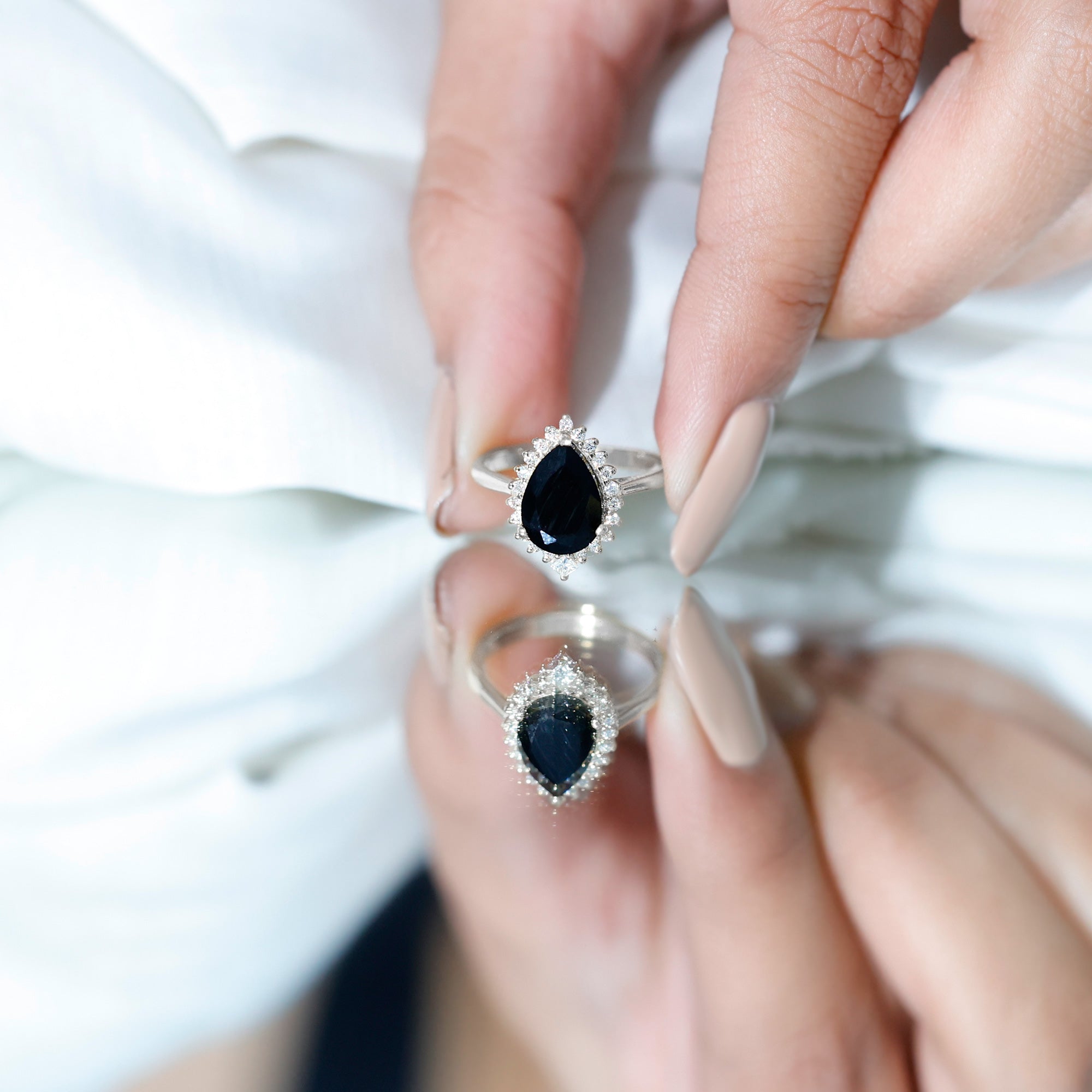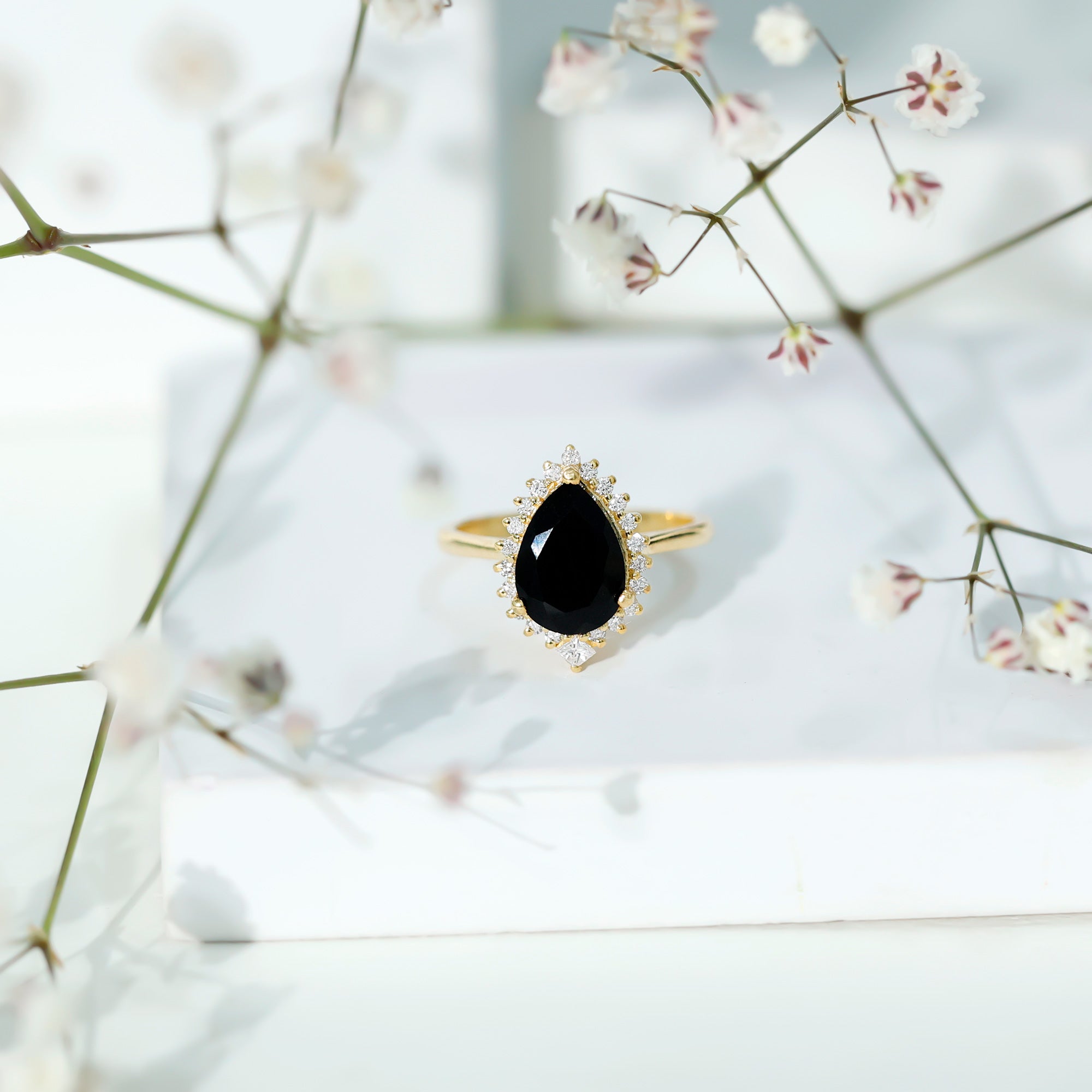 Pear Shaped Black Onyx Big Engagement Ring with Diamond Halo