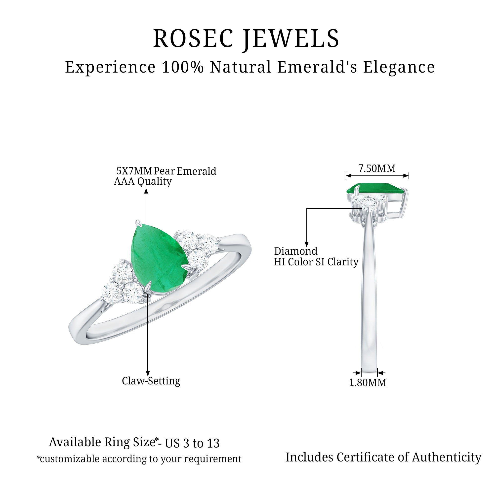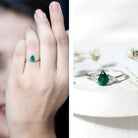 Celebrate love with a dazzling Emerald Engagement Ring – the perfect symbol of forever. Make your proposal unforgettable with this mesmerizing pear shaped engagement ring, a stunning representation of timeless elegance and emotional depth. The ring features a captivating 5X7 mm AAA quality emerald at its heart, radiating rich green brilliance, flanked by shimmering HI-SI quality round diamonds on either side, totaling a precise 0.948 carat weight. Designed in a secure claw setting, this minimal engagement ring reflects sophistication and simplicity in perfect harmony, making it an ideal token for life’s most meaningful promise. Crafted for modern romantics, this emerald and diamond engagement ring embodies purity, passion, and individuality, suited for those seeking a classic yet fresh expression of their journey. The teardrop-shaped emerald lends the piece a graceful and organic silhouette, beautifully blending into the designs subtle sparkle, making it an exquisite green emerald ring for any bride-to-be. Whether you see it as a pear cut engagement ring or a womens ring emerald, its delicate style and luxurious feel mark it as a piece to treasure for a lifetime. Perfect for engagements, this emerald diamond ring isnt just a piece of jewelry — its a heartfelt story, a memory frozen in time, and a symbol of commitment that transcends trends. An iconic trio engagement ring like this makes an unforgettable impression and is sure to be cherished as an heirloom for generations.